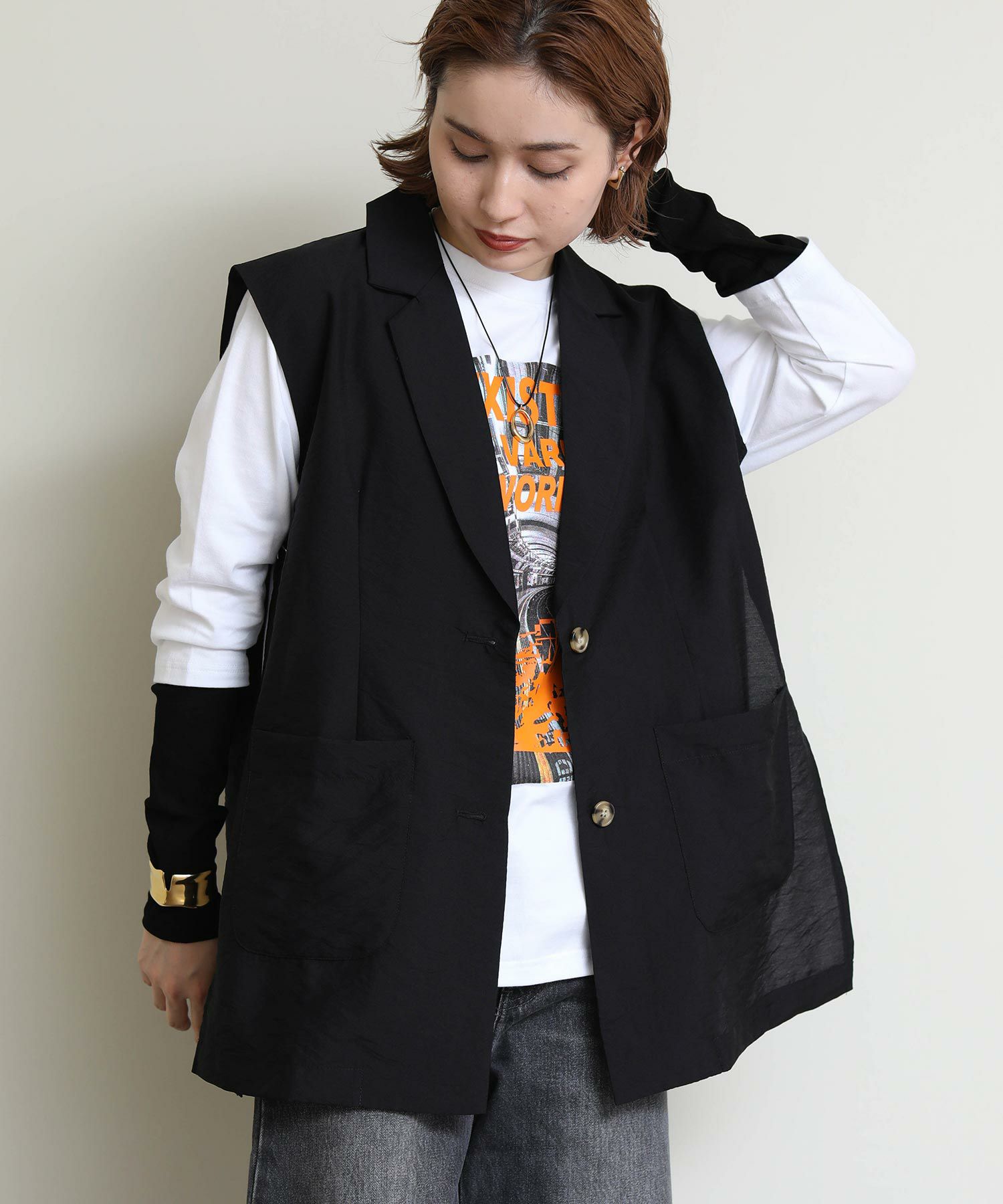 シンプルなインナーやカットソーの上から合わせるだけでワンランク上のスタイリングが完成します。