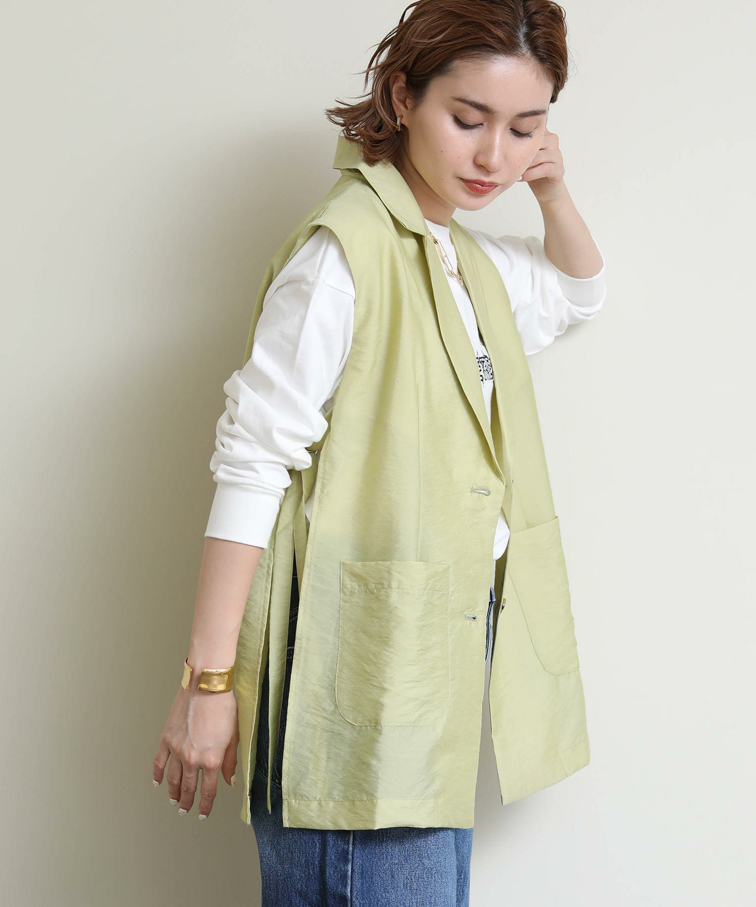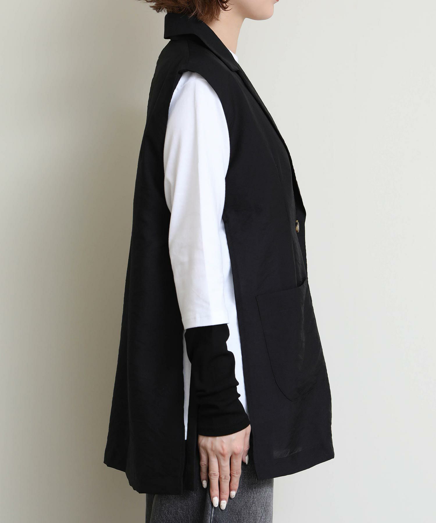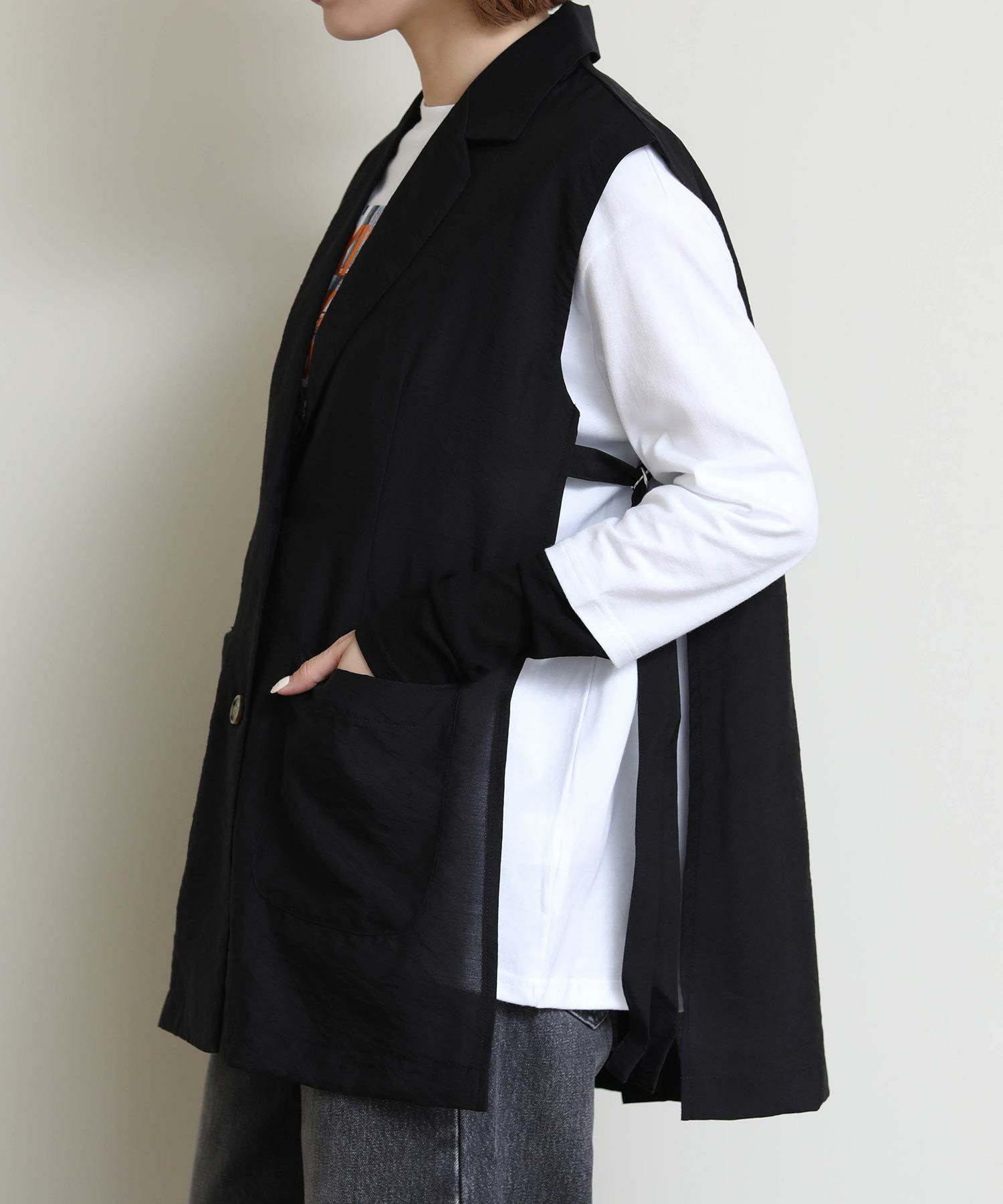 両サイドのバックルがポイントのジレ。