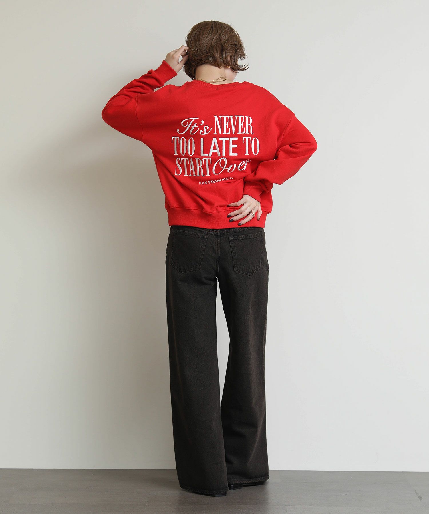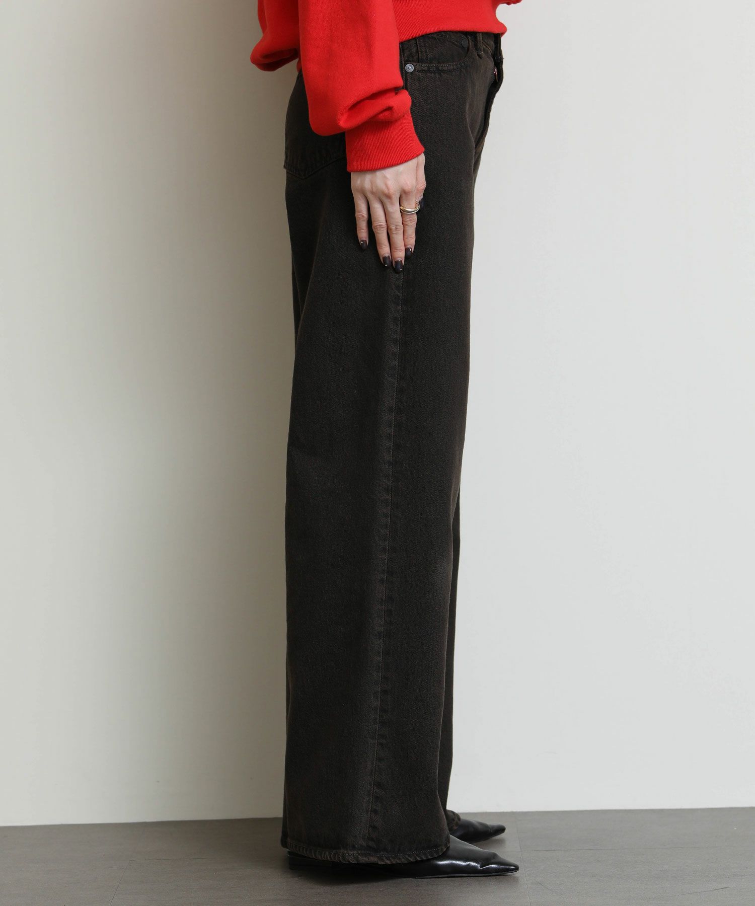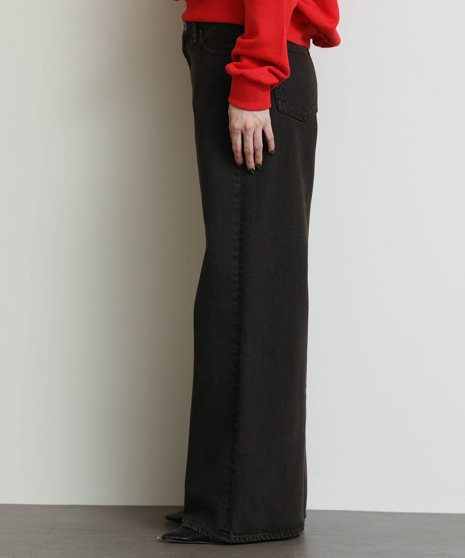 ウエストからヒップにかけてコンパクトな設計になっている為、ワイドながらルーズさはなく上品なシルエットが特徴です。13ozリサイクルブラックデニム使用し、製品染を施した一枚。