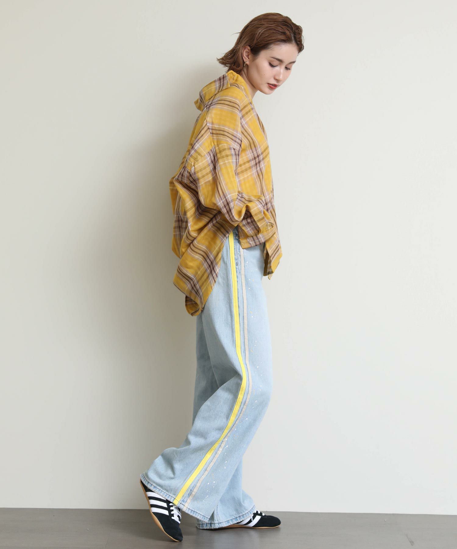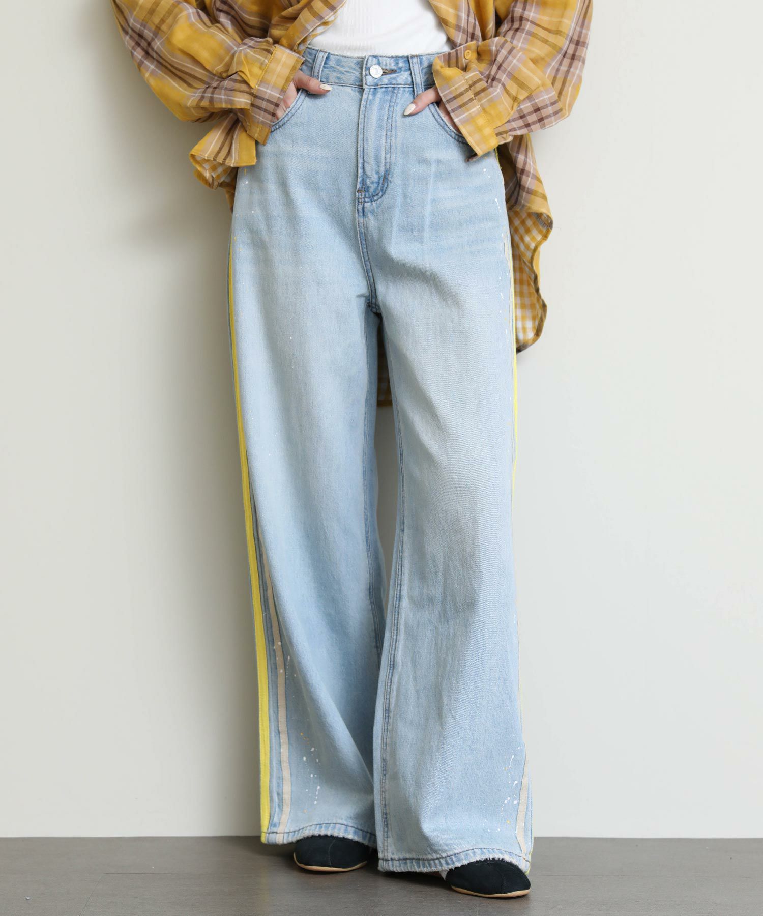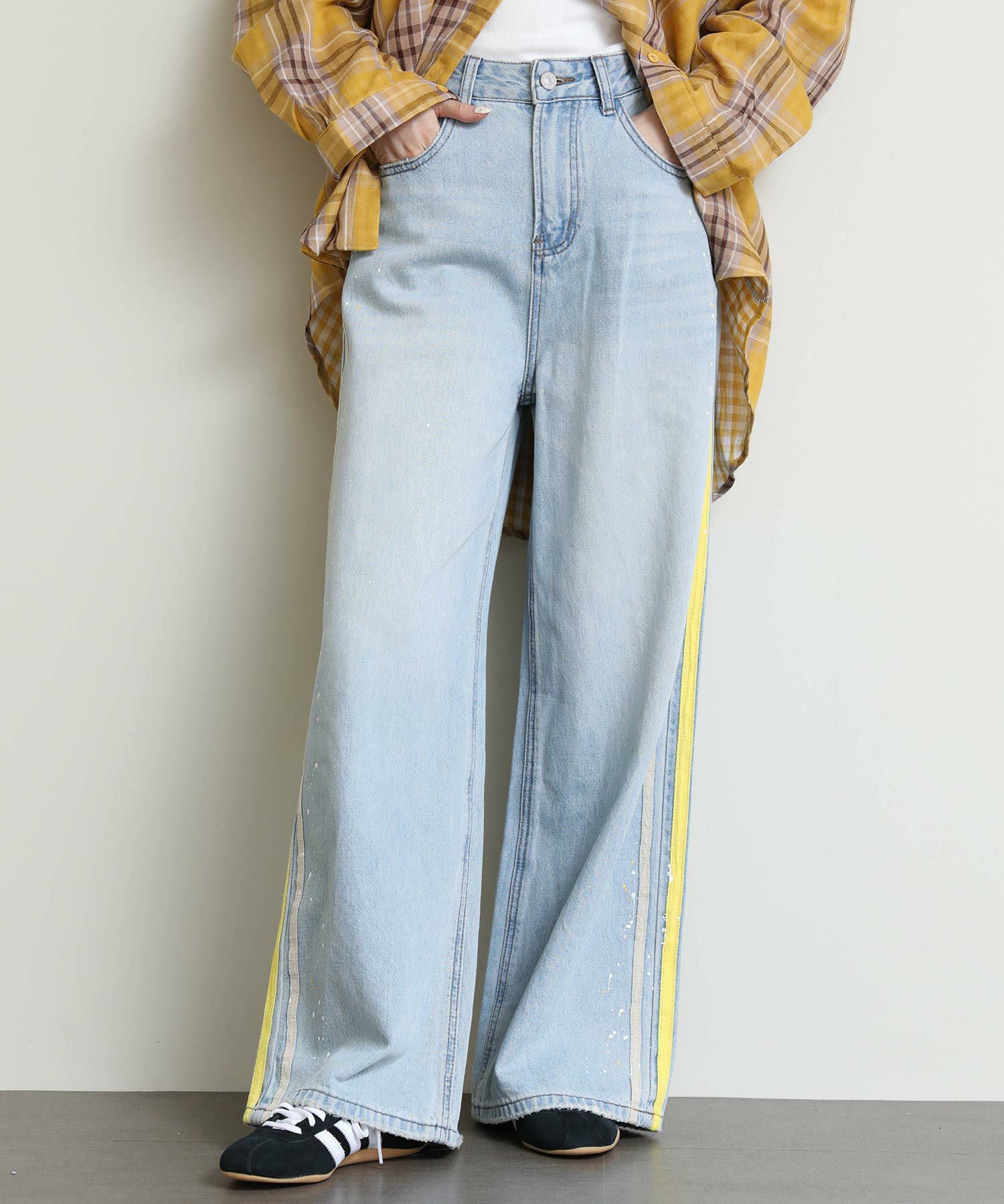 ルーズなシルエットとサイドに入ったイエローのラインがポイントのデニム。
