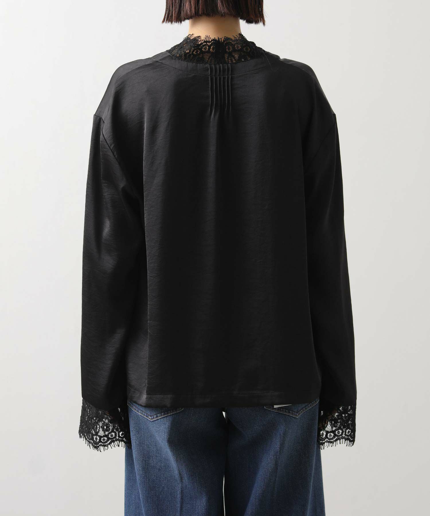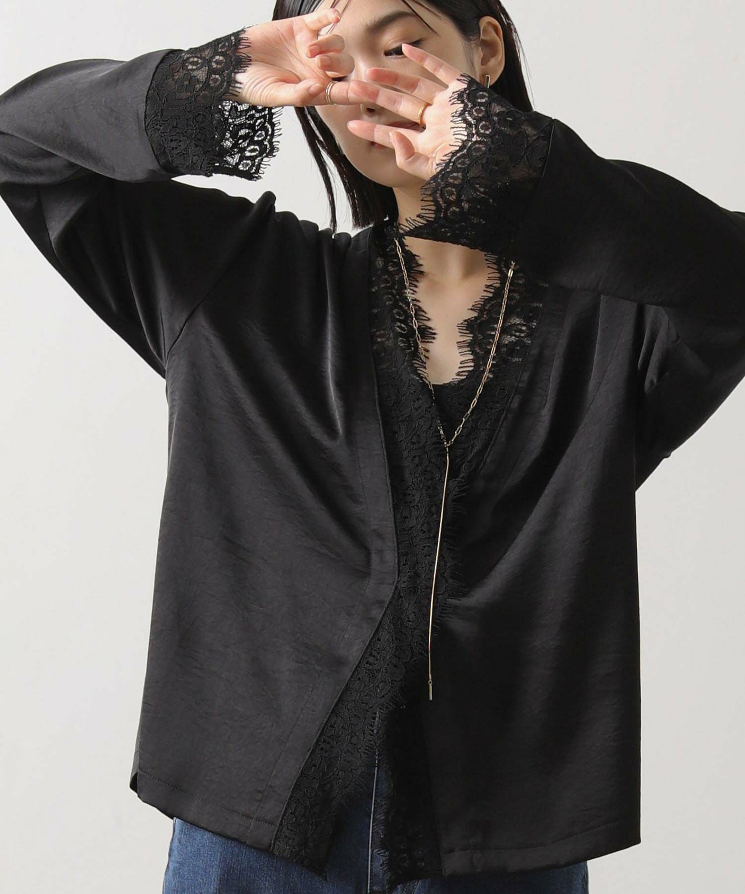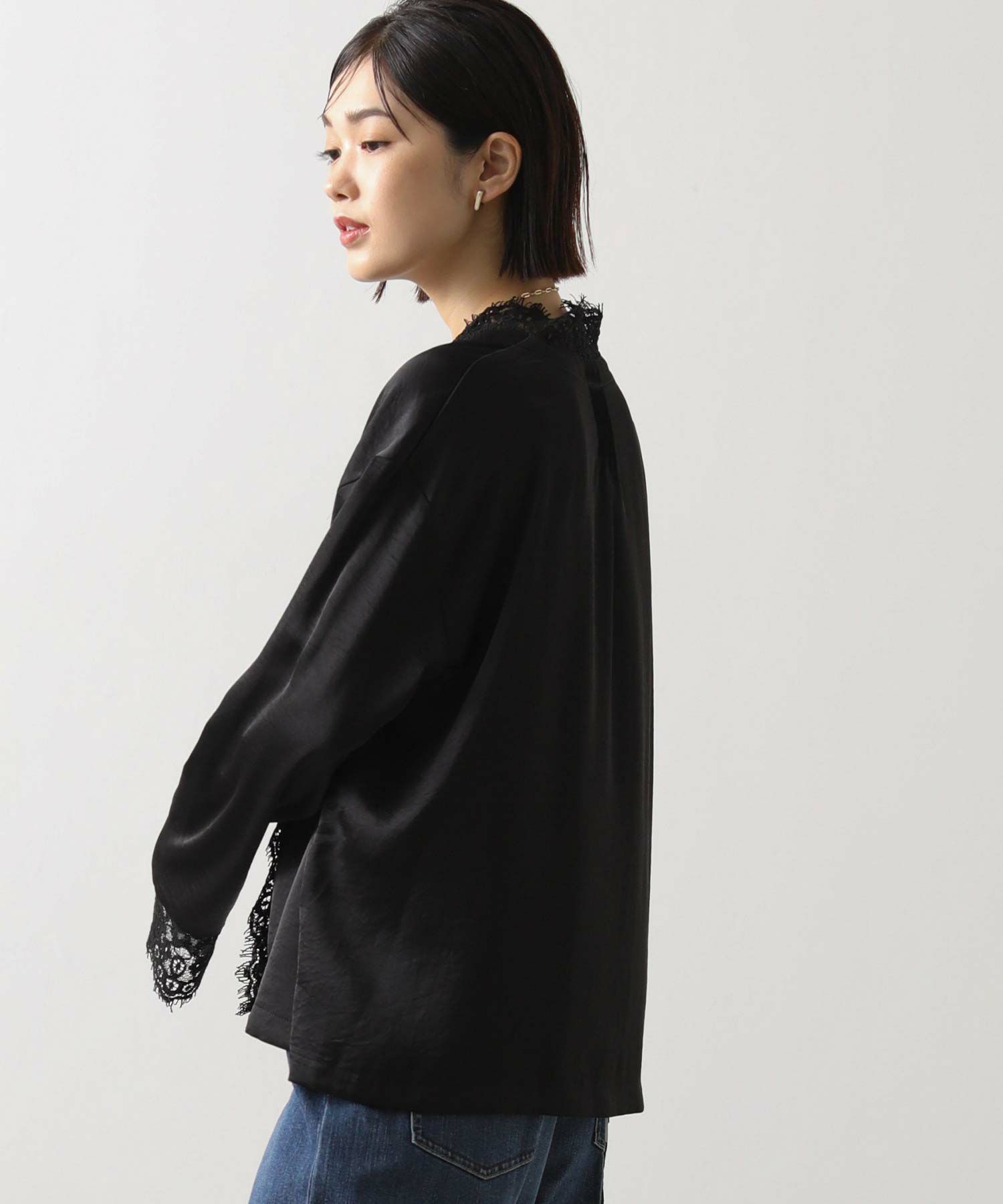シルクのようななめらかな手ざわりと、自然な落ち感が大人っぽいレース使いブラウス。