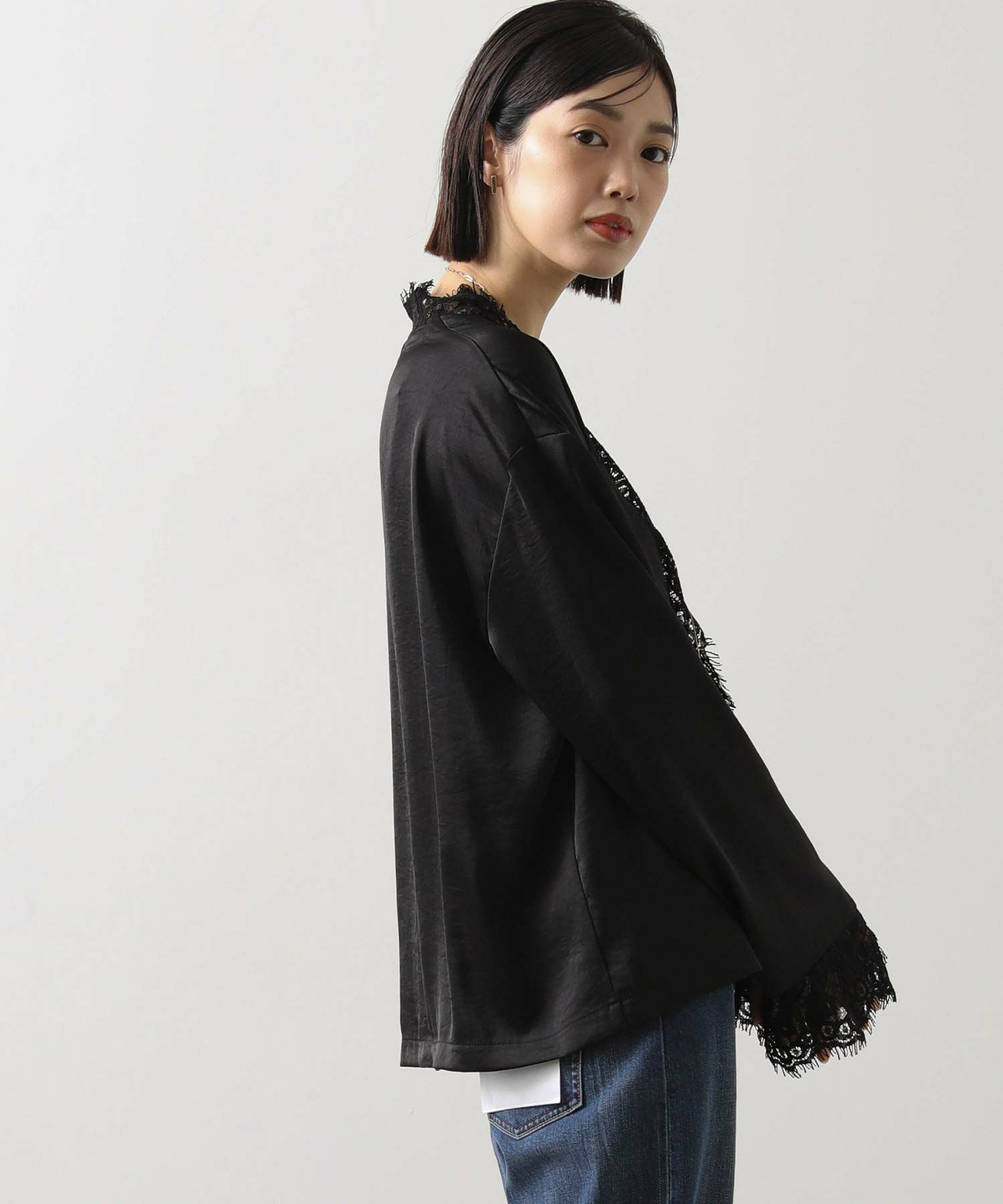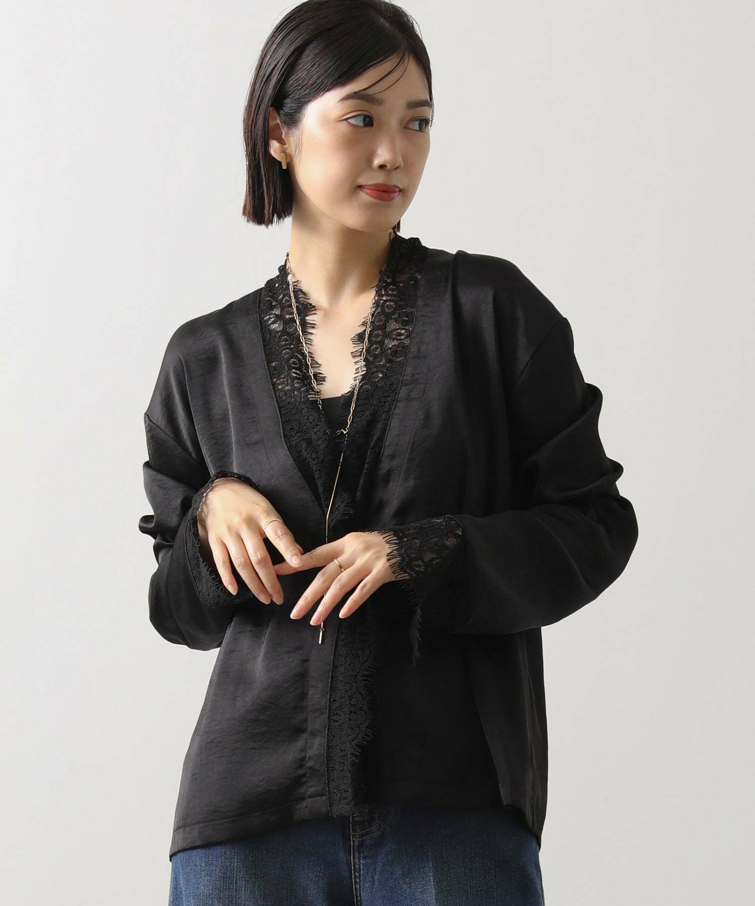 繊細なレースと組み合わせのデザインが今年らしく、カーディガンの様に軽い羽織や、ジャケットのレイヤードのアクセントとしても便利なアイテム。