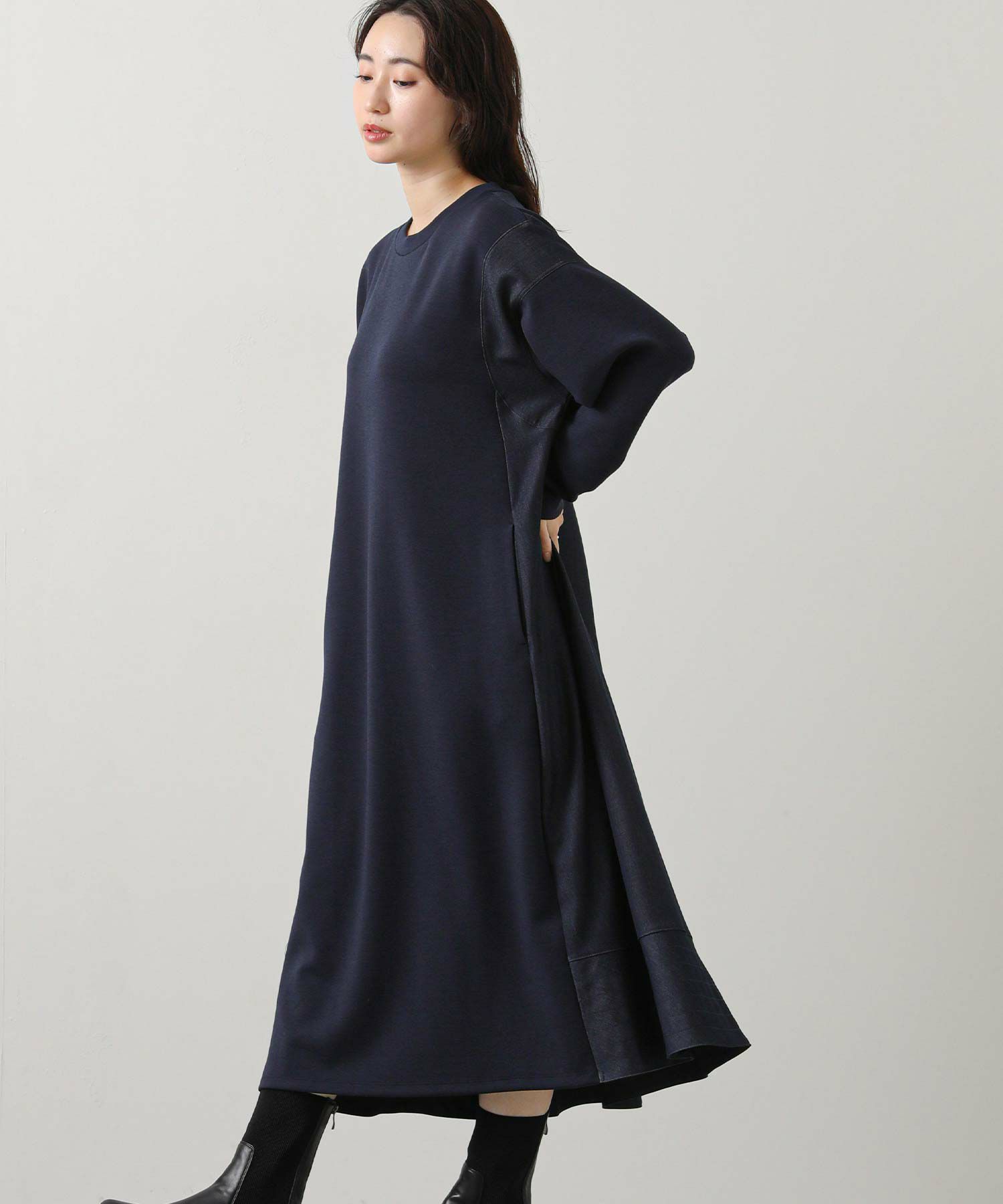 滑らかな素材感のTRデニムとダンボール素材をドッキングしたフレアワンピース。