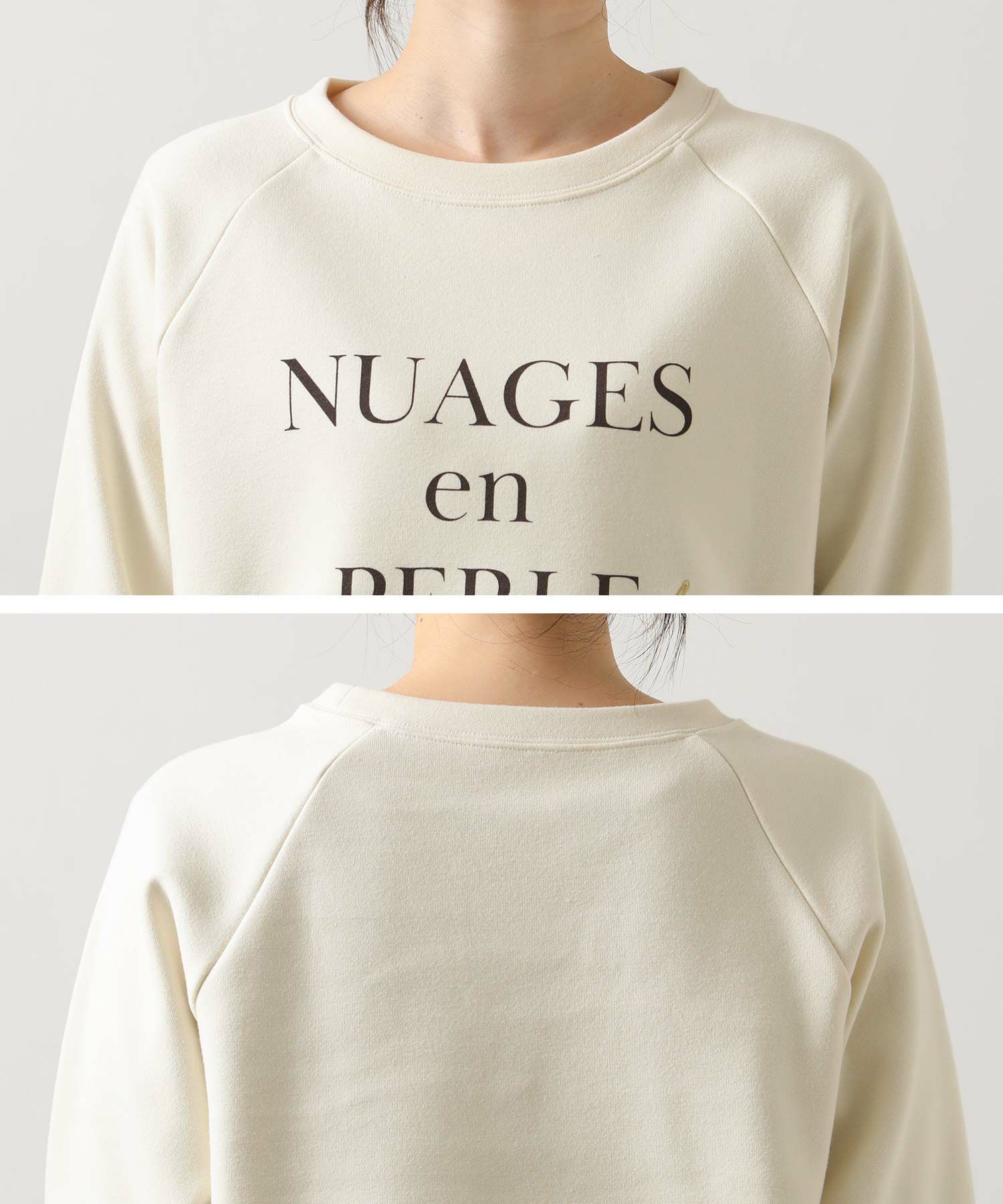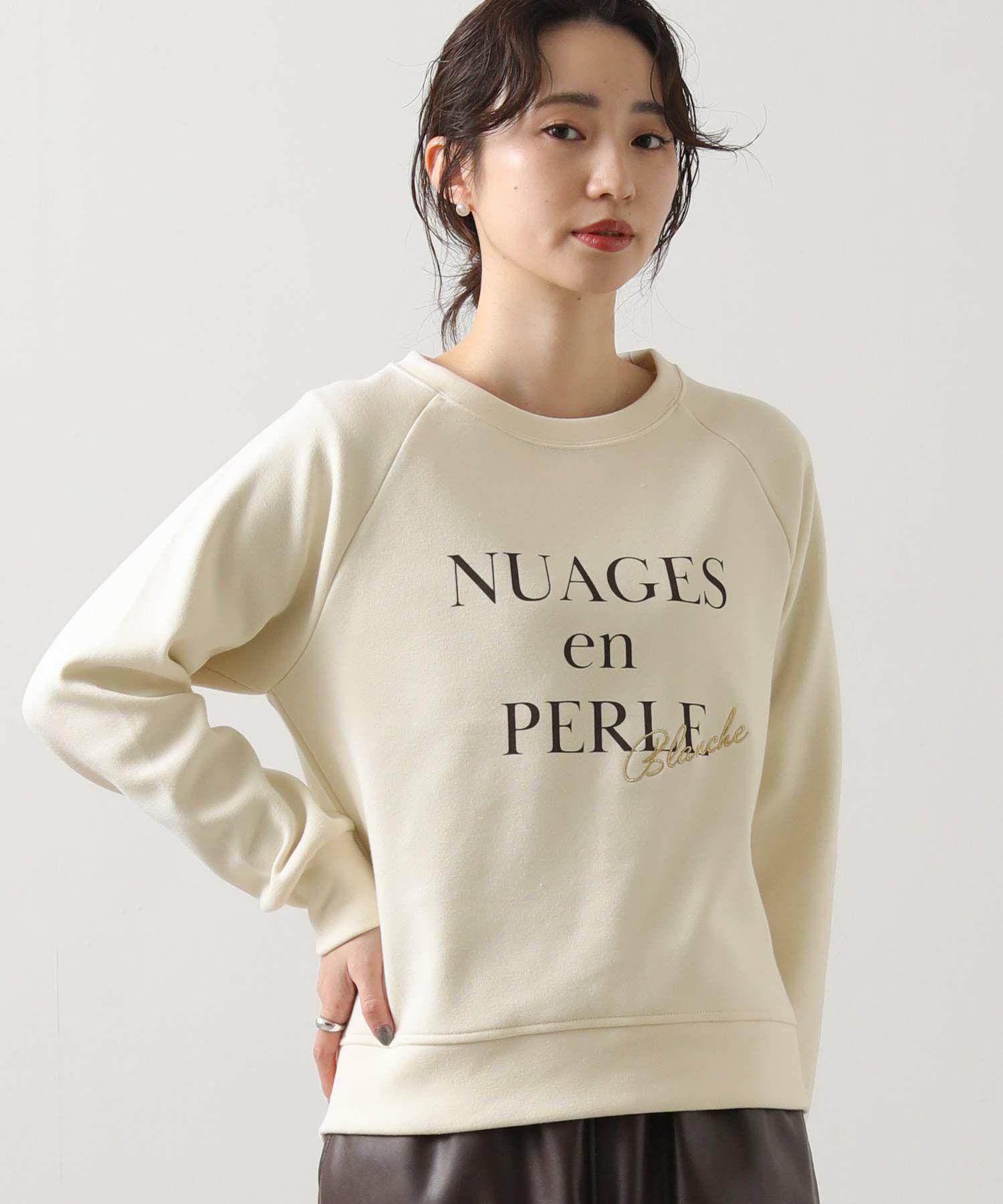 フロントには「NuagesenPerle(Perle(=真珠のような雲」ロゴとフランス語で“白”を意味するフランス語「Blanche」銀糸で刺繍。