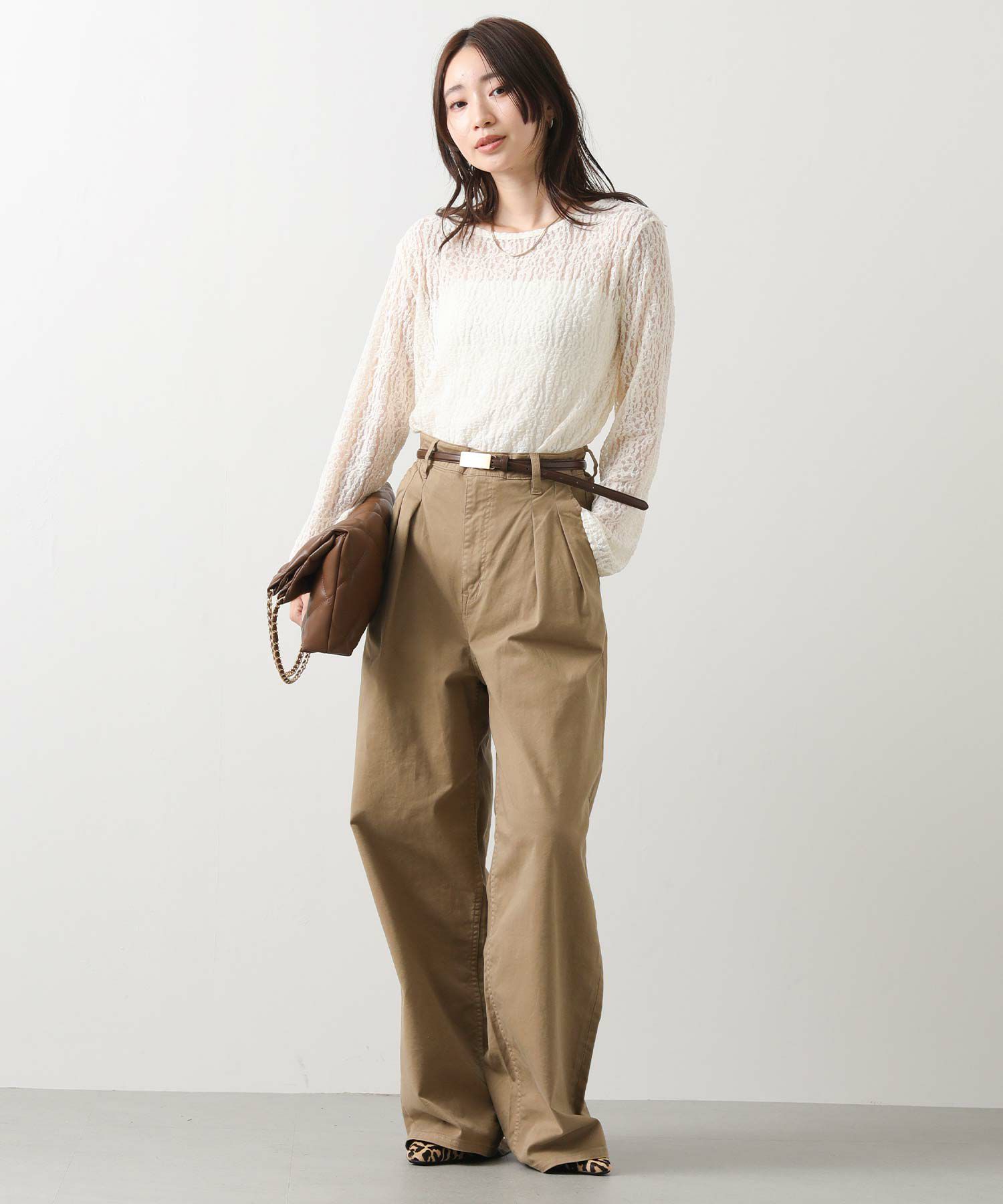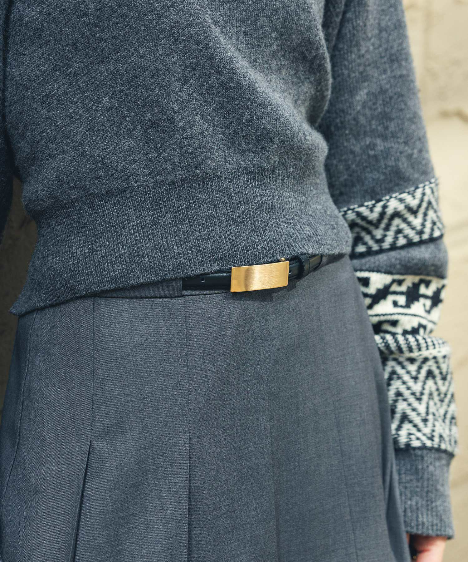 スカートやパンツはもちろん、ワンピースやジレ、ニットカーディガンの上から付けてウエストマークするのもオススメ。