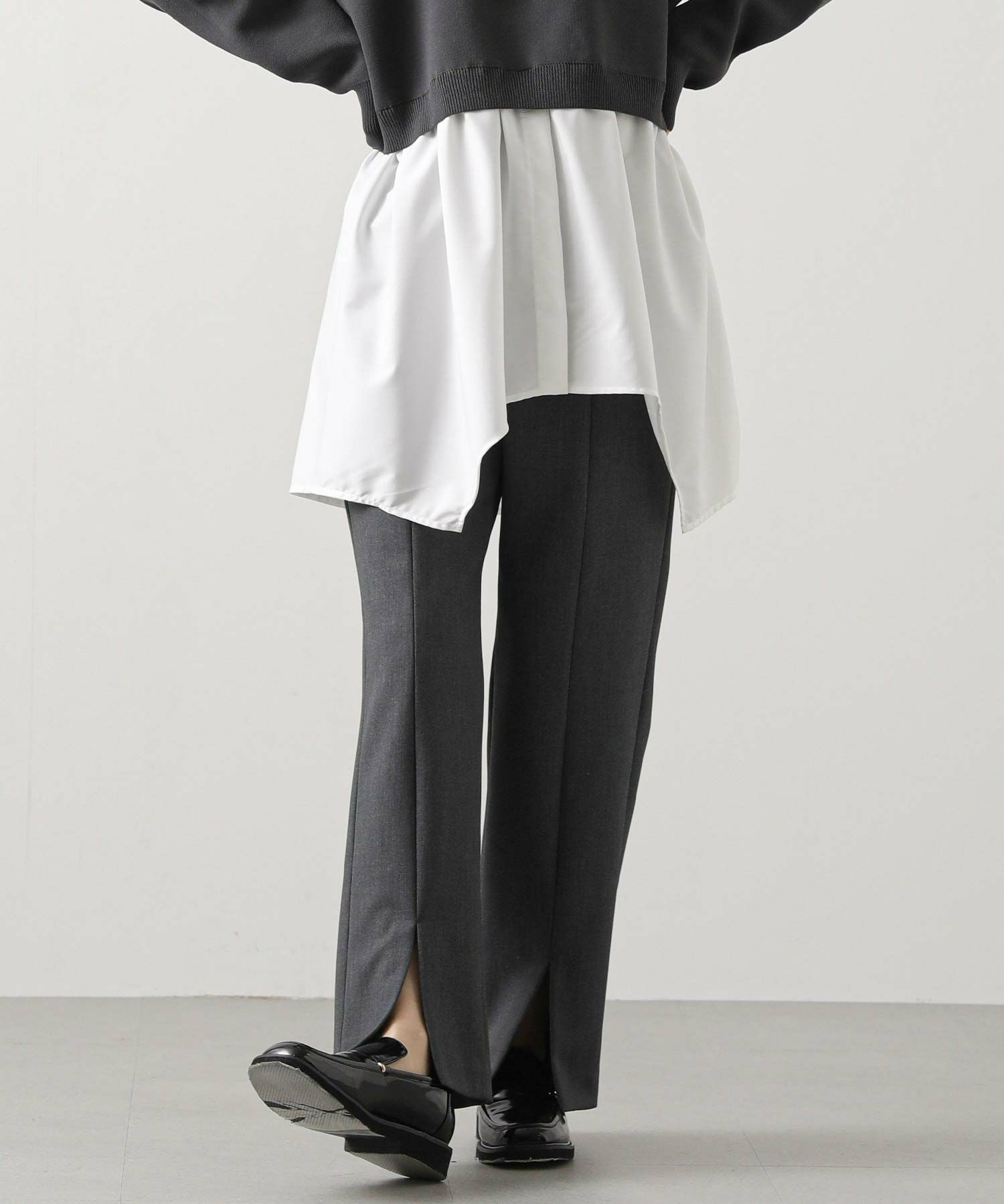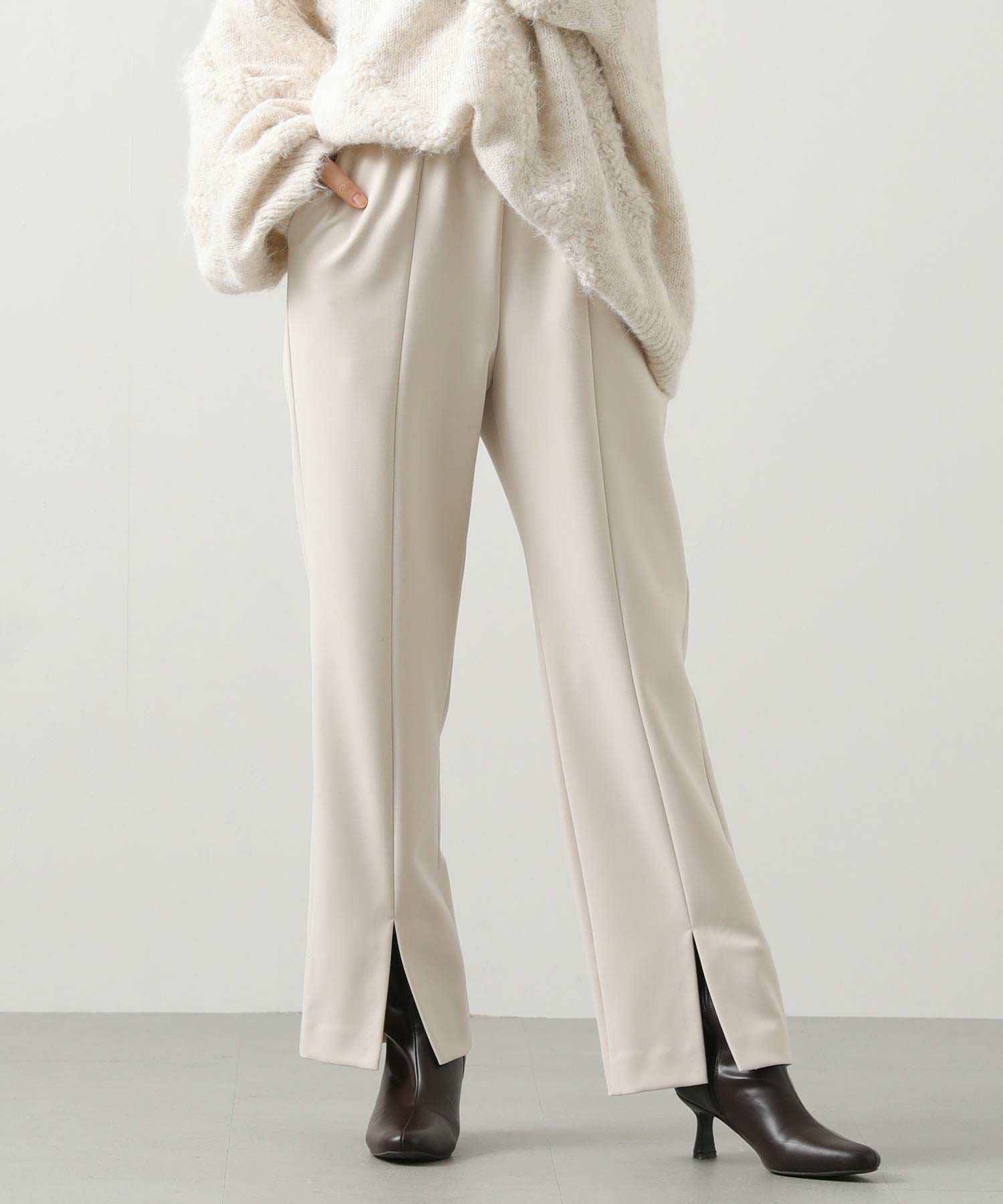 フロントにスリットが入ったスッキリ見えパンツ。