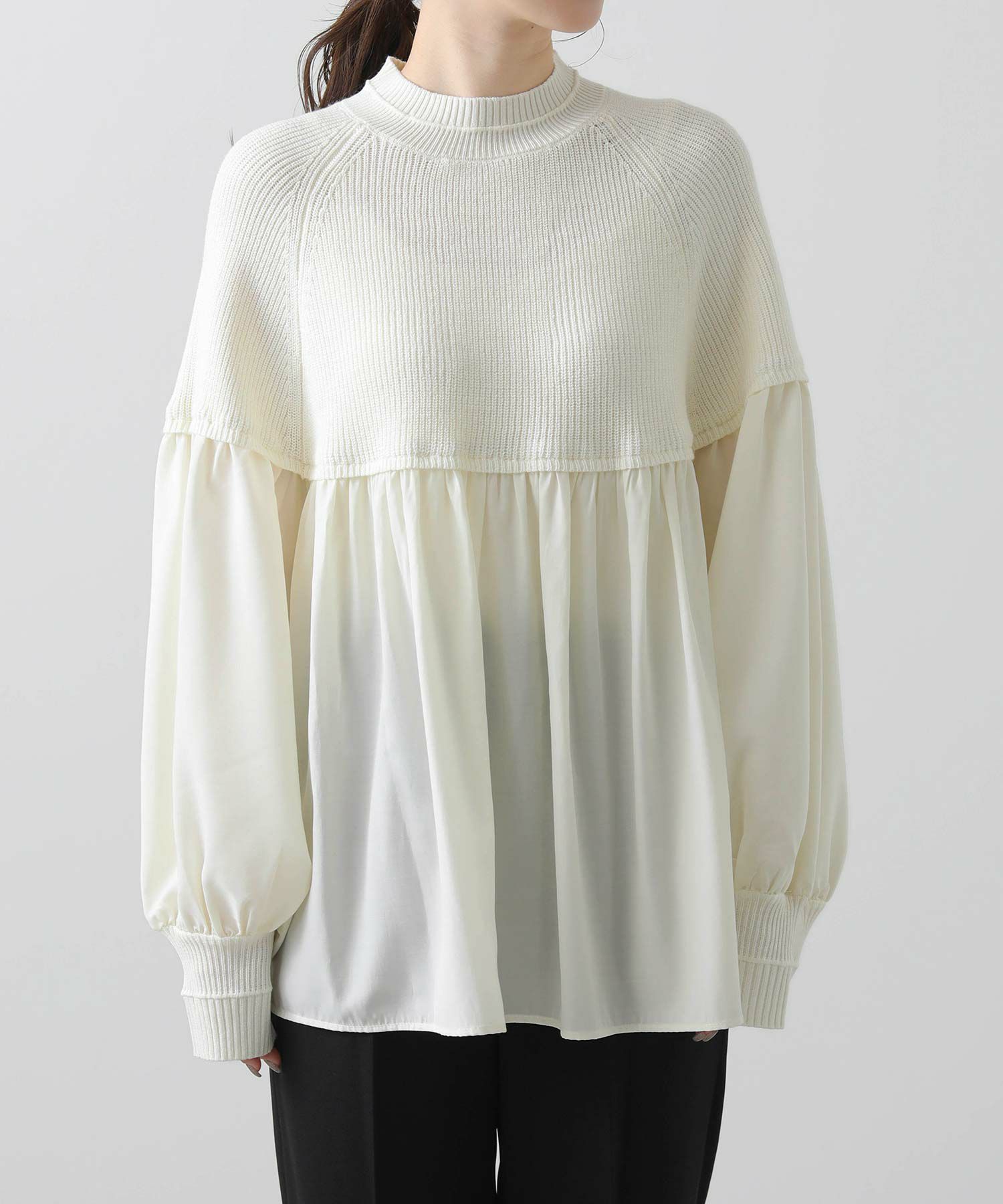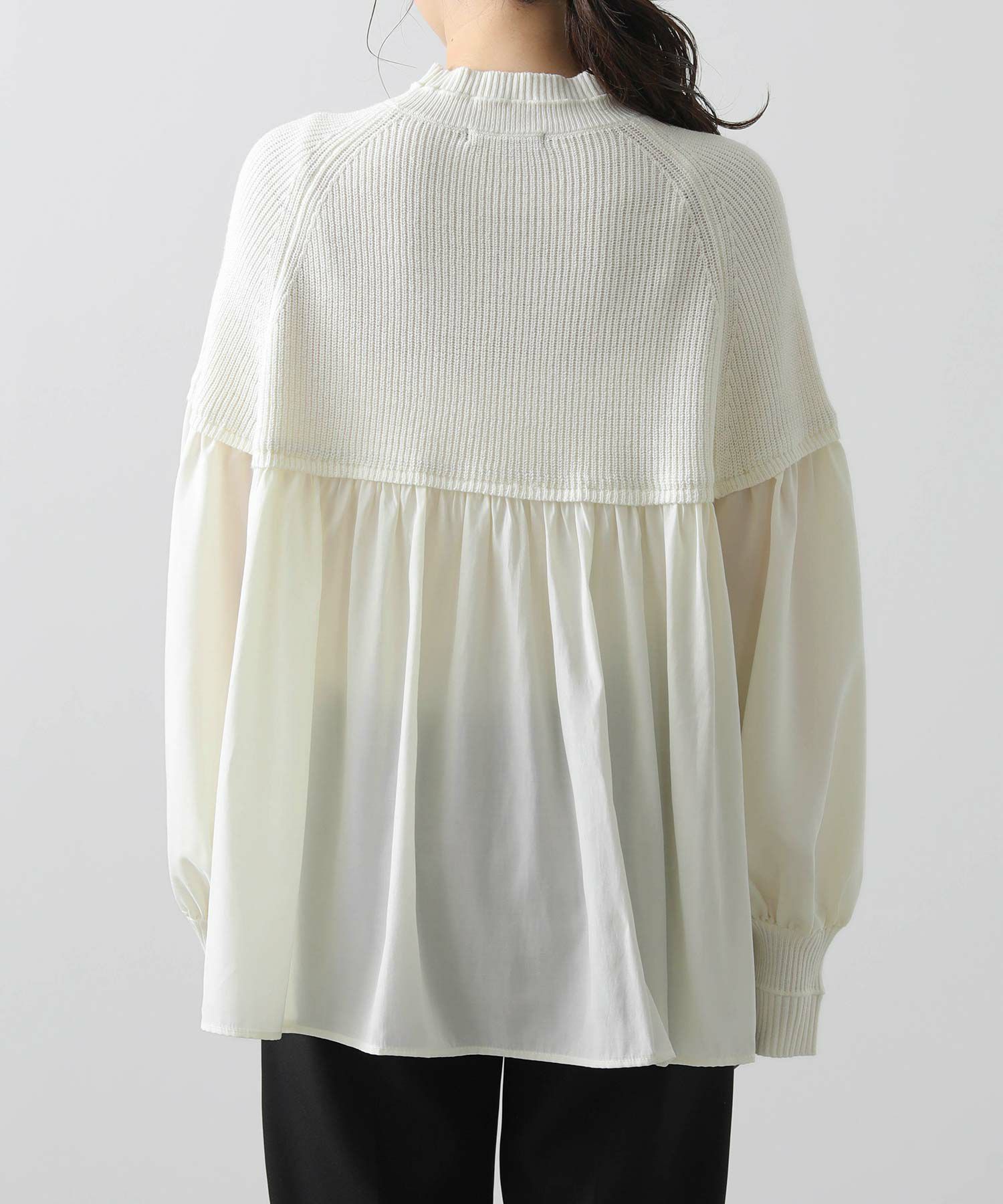 柔らかいニットとブラウス生地のドッキングニットは、どちらも柔らかく肌触りの良い素材で着心地も◎合わせるボトム次第でキレイ目にもカジュアルにも着回せる1枚で、シンプルながら存在感のあるアイテムです。