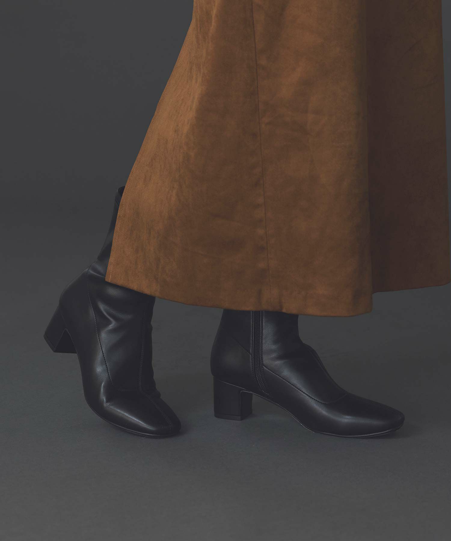 程よいボリュームのチャンキーヒールとストレッチを効かせたフィット感のある細身の筒周りが、合わせやすさと履きやすさを両立したショートブーツ。