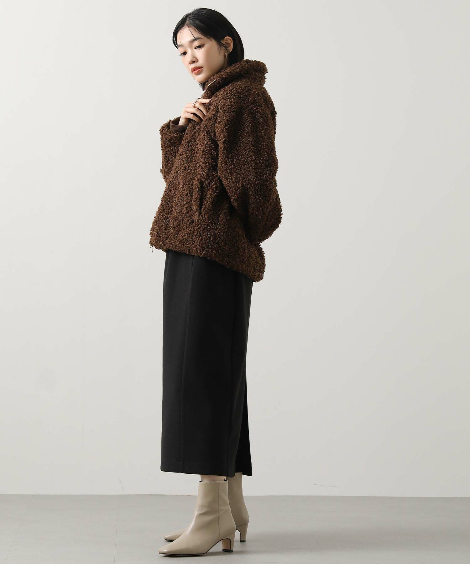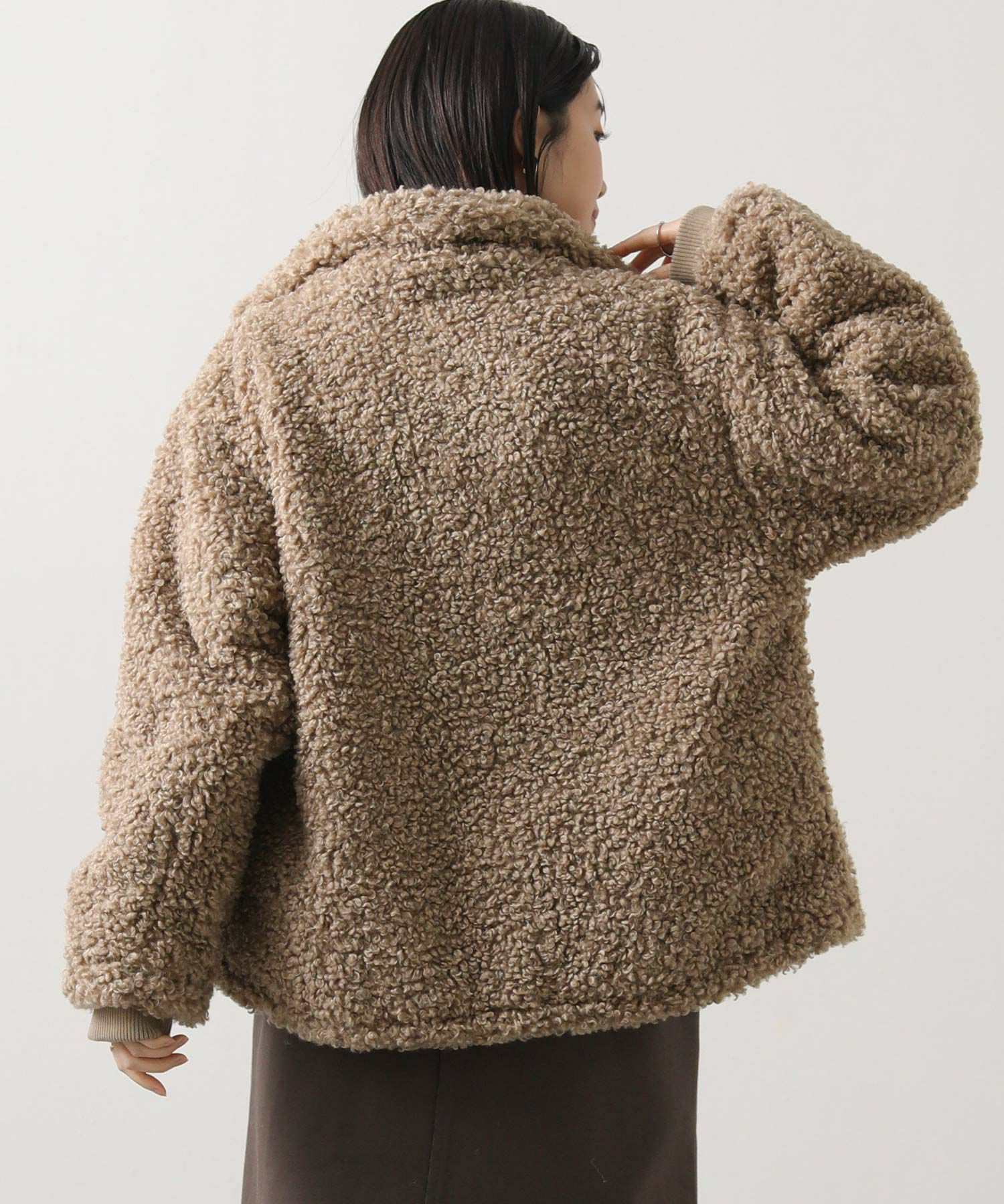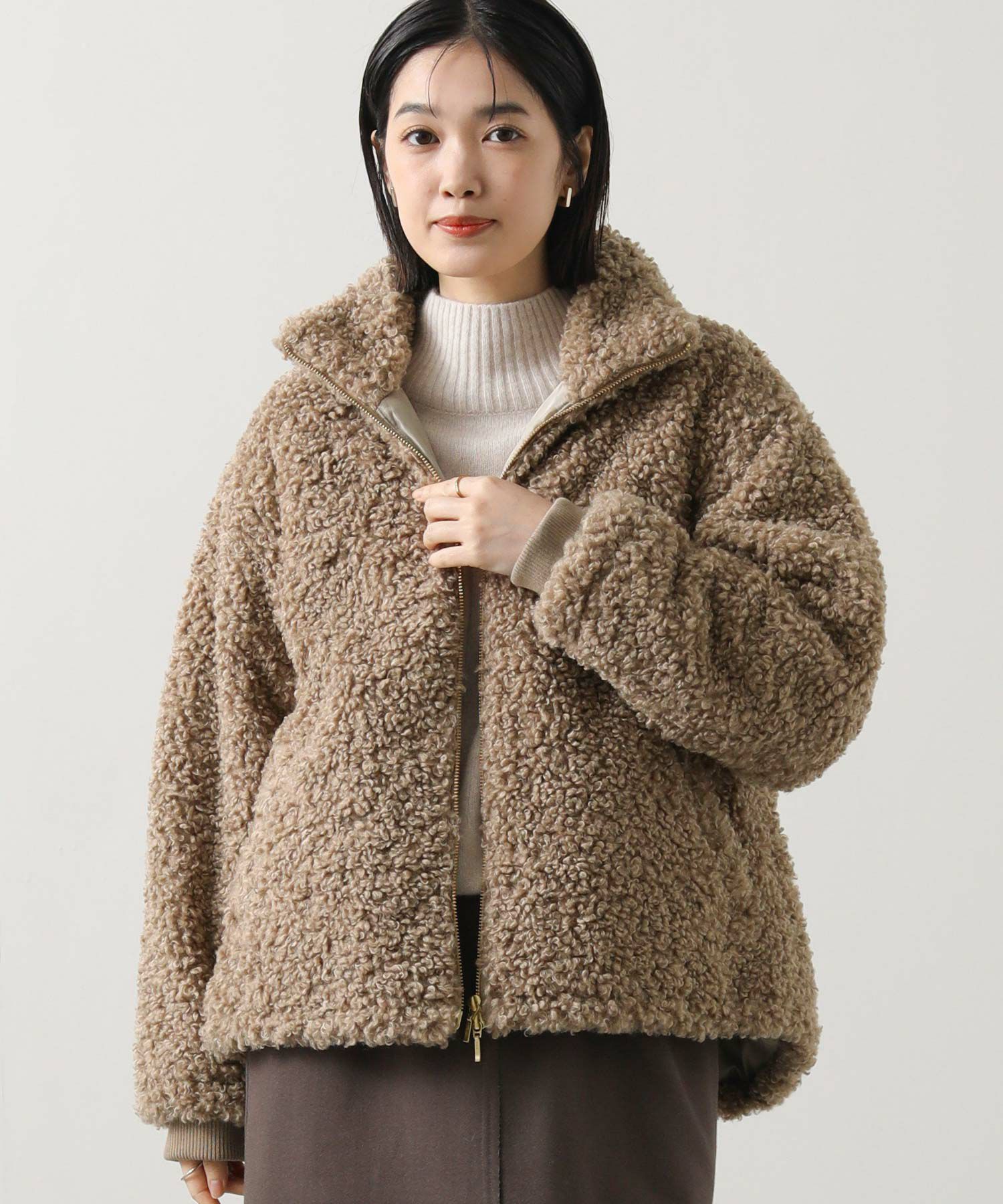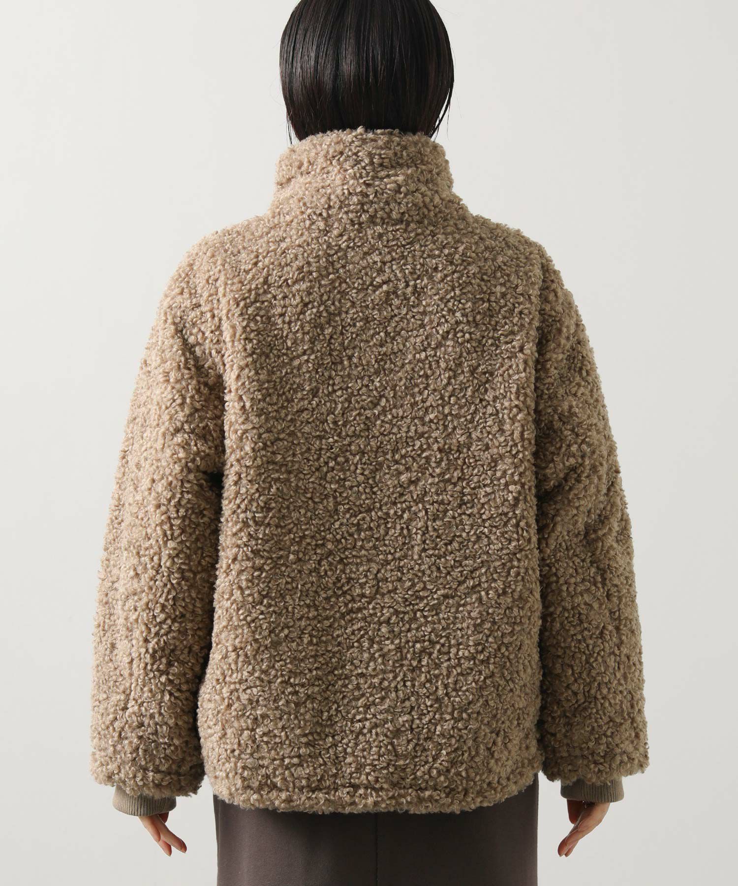 毛足が長めのプードルボアを使用したハイネックブルゾン。