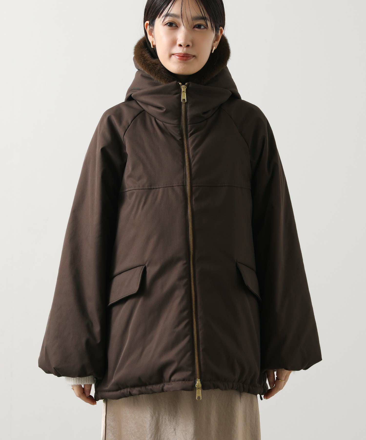 ファーを外すとシンプルなスタンドネックデザインの中綿コート。