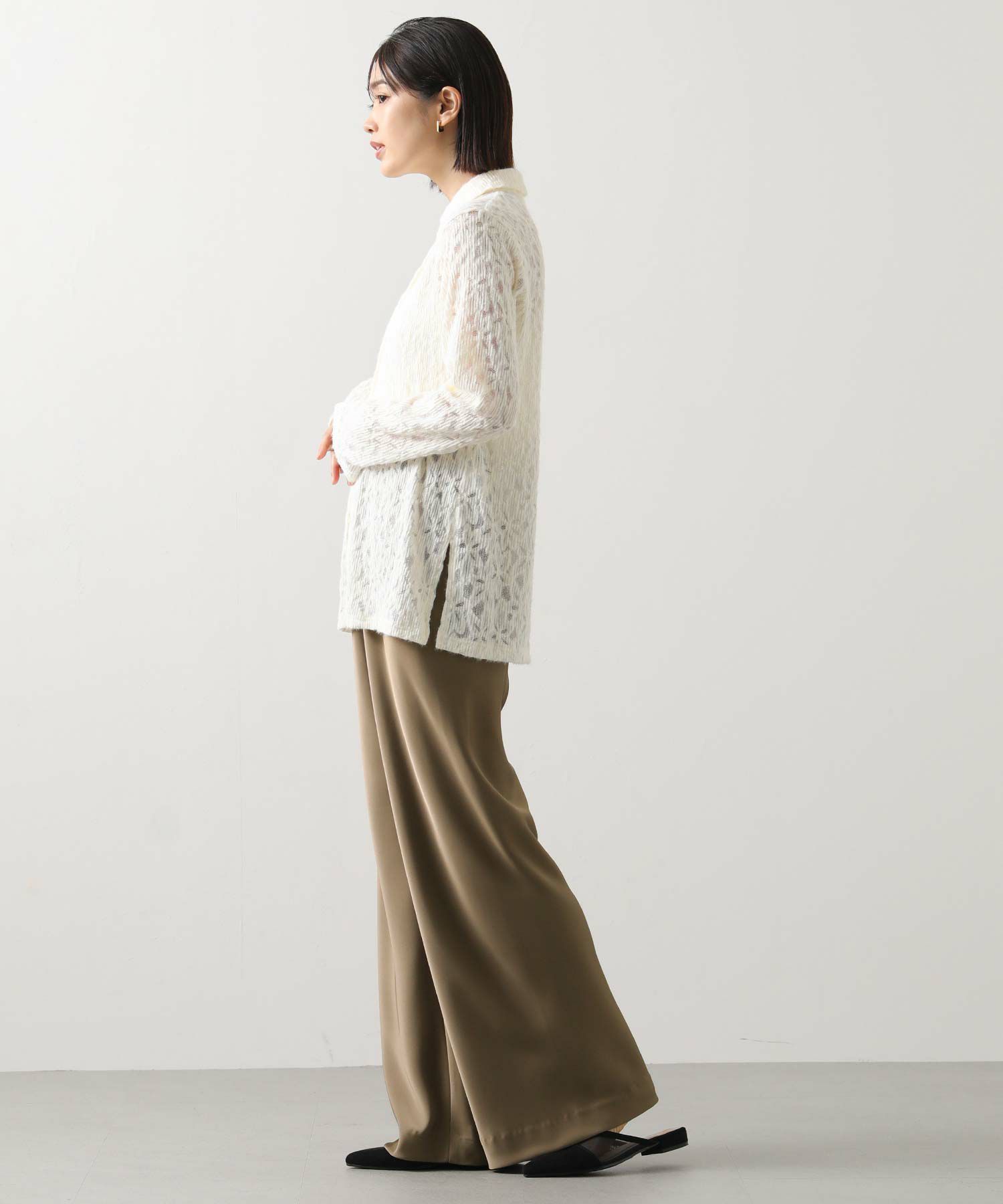 起毛したストレッチレース素材が柔らかく女性らしい印象を与え、インナーやボトム次第でさまざまなカジュアルスタイルに合わせやすいアイテム。