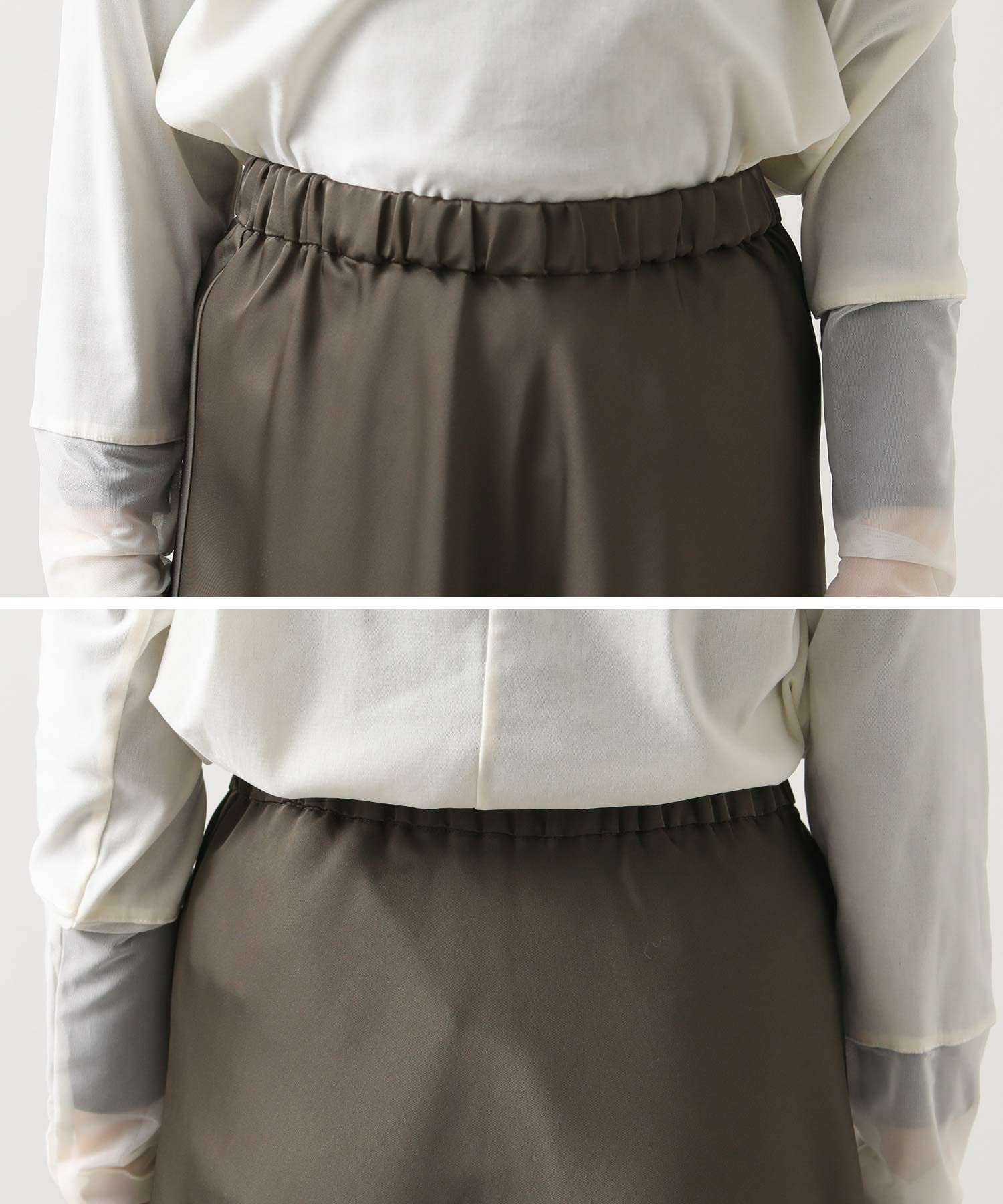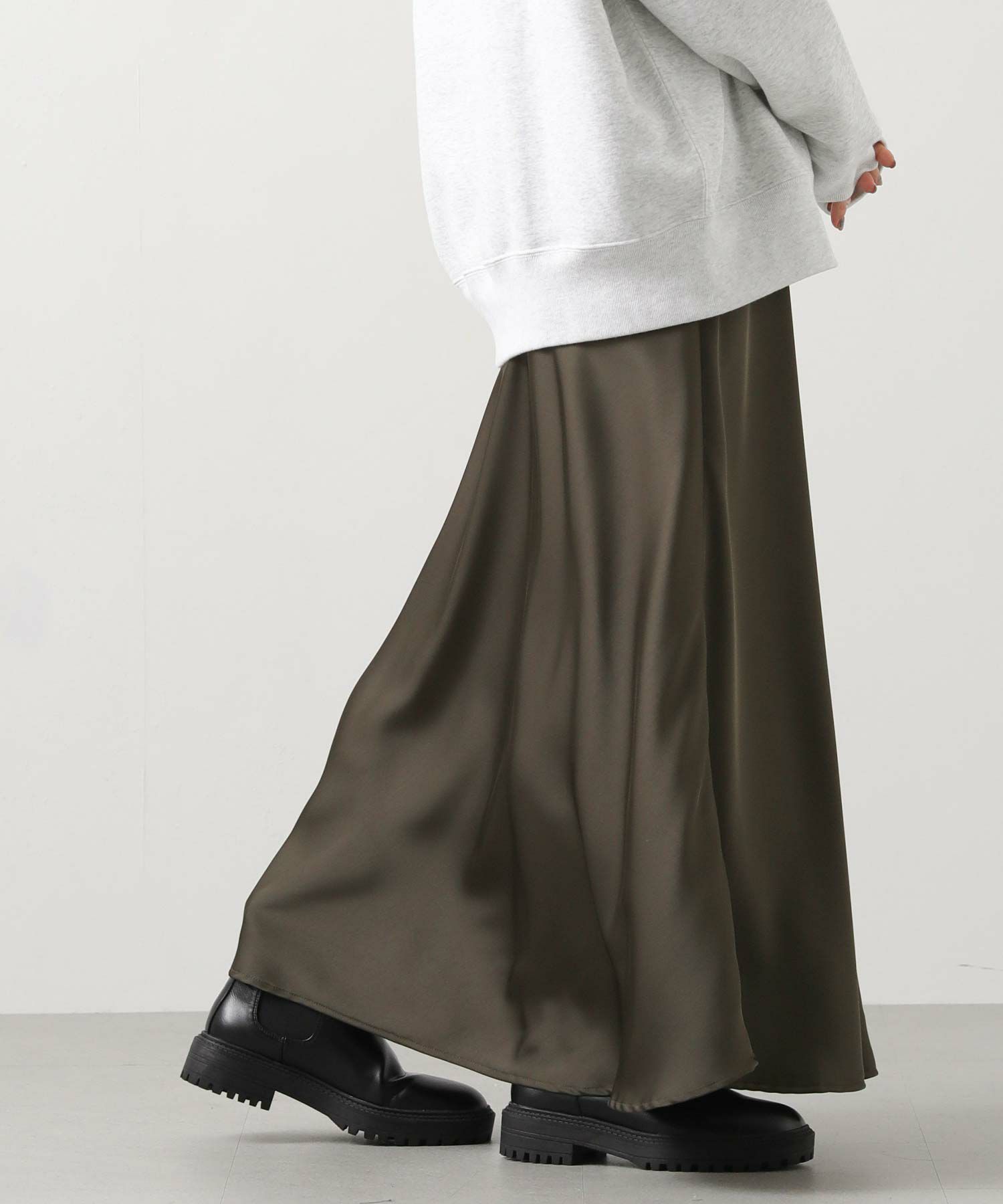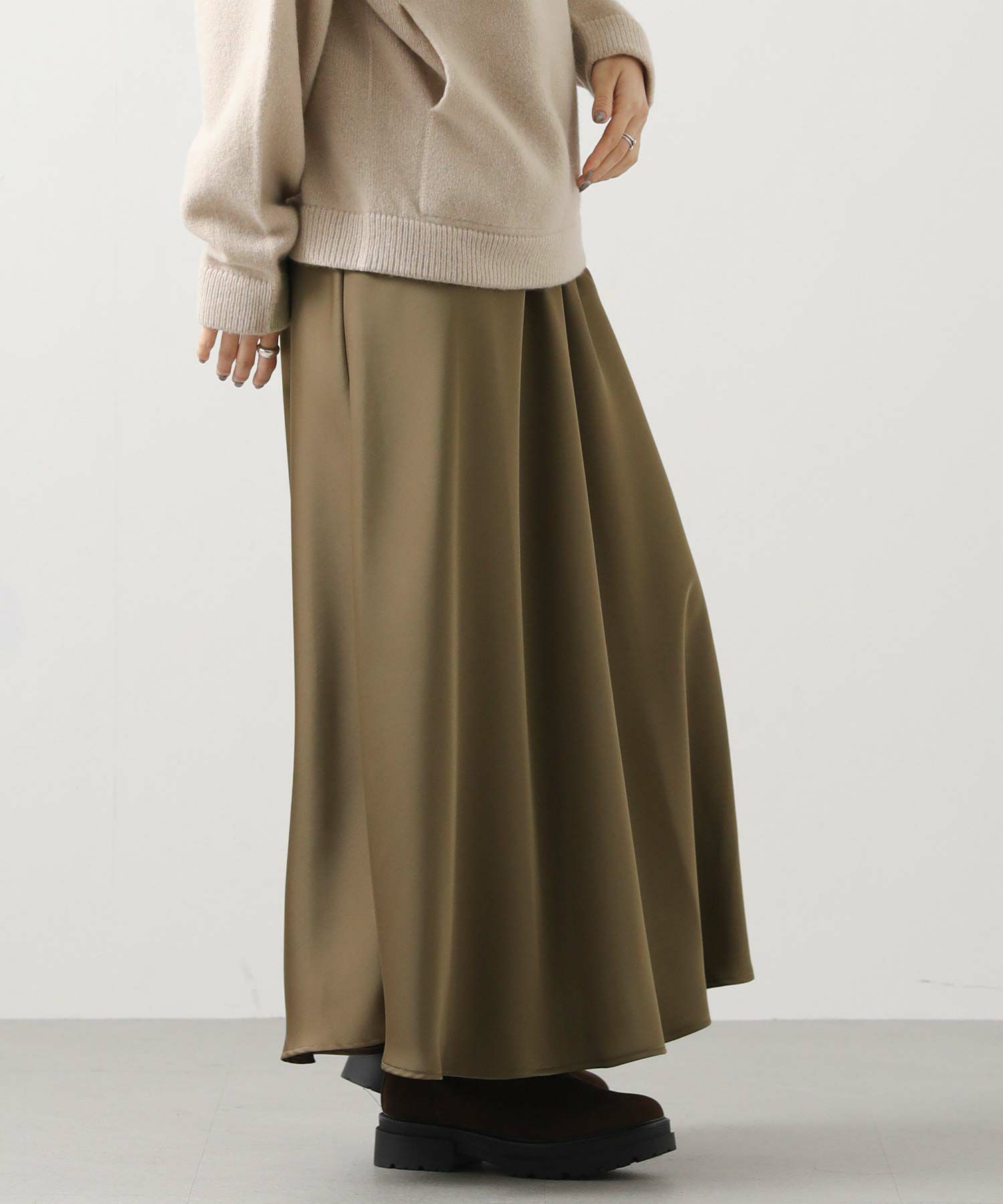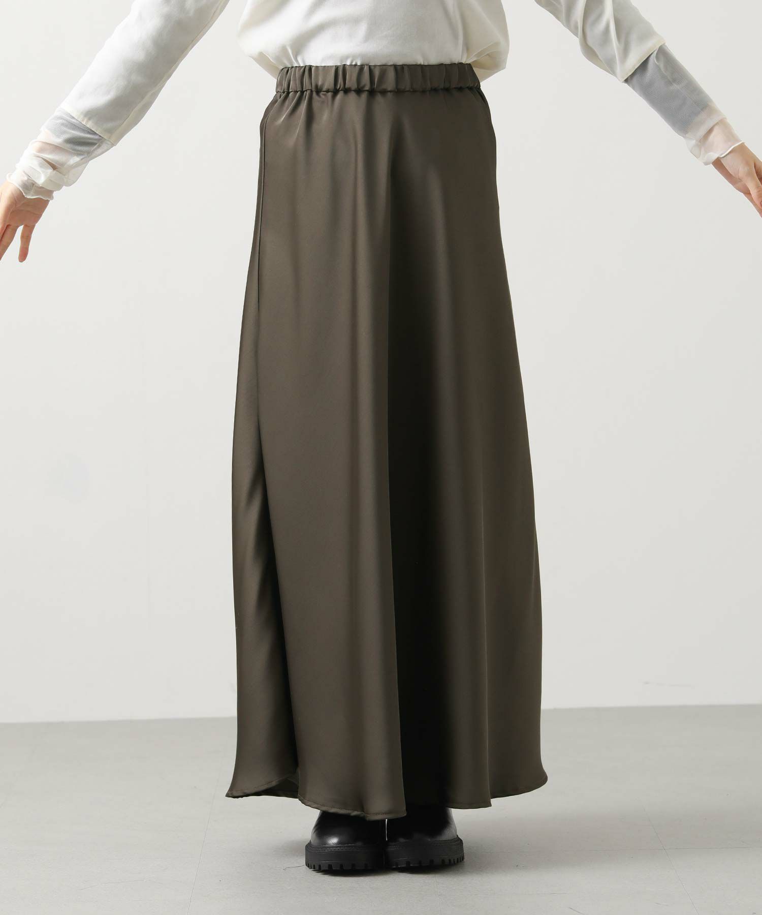 きれいなフレアシルエットの出るサテン生地スカート。