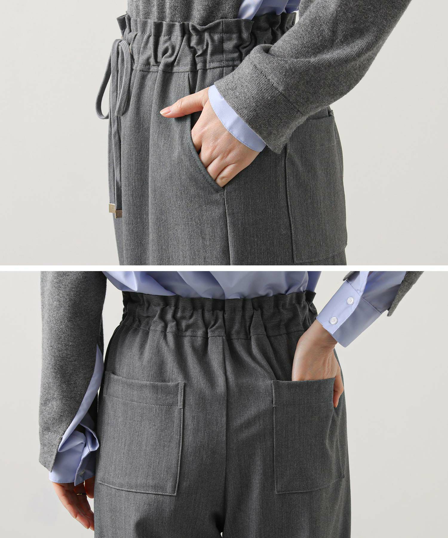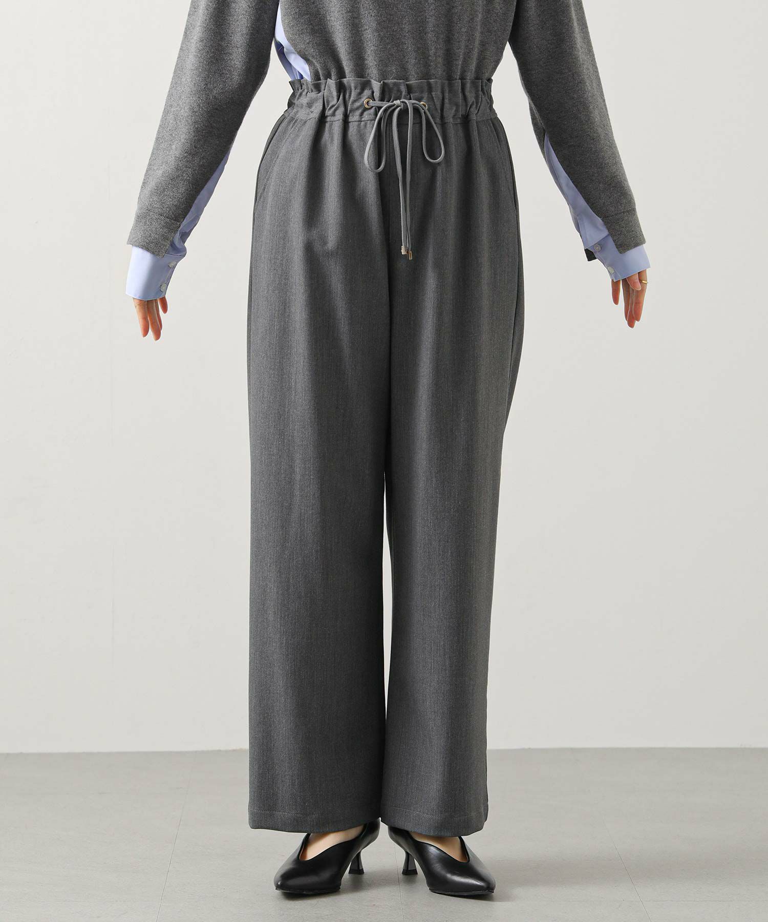 ウエスト総ゴムのイージーパンツながらきちんと見えする素材感なので、普段使いからオフィスでも着られるアイテム。