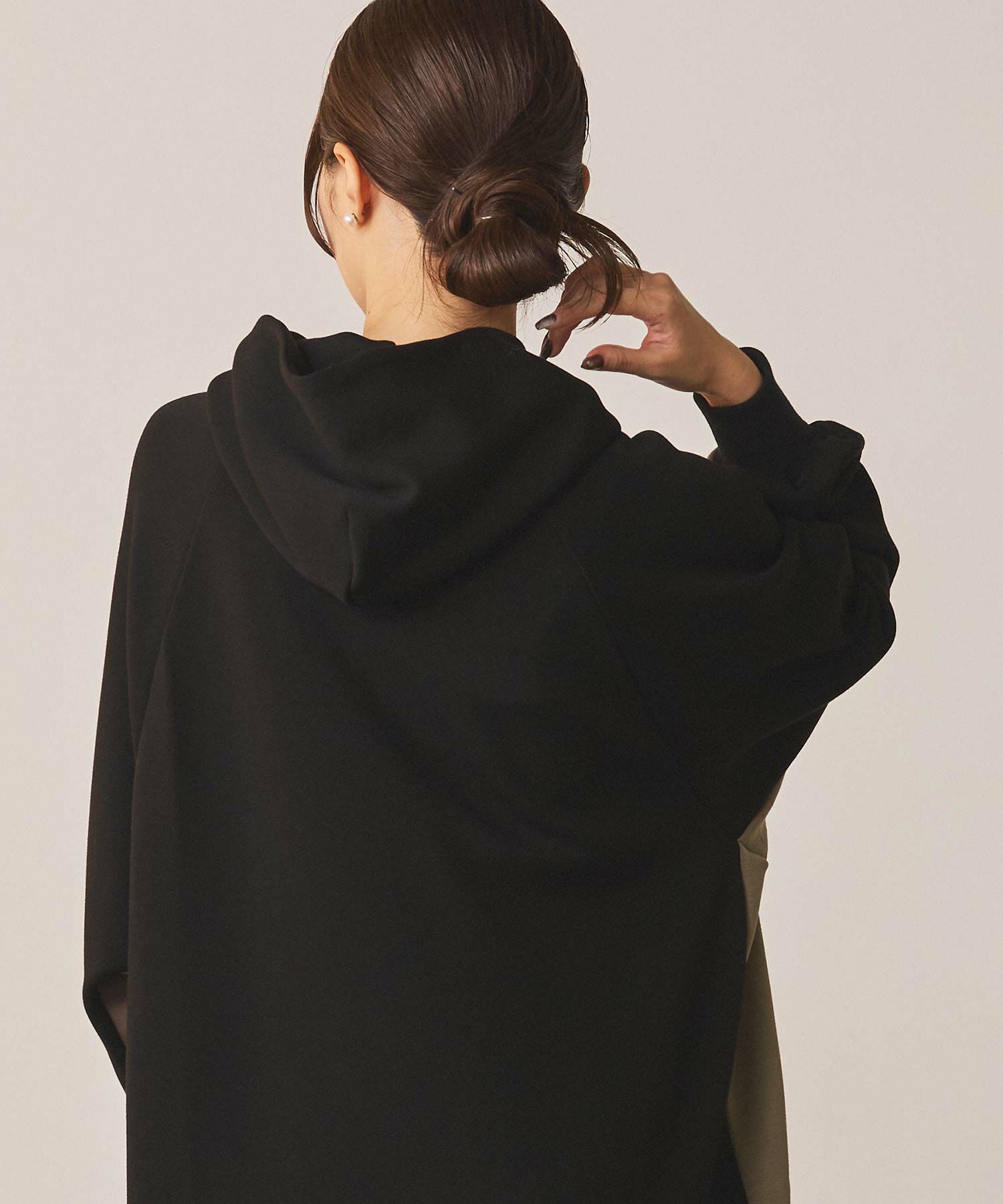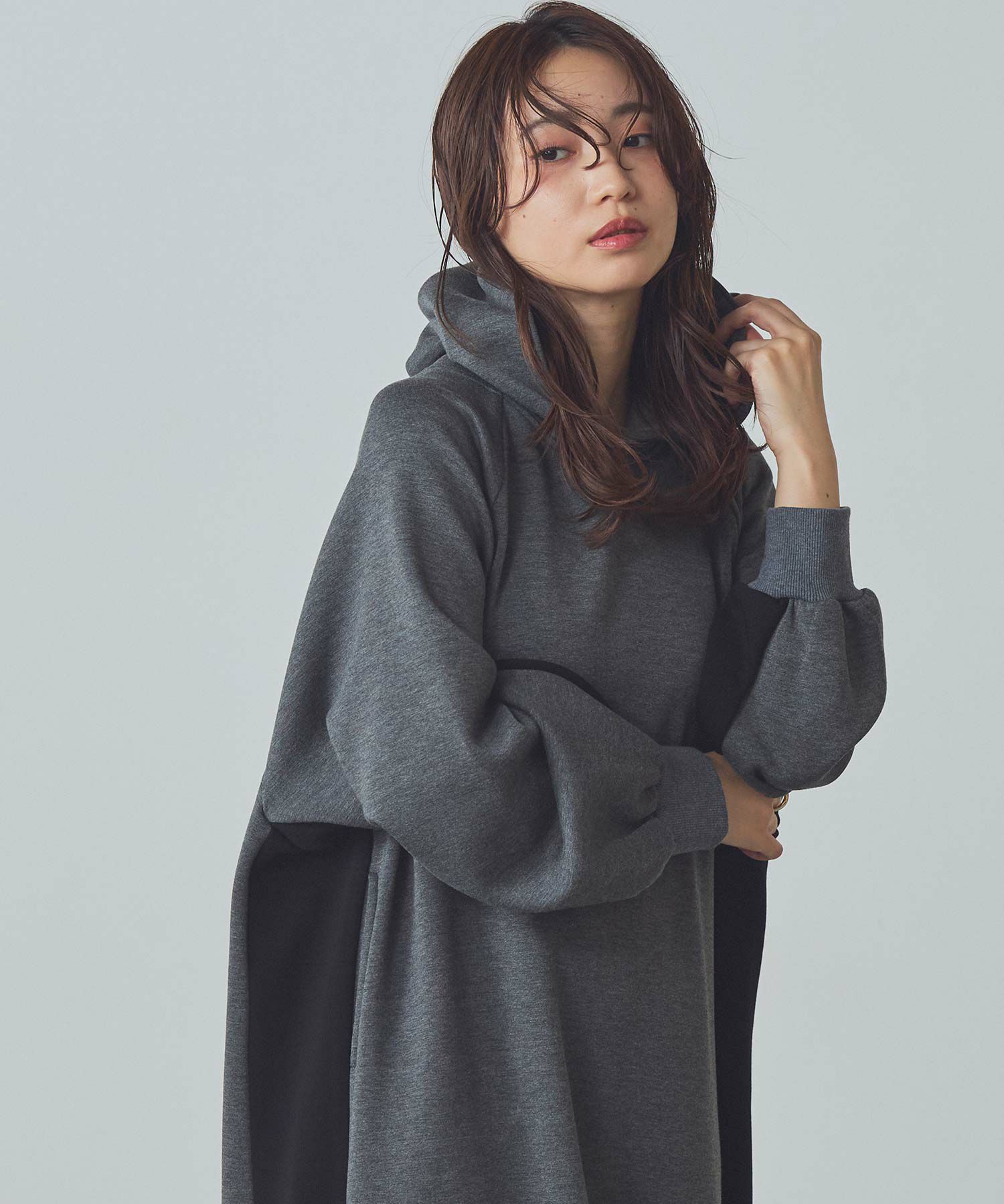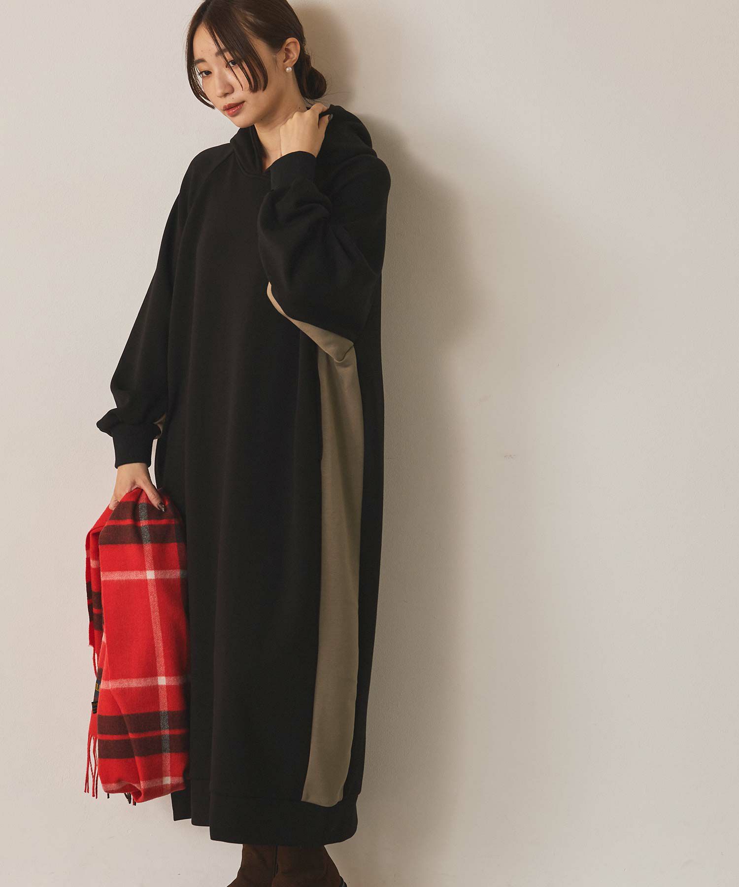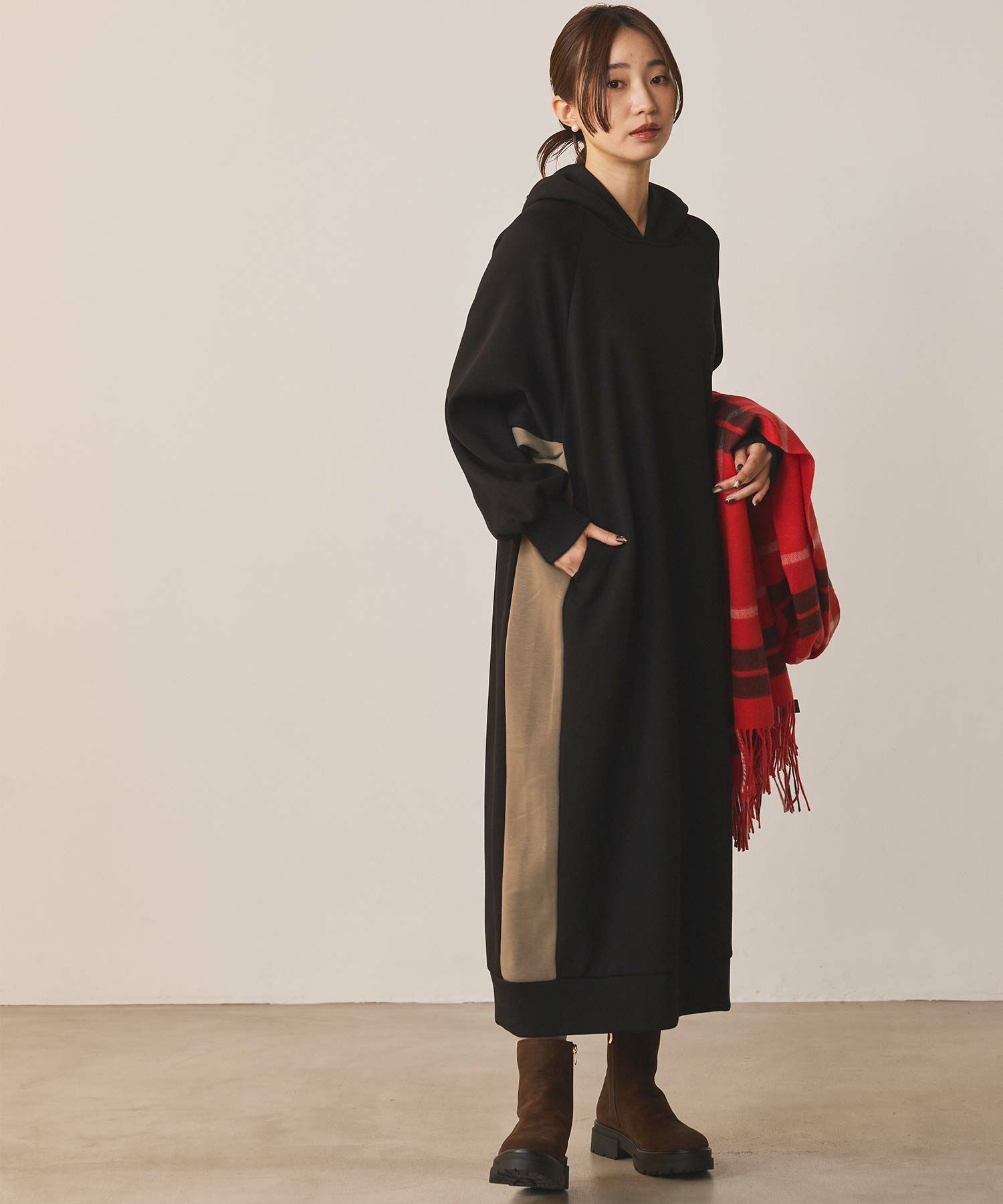 サイドラインから袖下のバイカラーがポイントのフーディワンピース。