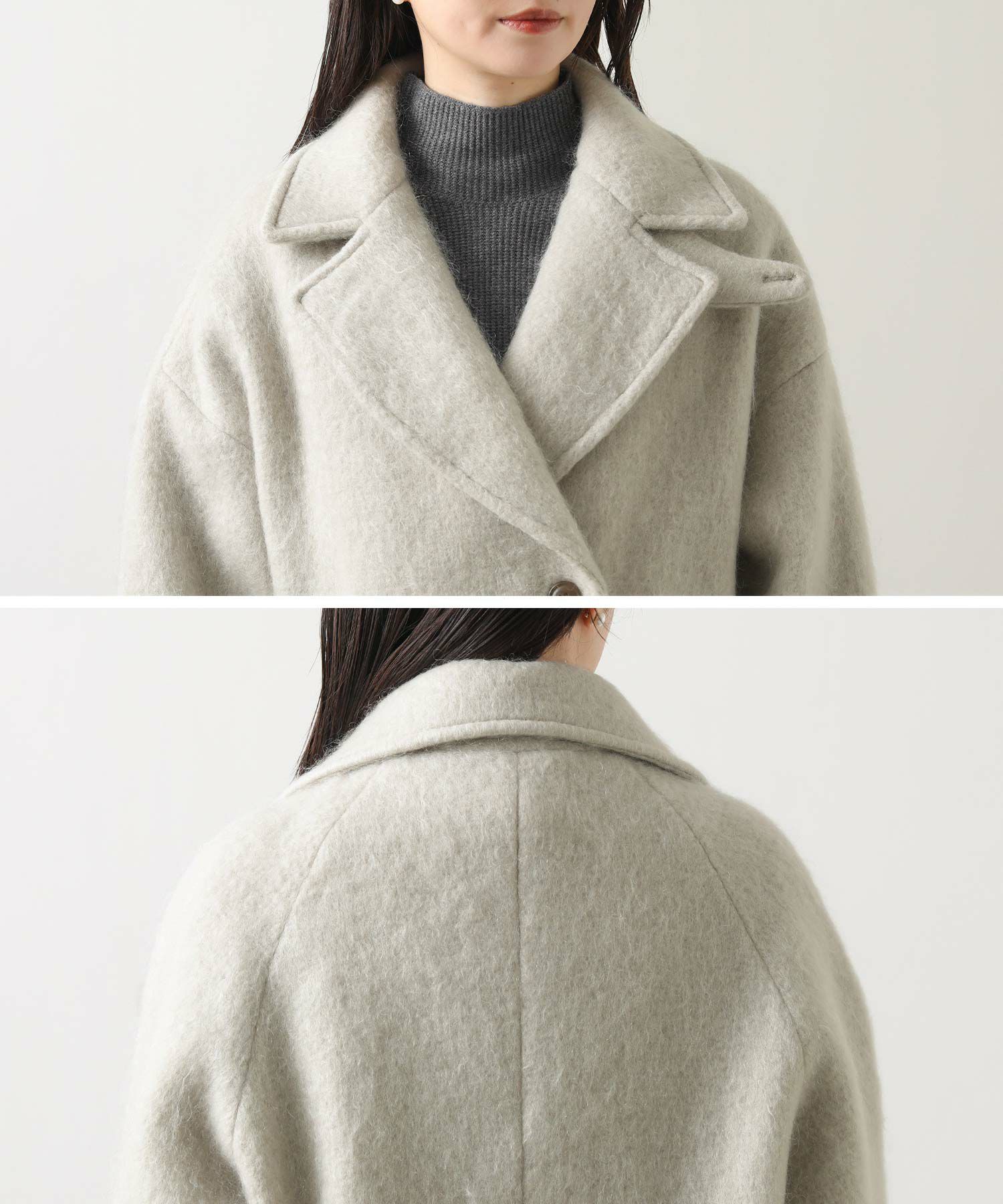 大きめの襟にミドル丈が絶妙なバランスのモヘヤシャギーPコート。