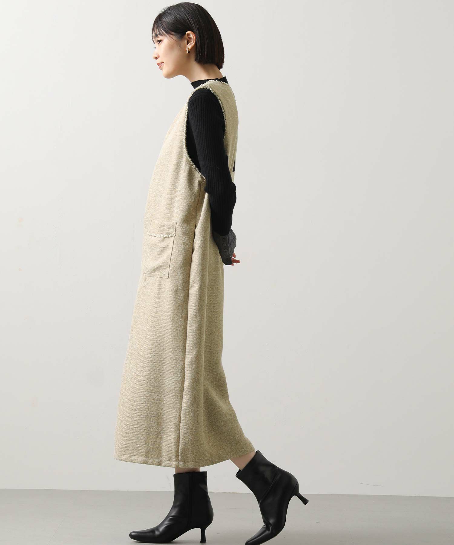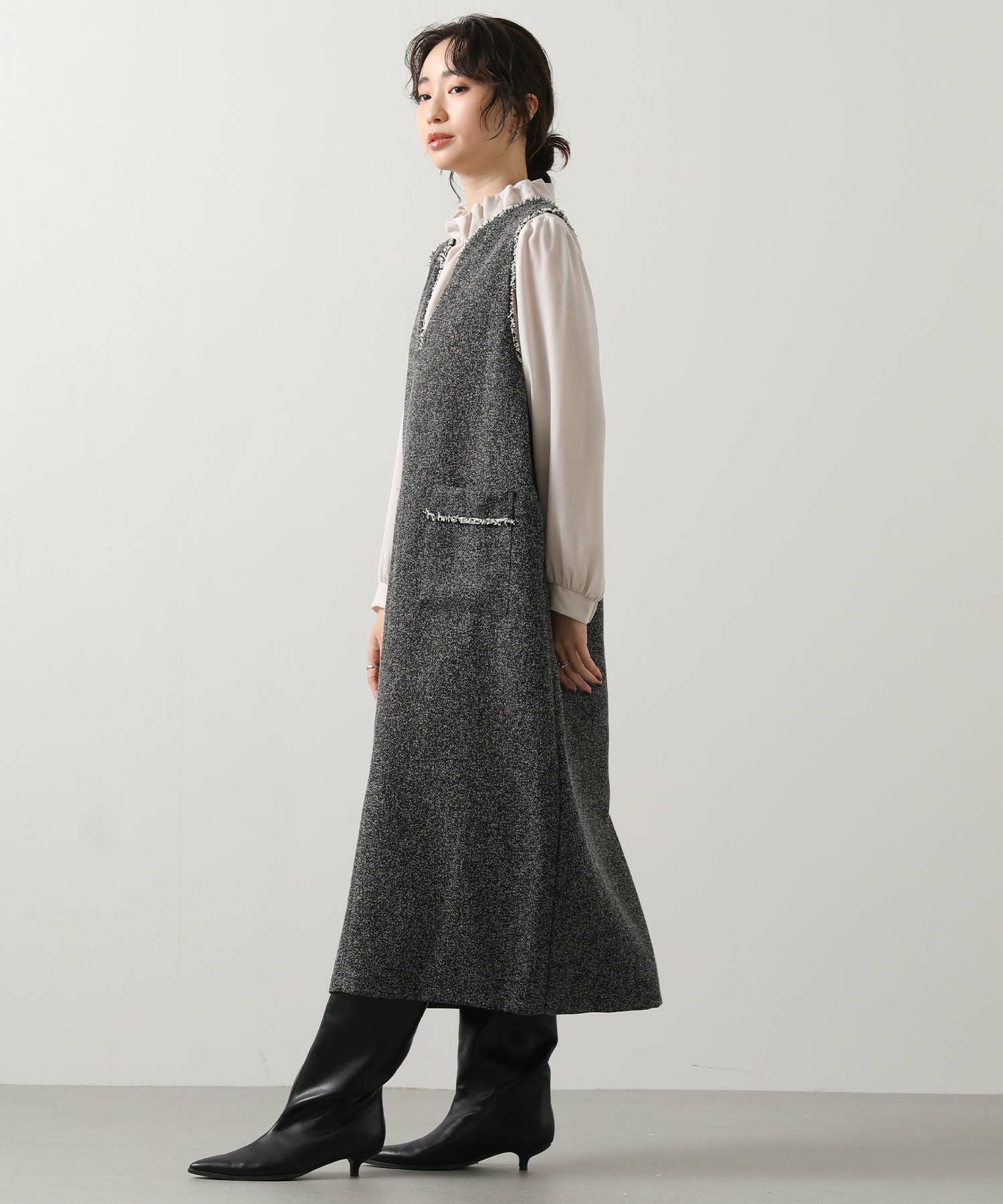 衿元とポケット口を彩る華やかなフリンジが目を惹く、ツィード調のジャンスカ。