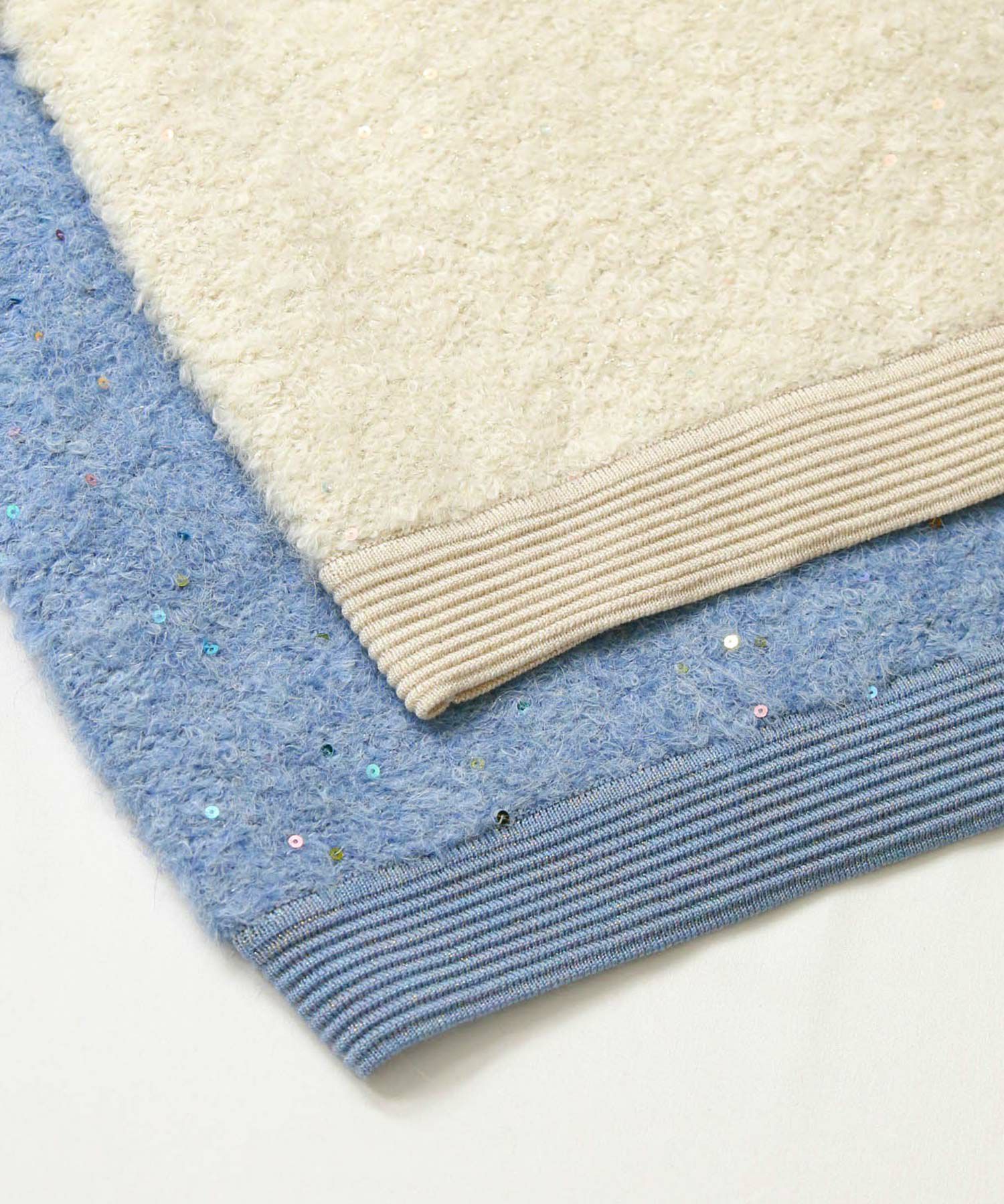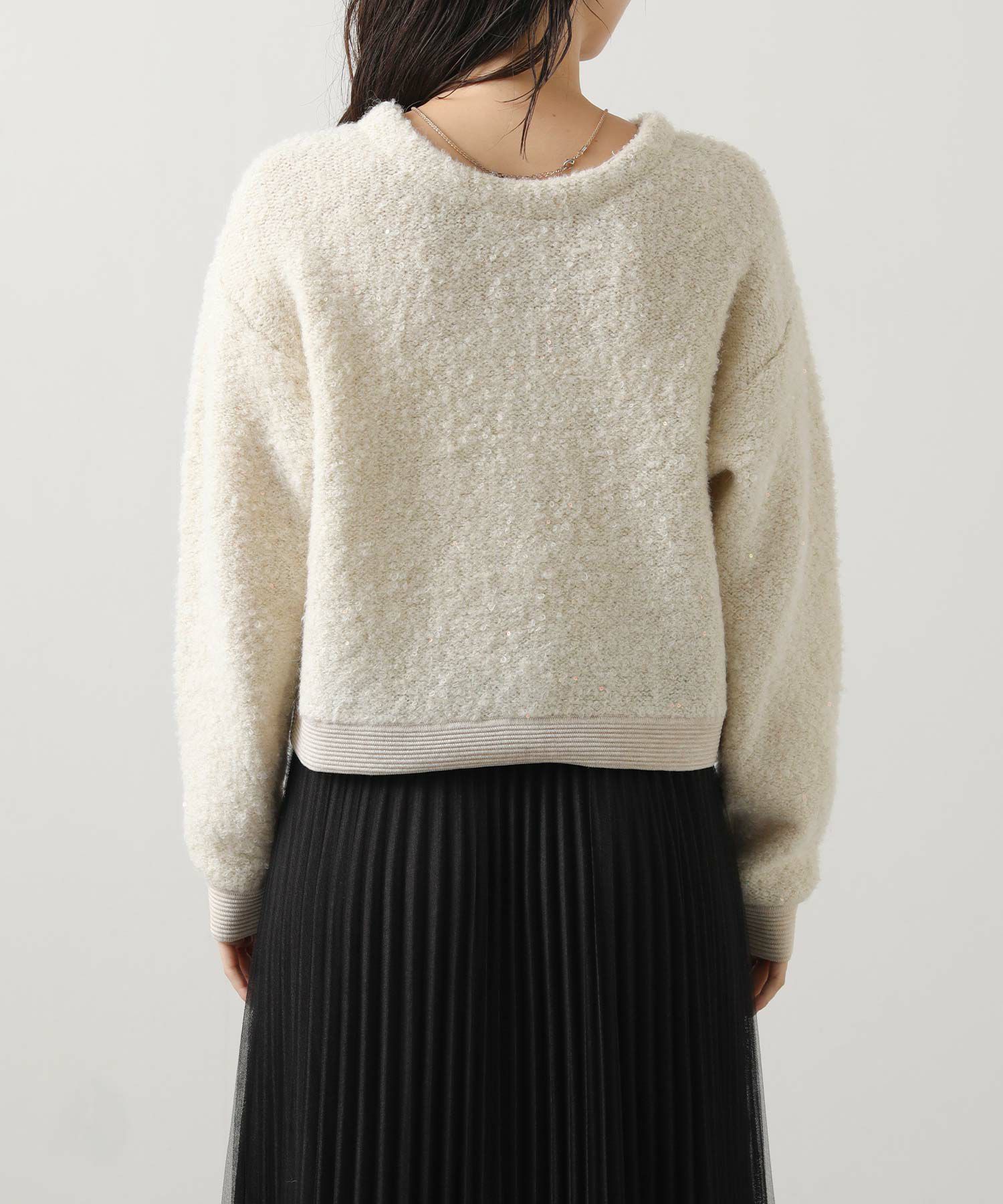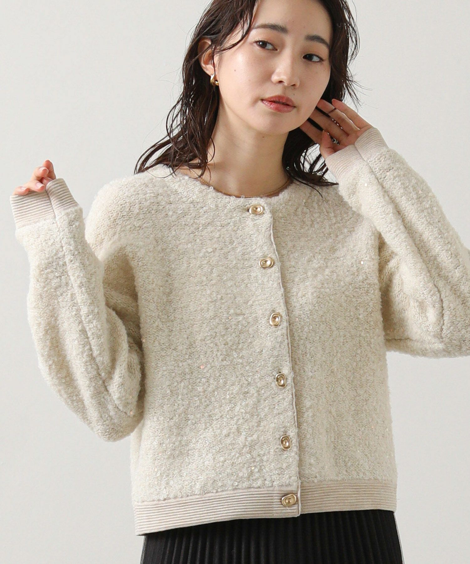 ふわふわとしたブークレ素材に煌めくスパンコールが魅力的なニットカーデ。