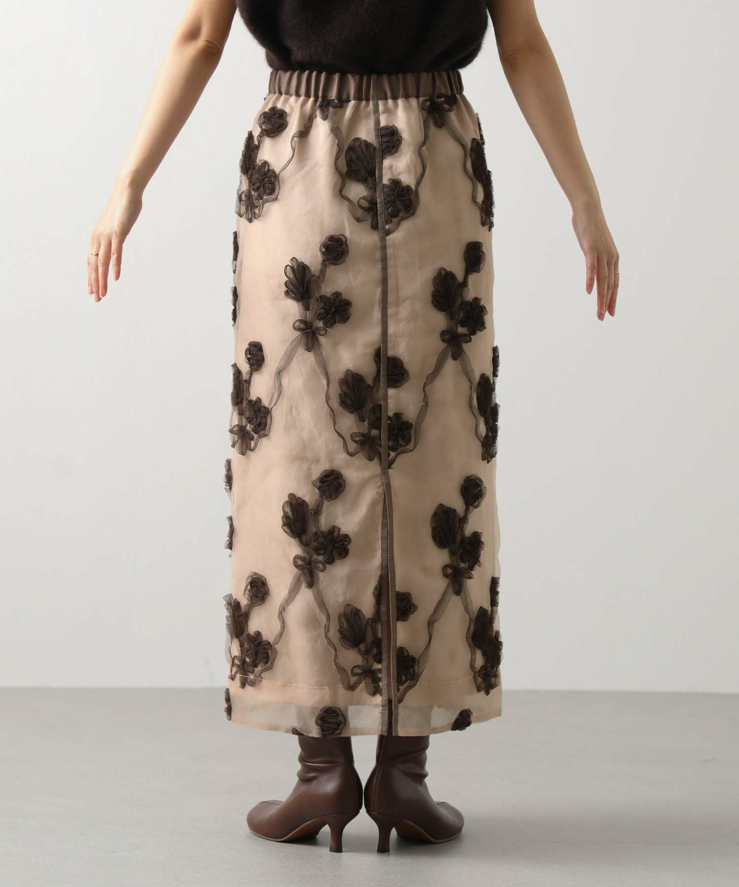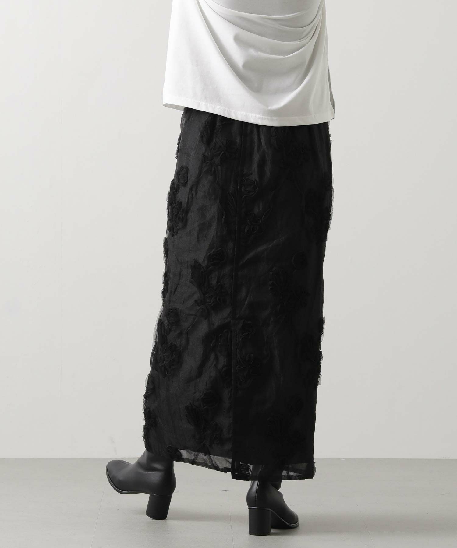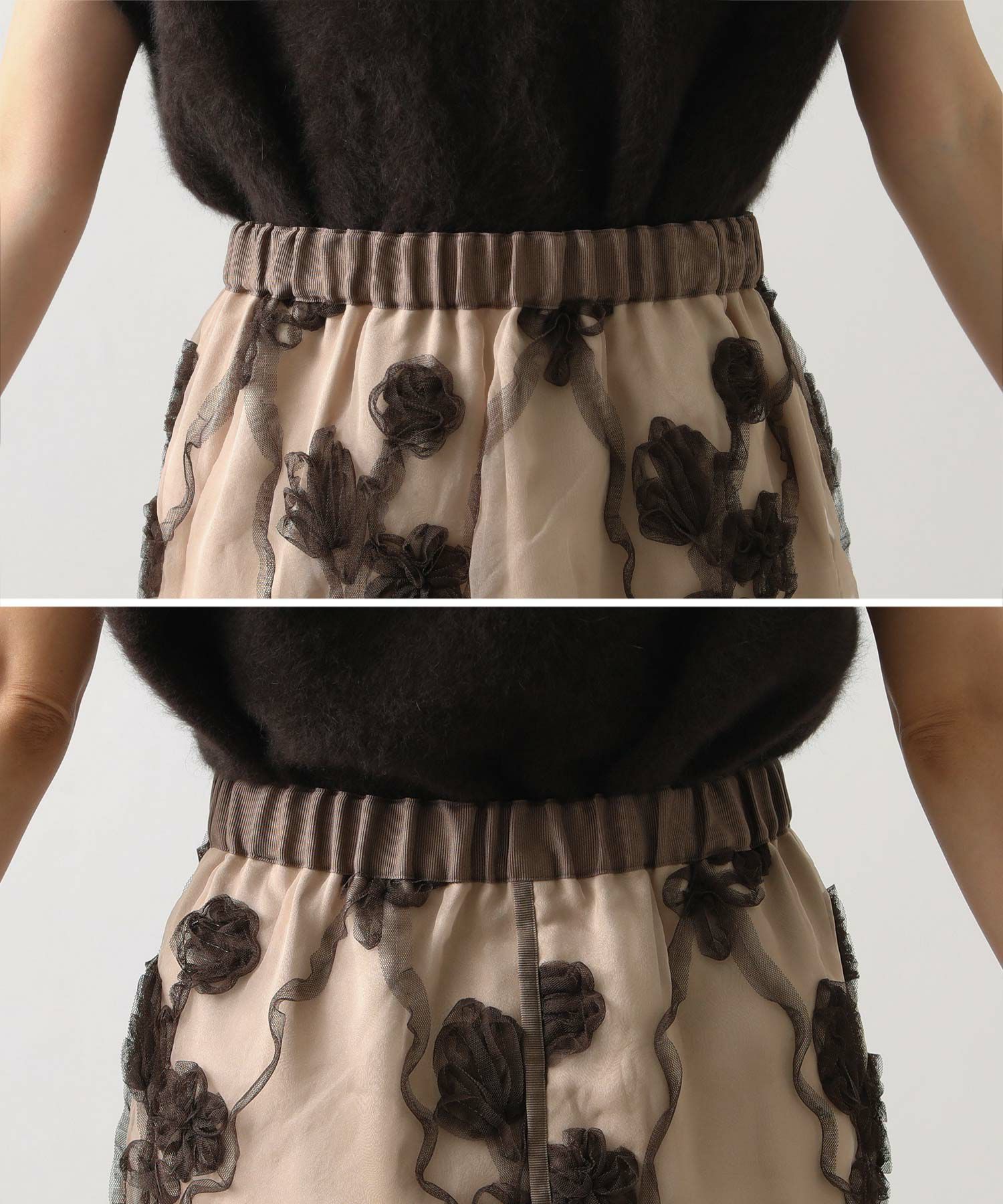 オーガンジーにチュールで刺繍を施した立体感のある素材が、スタイリングにアクセントをつけてくれます。ウエストはグログランテープを使用して、インスタイルも決まるデザインになっています。