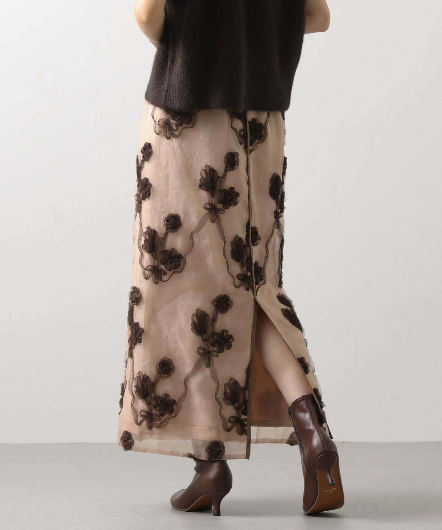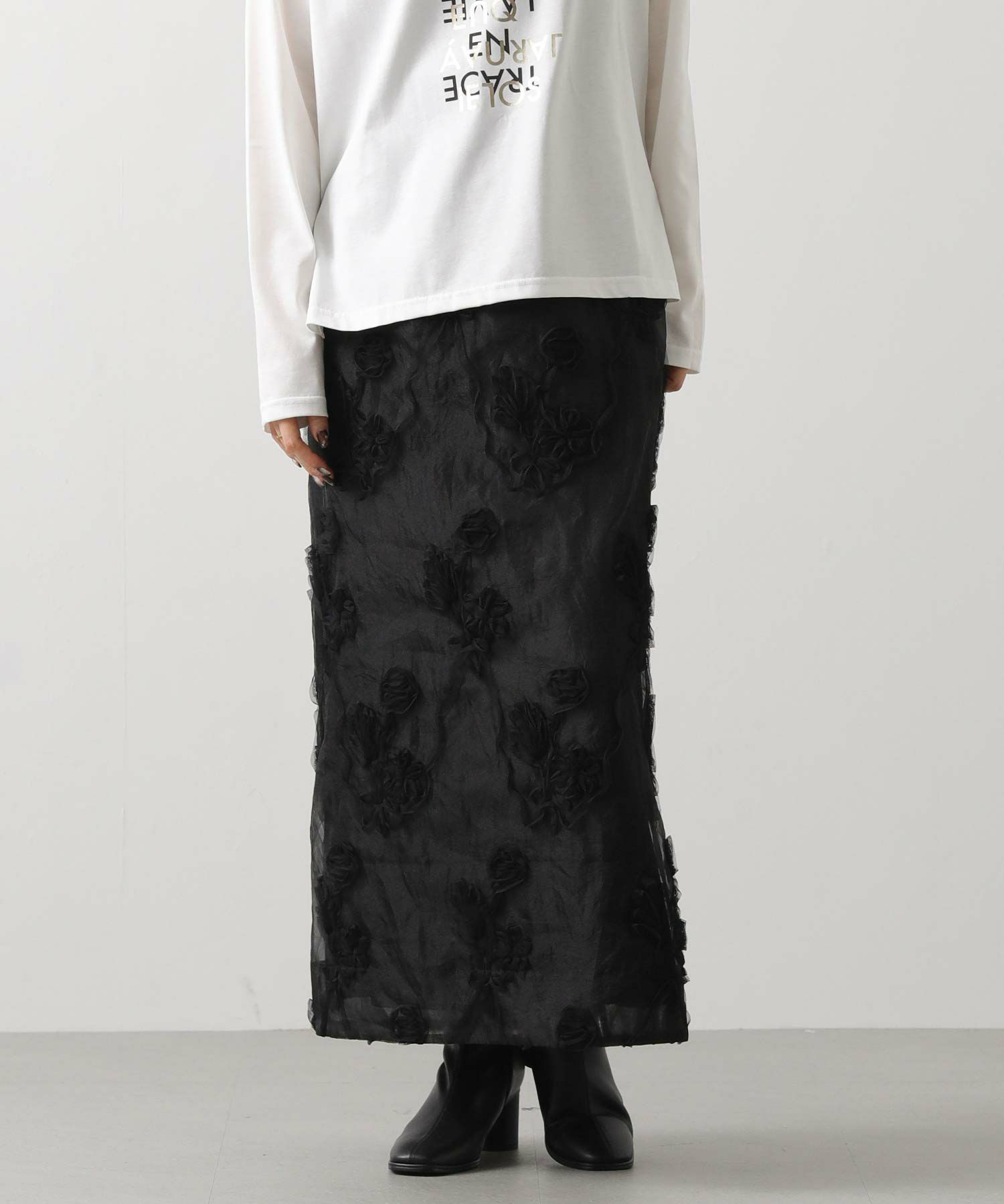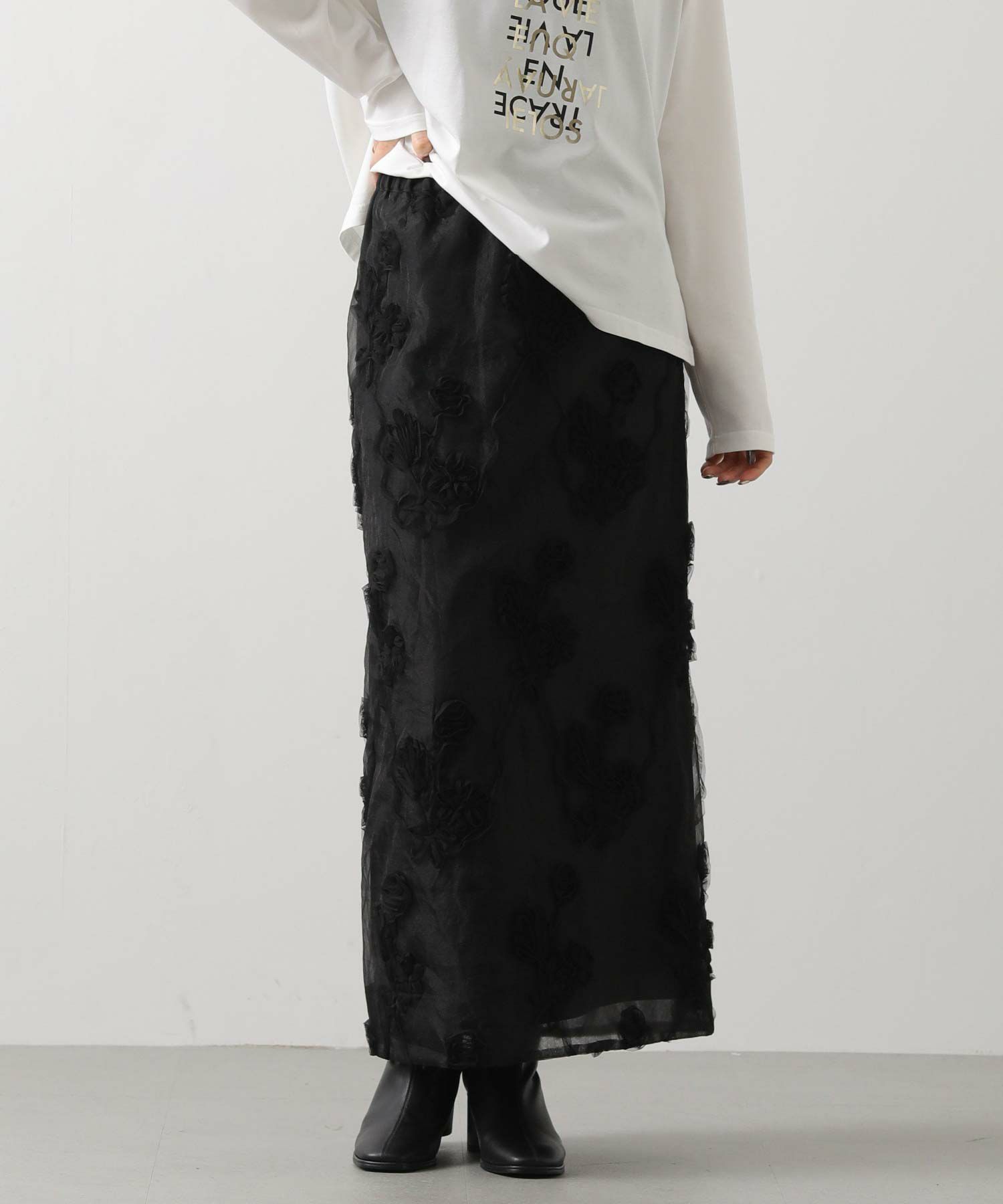 オーガンジーにチュールで刺繍を施した立体感のある素材が、スタイリングにアクセントをつけてくれます。ウエストはグログランテープを使用して、インスタイルも決まるデザインになっています。