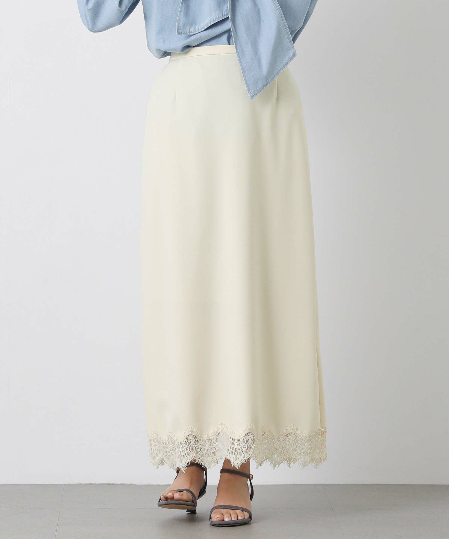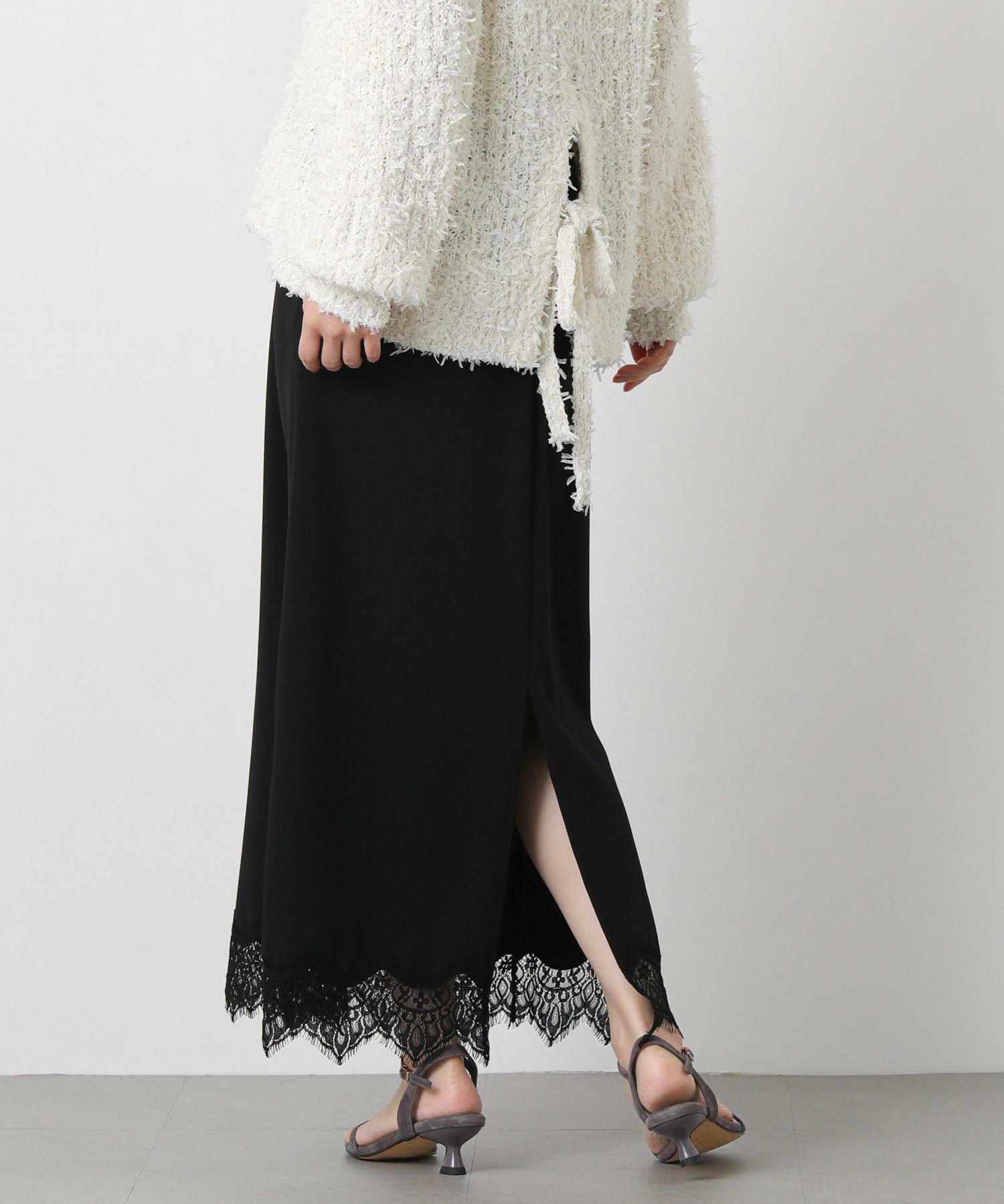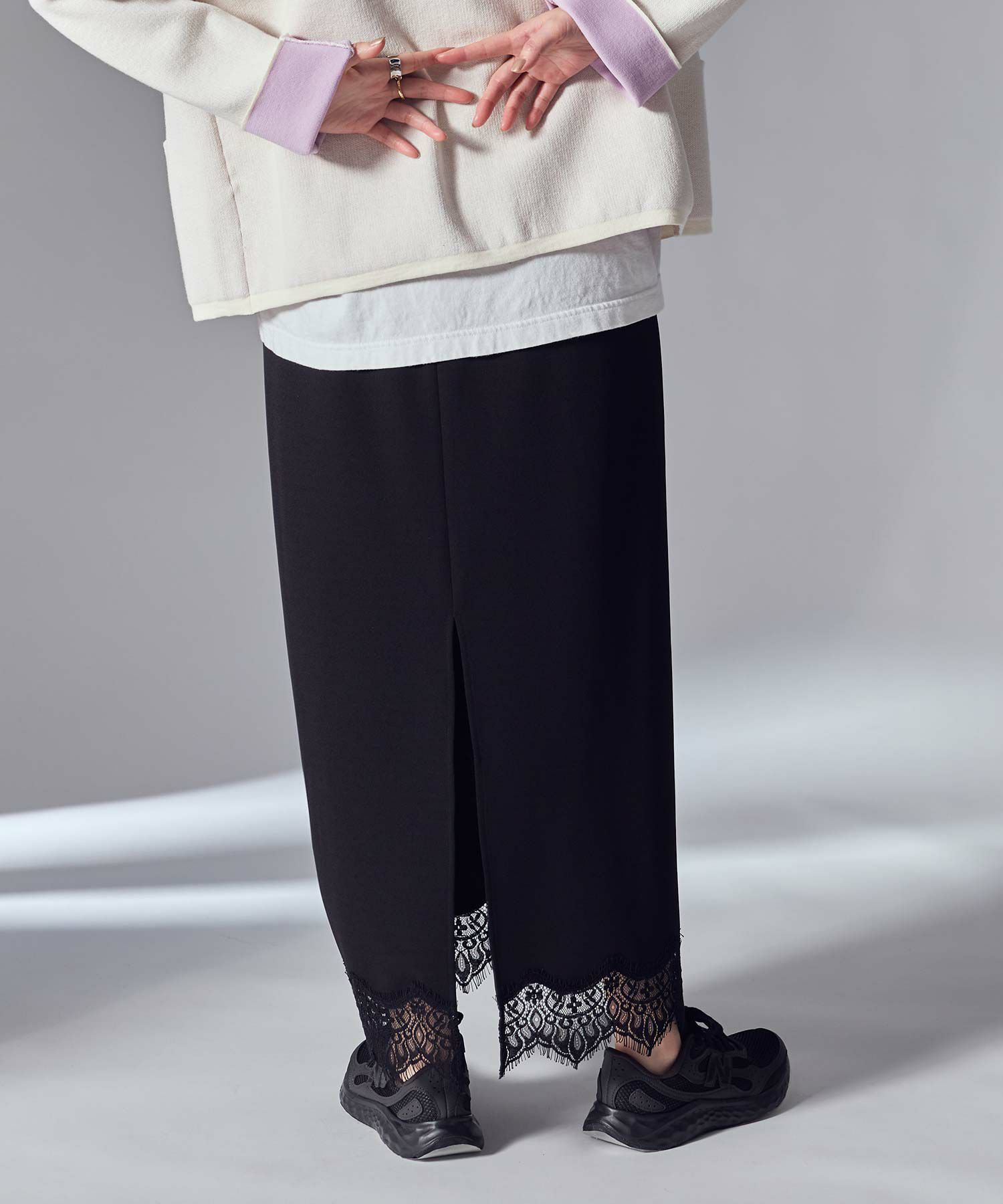 裾にあしらったレースが上品でトレンド感もあり、シンプルなトップスと合わせてもスタイリングが華やかに決まります。