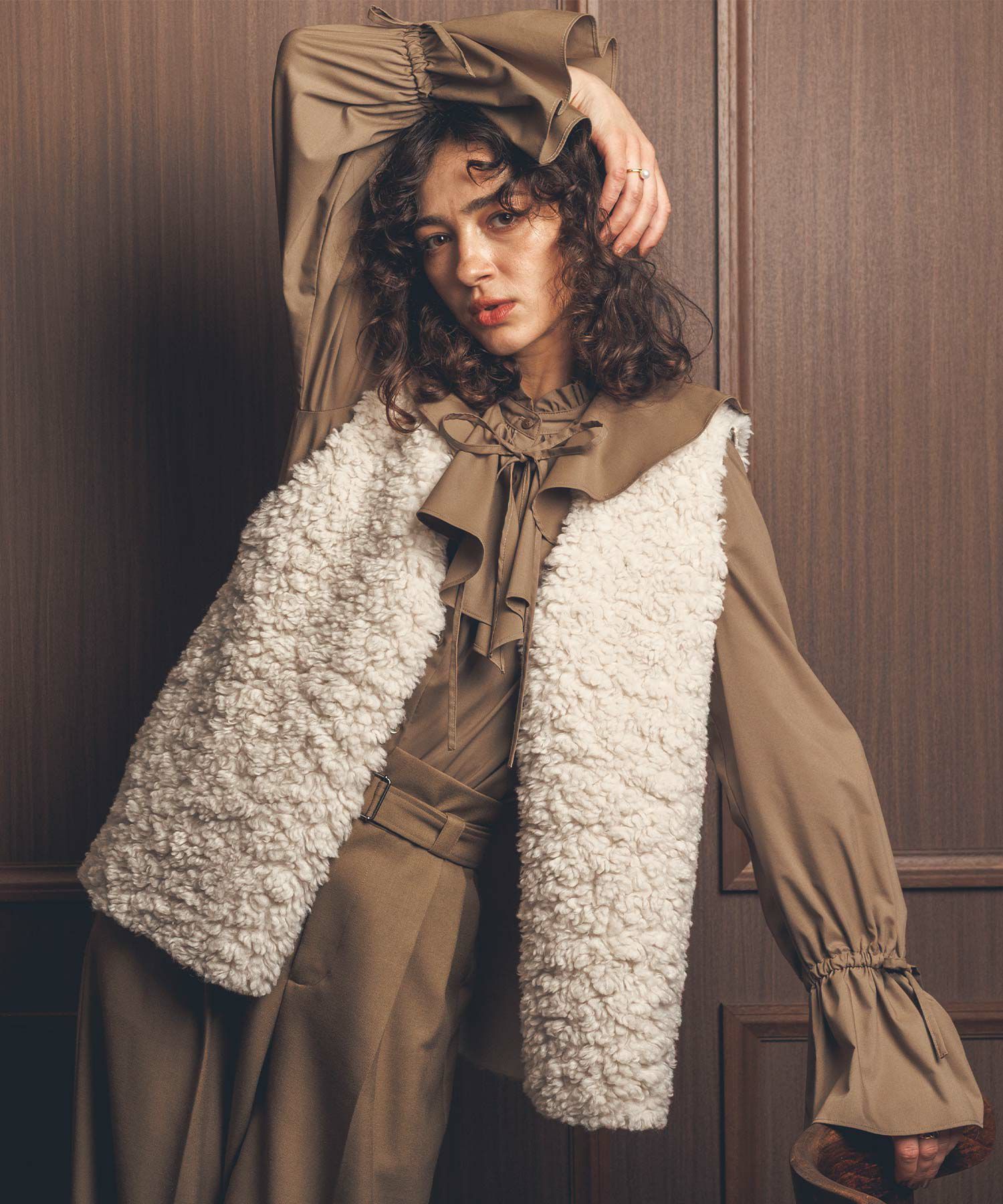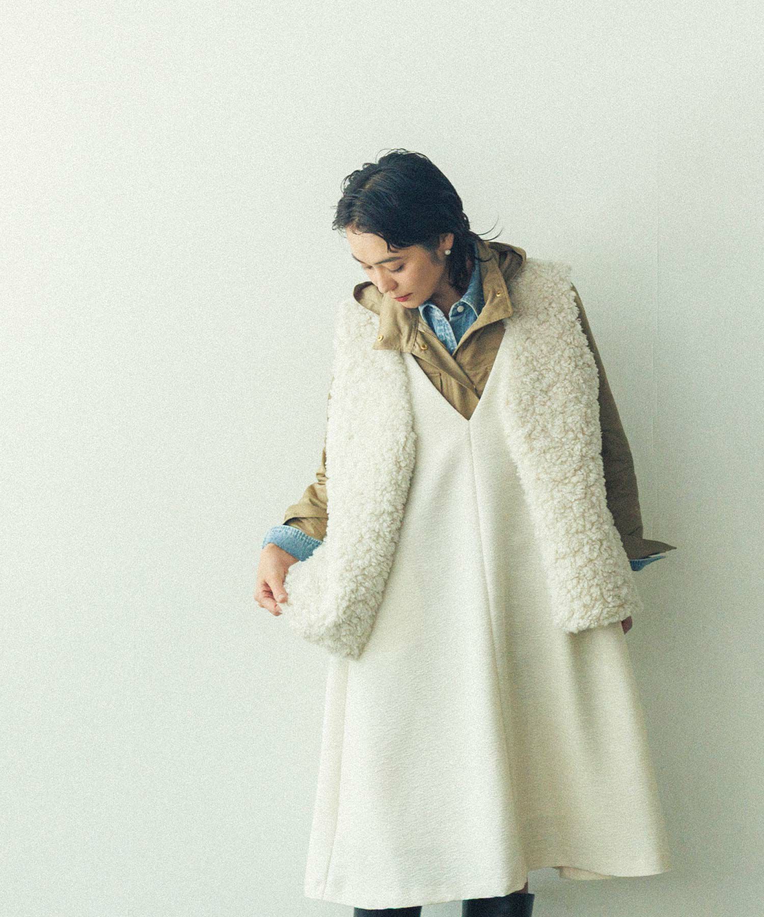 エコファーながらリアルで高級感ある素材感で、リアルなカーリーファーが洗礼された大人女子の雰囲気にマッチ。