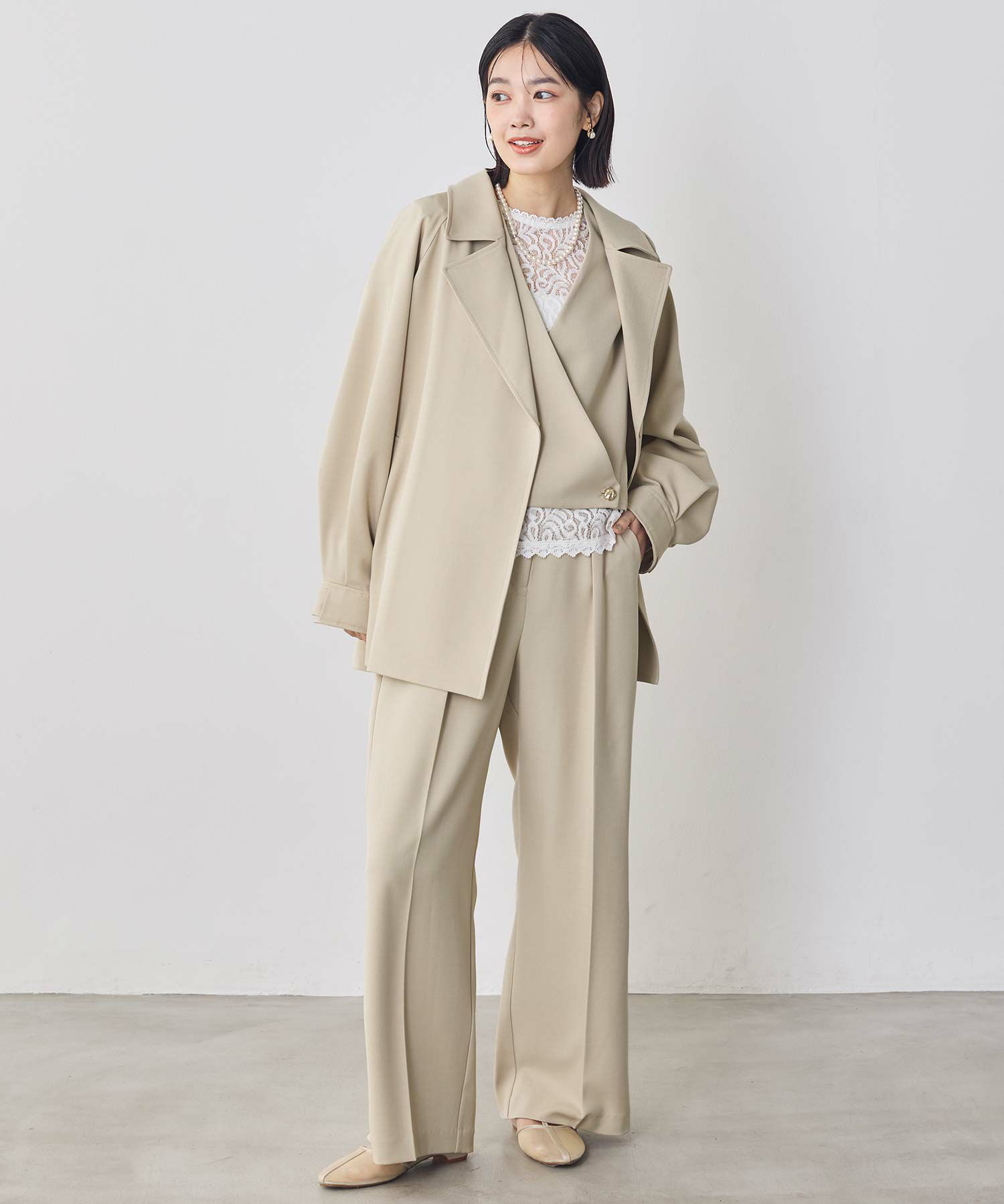 同素材のカシュクールベスト(OEO1034422003)・インタックセミワイド(OEO1034426001)と合わせて3ピースでの着こなしもオススメ。