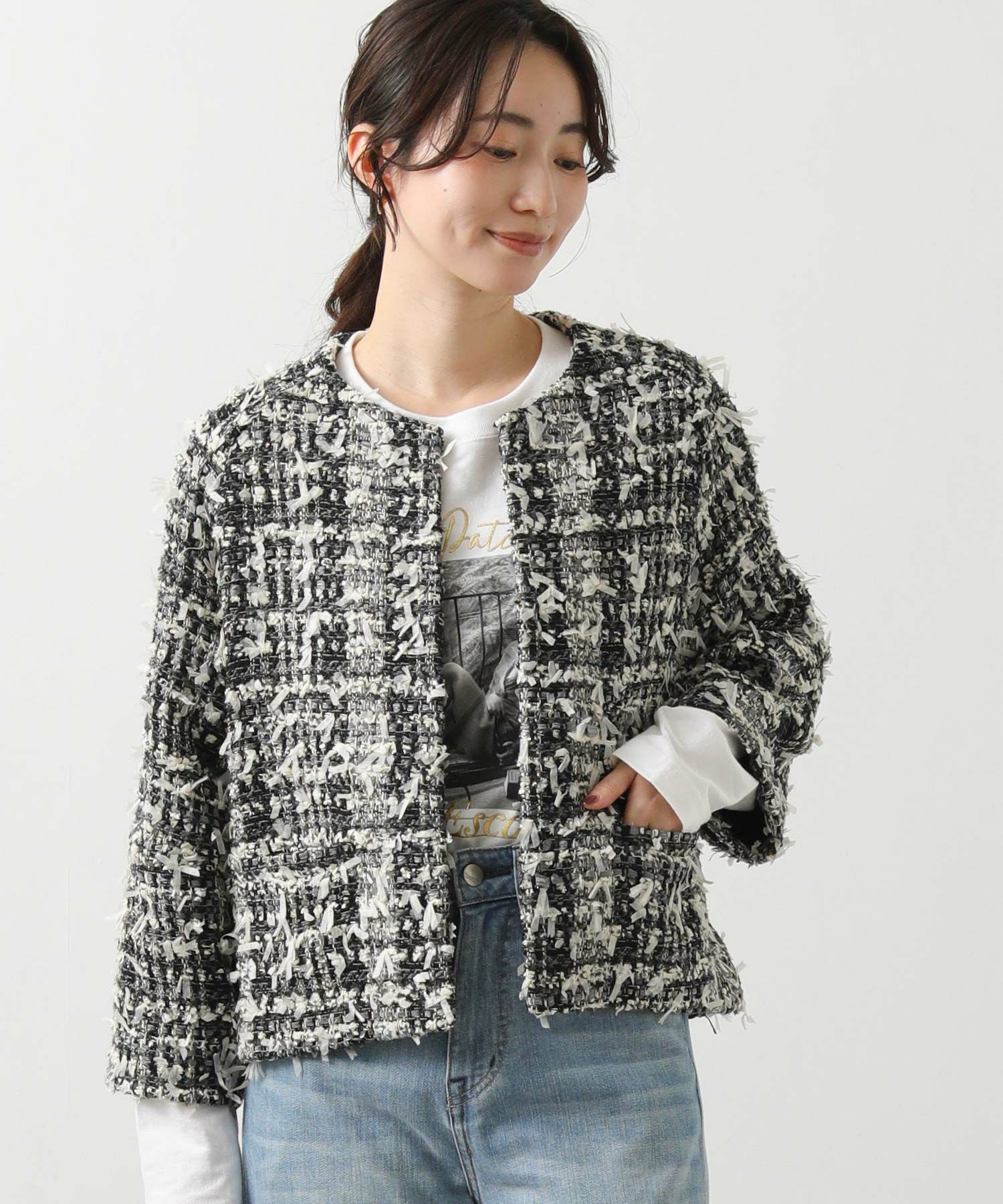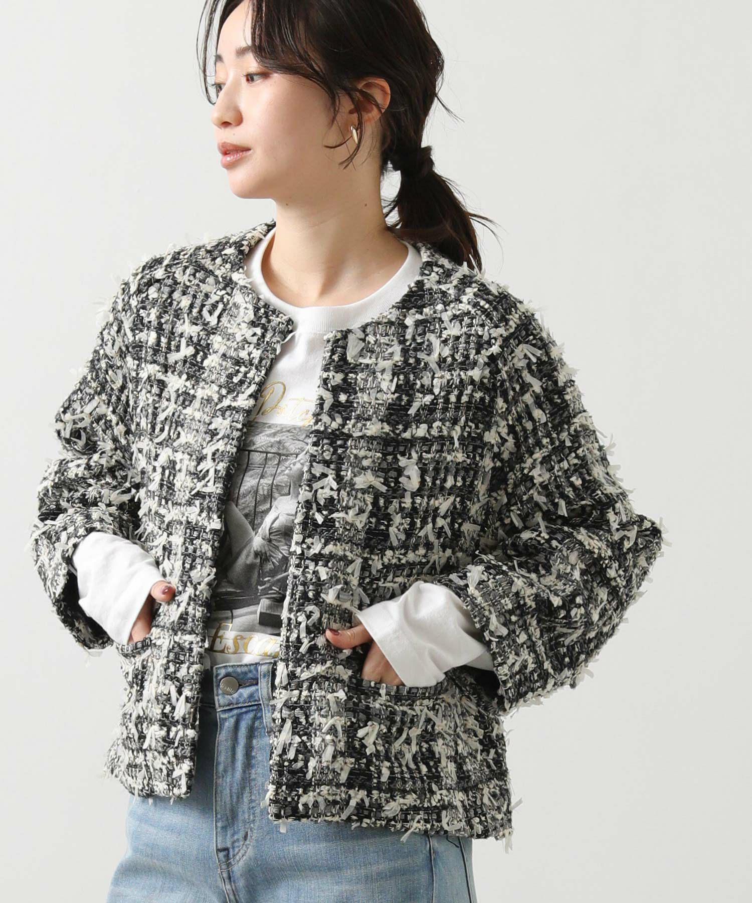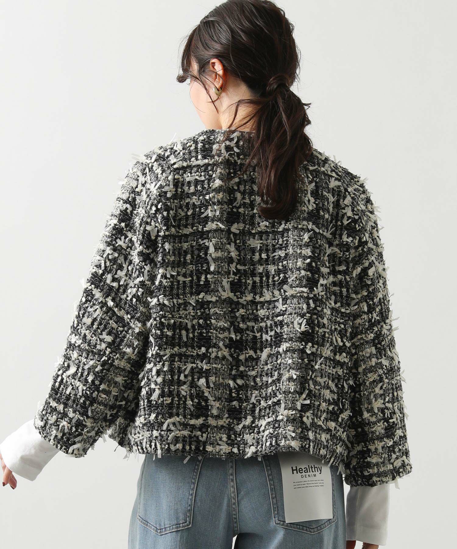 ツイードジャケット特有のカチッとした着難さをなくした、ラグランスリーブと丸みのあるシルエット、身幅もゆったりしているので窮屈感なく柔らかい印象で着用できます。