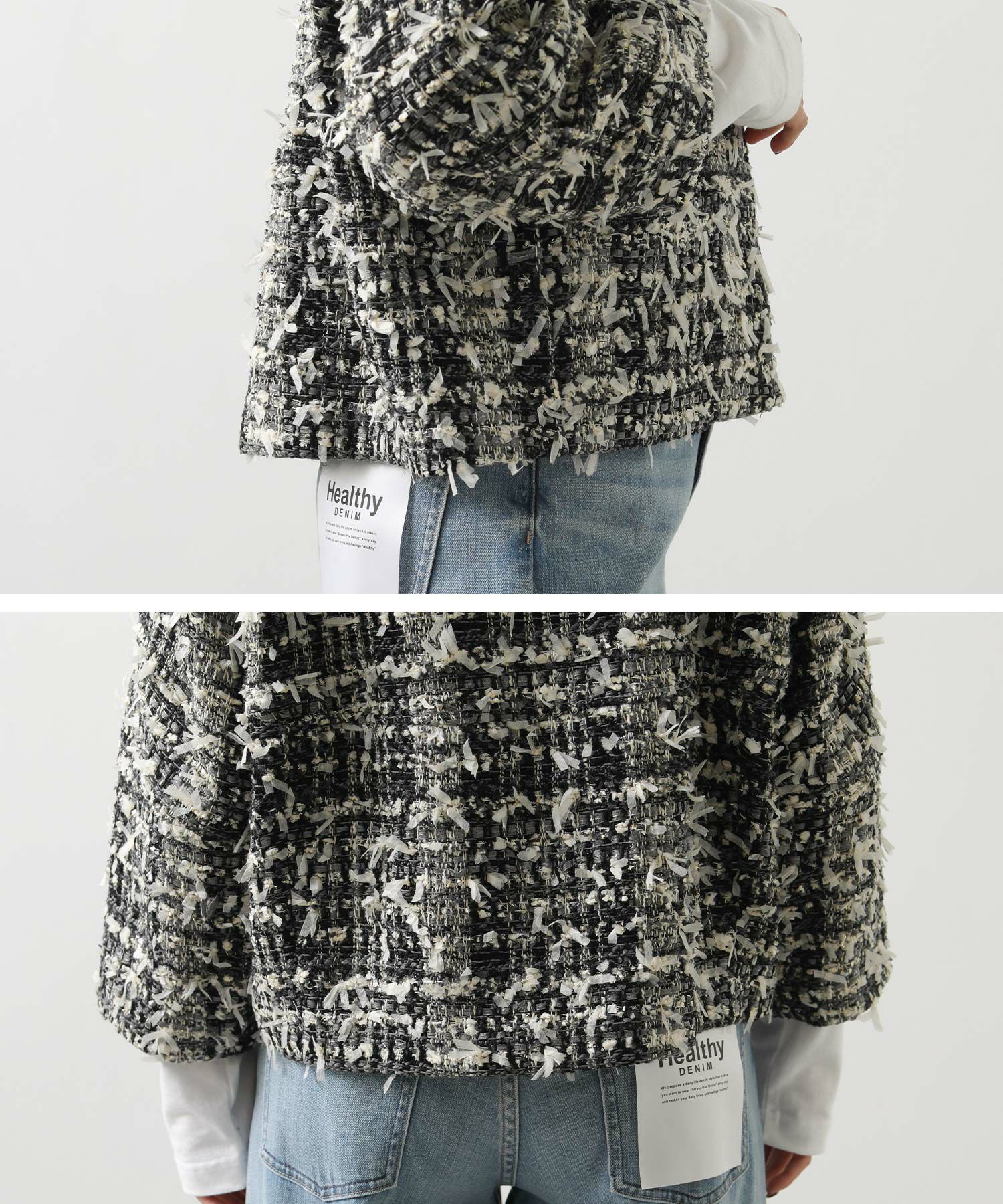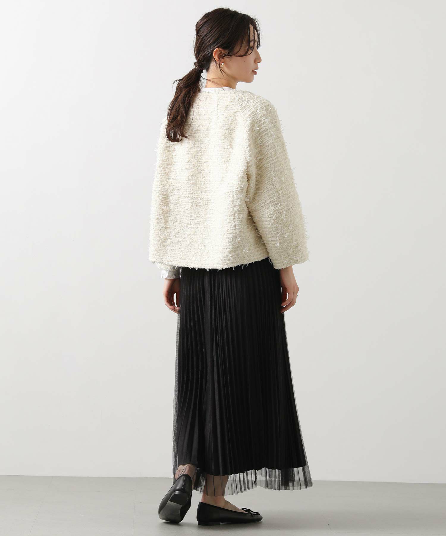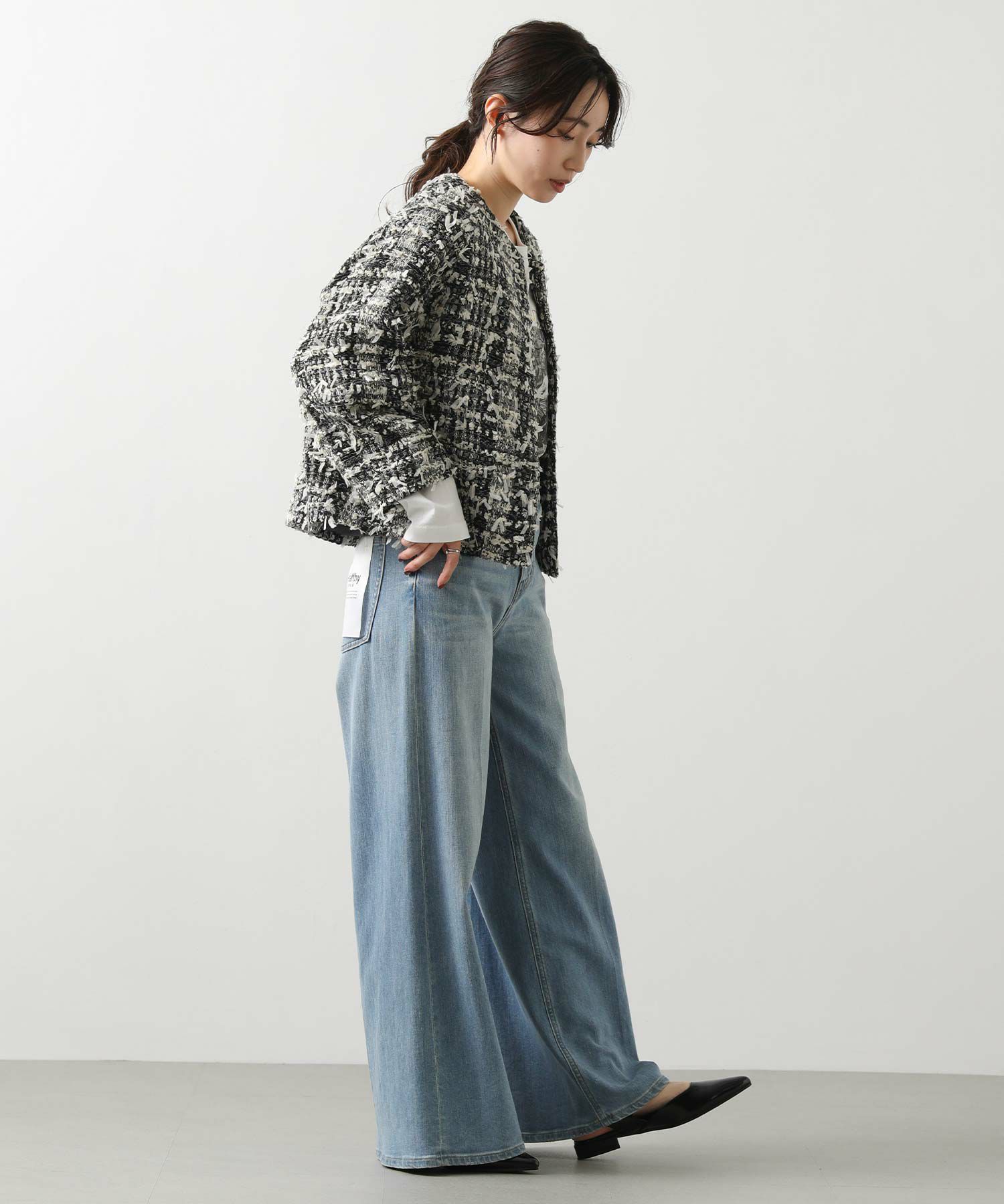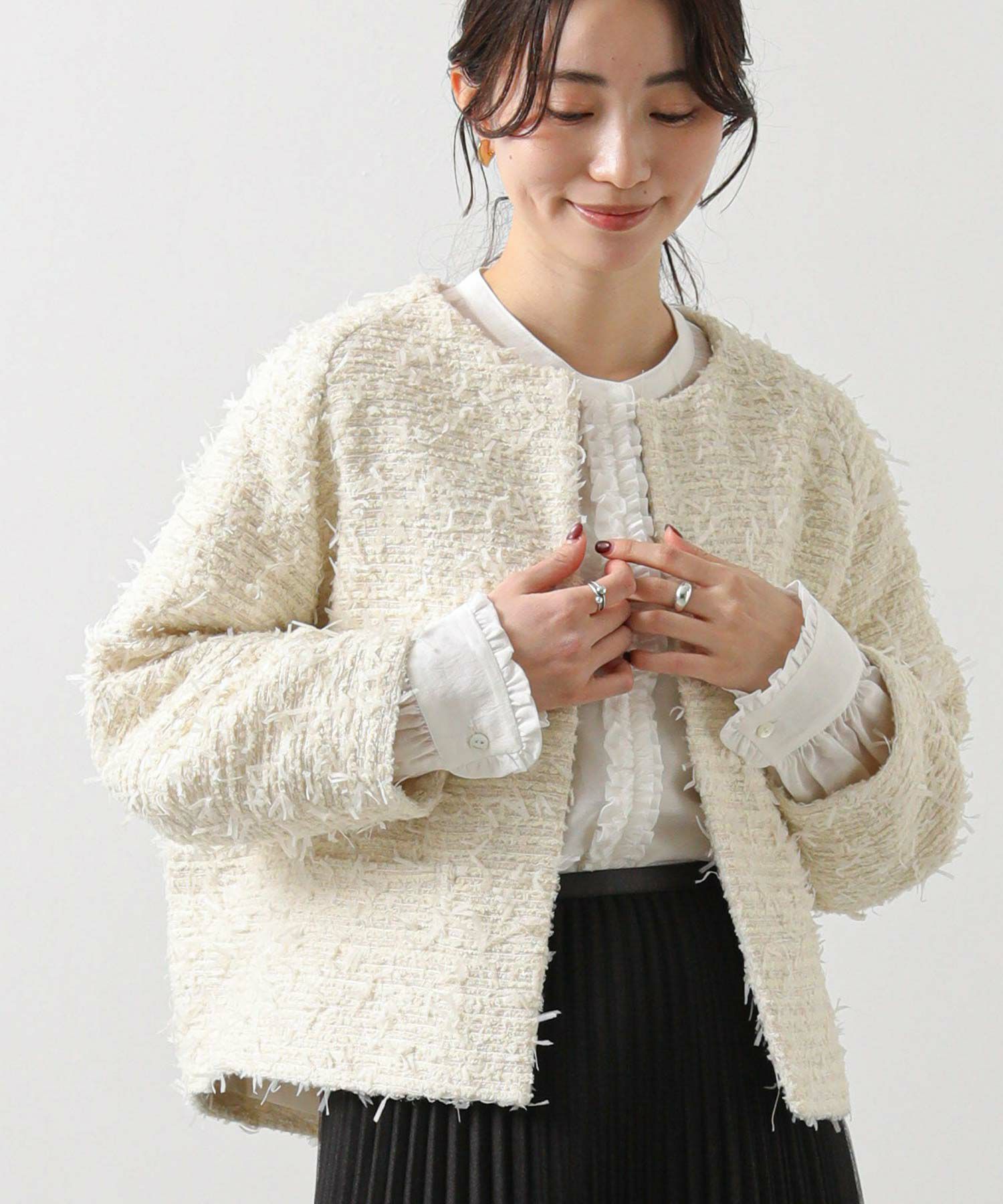 ツイードジャケット特有のカチッとした着難さをなくした、ラグランスリーブと丸みのあるシルエット、身幅もゆったりしているので窮屈感なく柔らかい印象で着用できます。