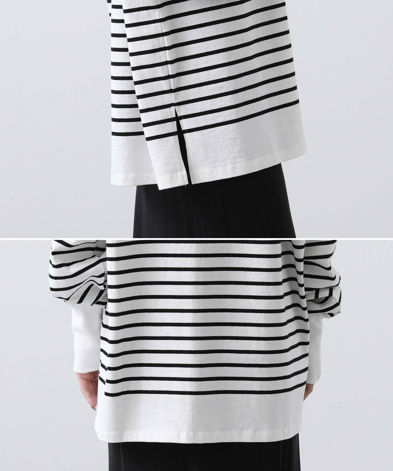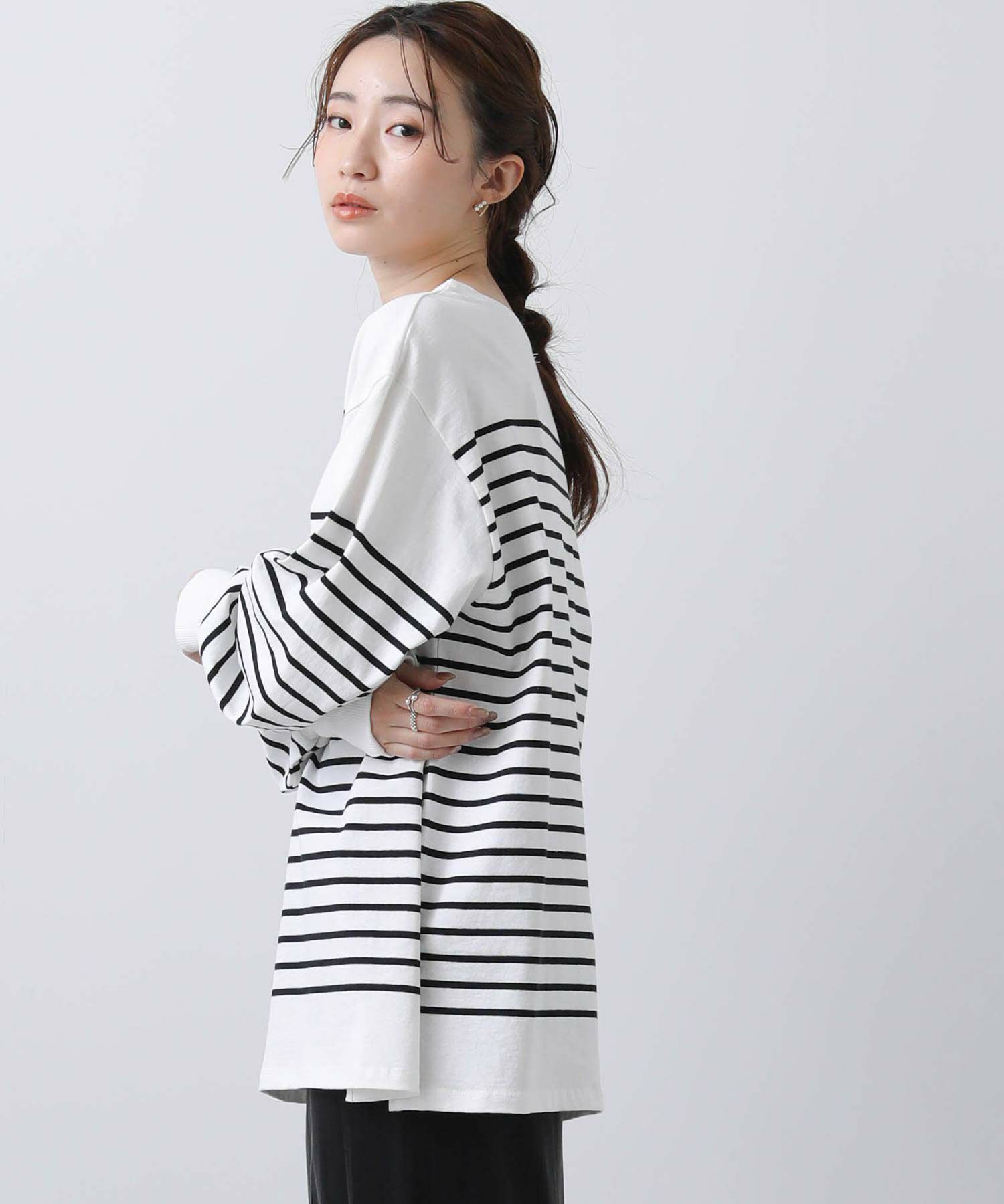 定番のボーダーロングTシャツも、ゆったりめのオーバーサイズと袖口のリブでトレンド感あるデザインに。