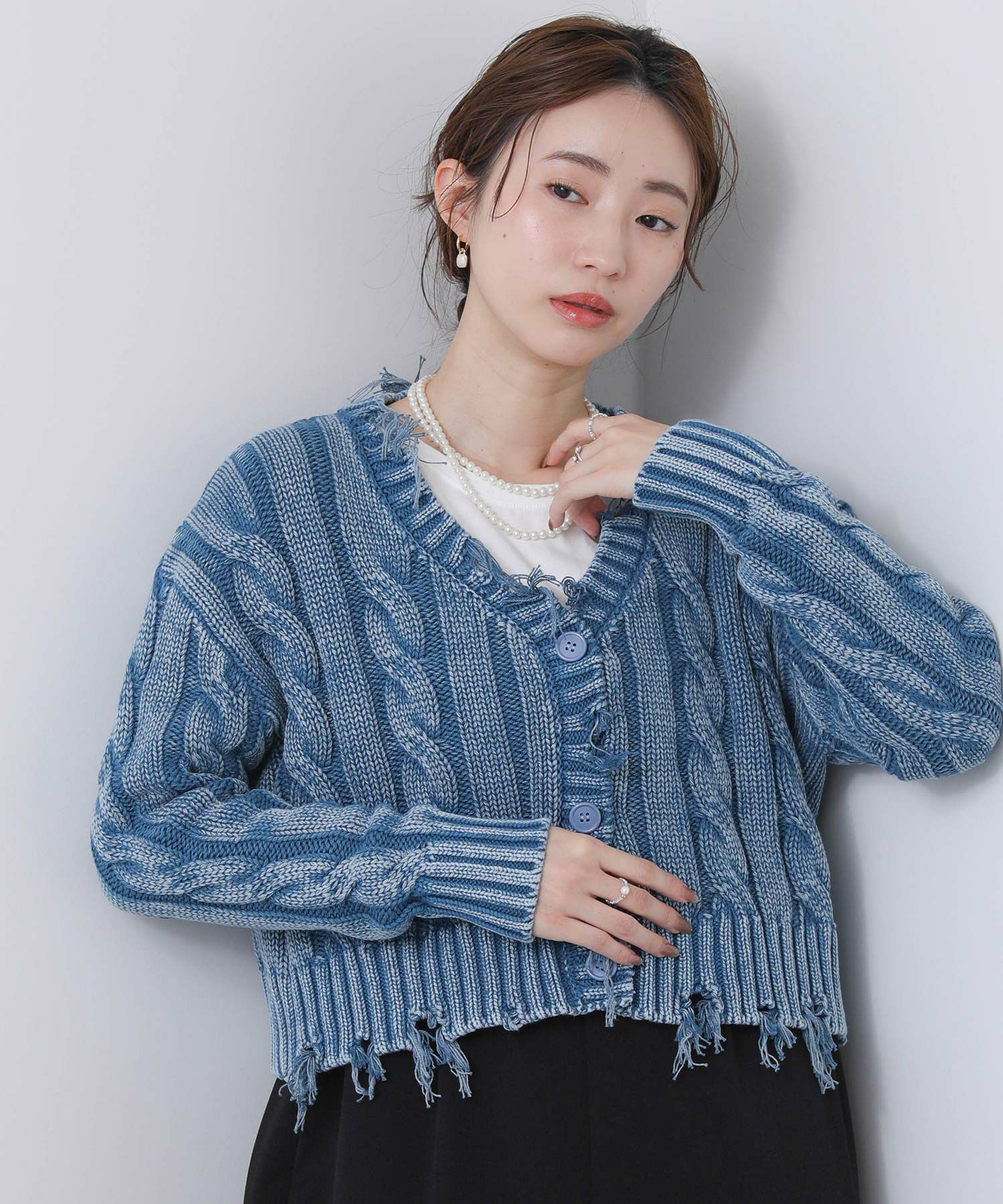 コンパクト見えする短い丈が旬なスタリングに導き、ユーズドデニムのようなカラーリングが、こなれた印象を演出します。