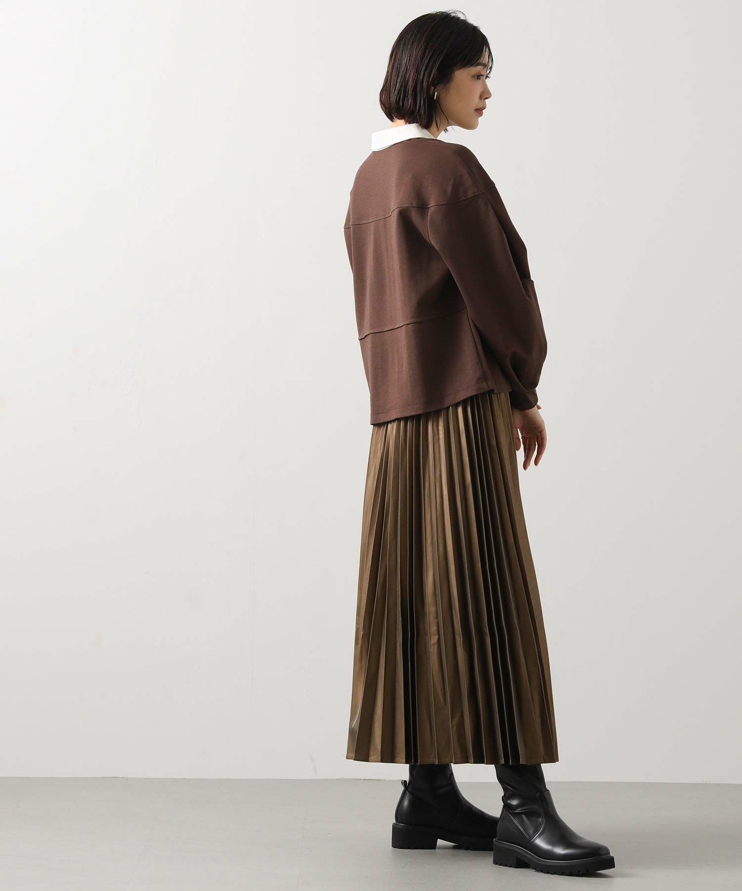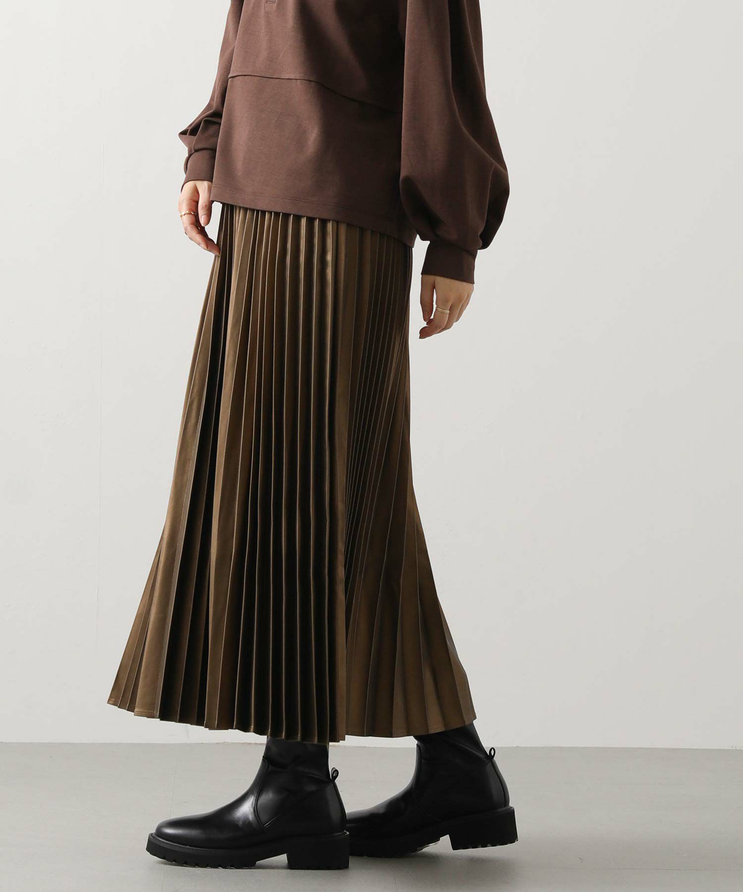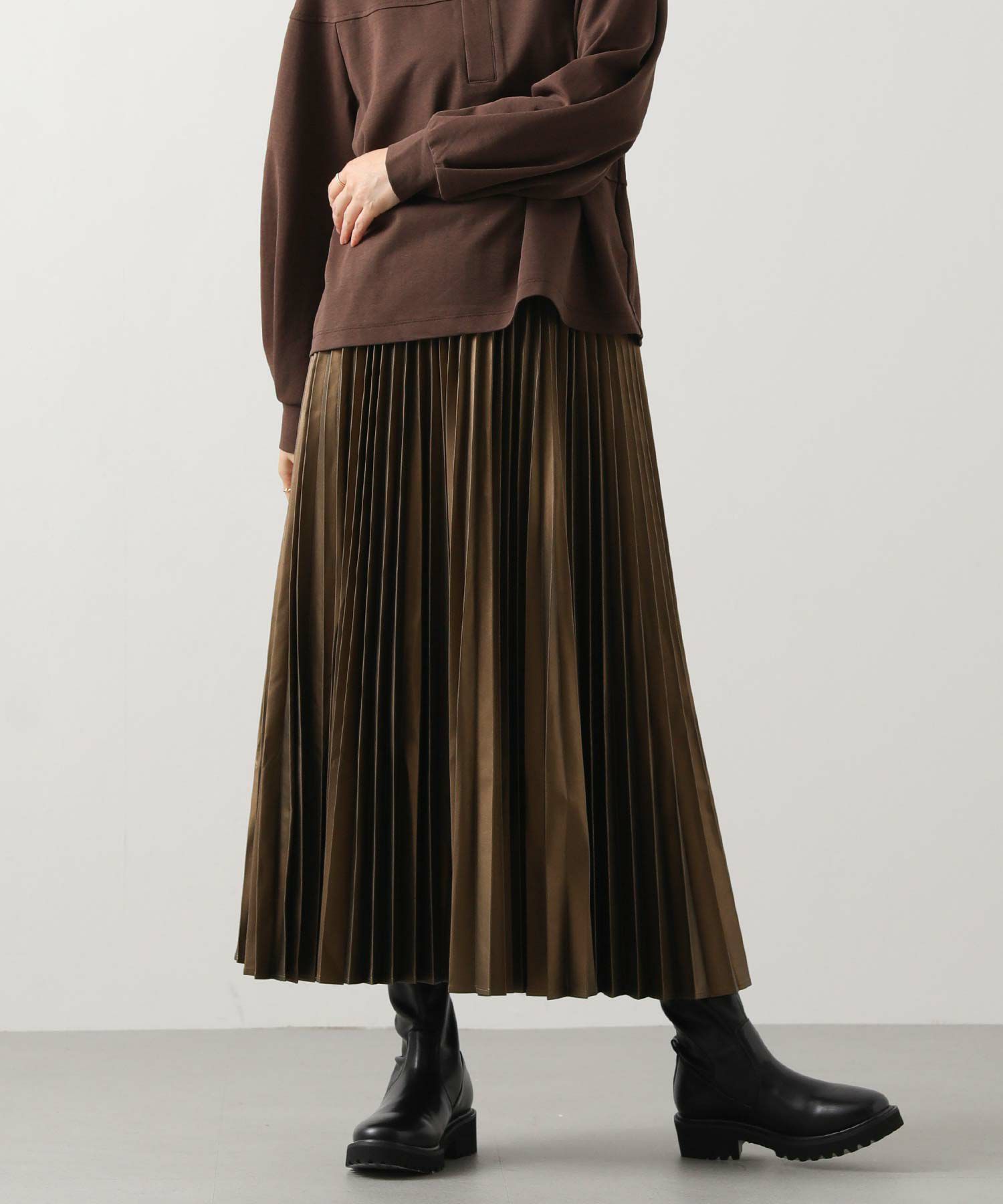さり気ないツヤ感のあるフェクレザーのモードな雰囲気とプリーツの掛け合わせで、甘くなりがちなプリーツスカートをマニッシュにアップデート。