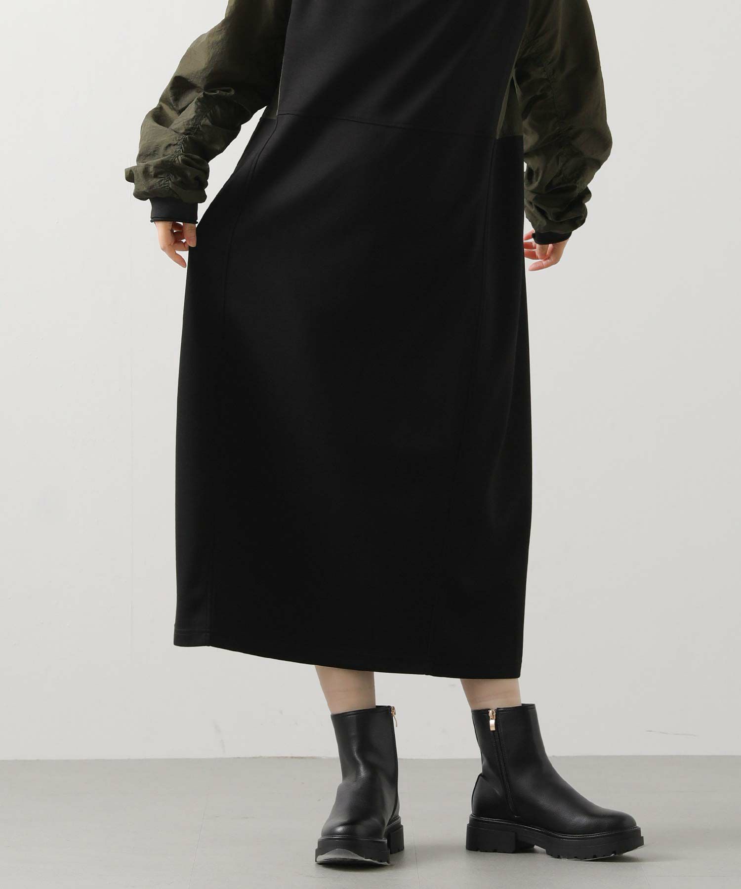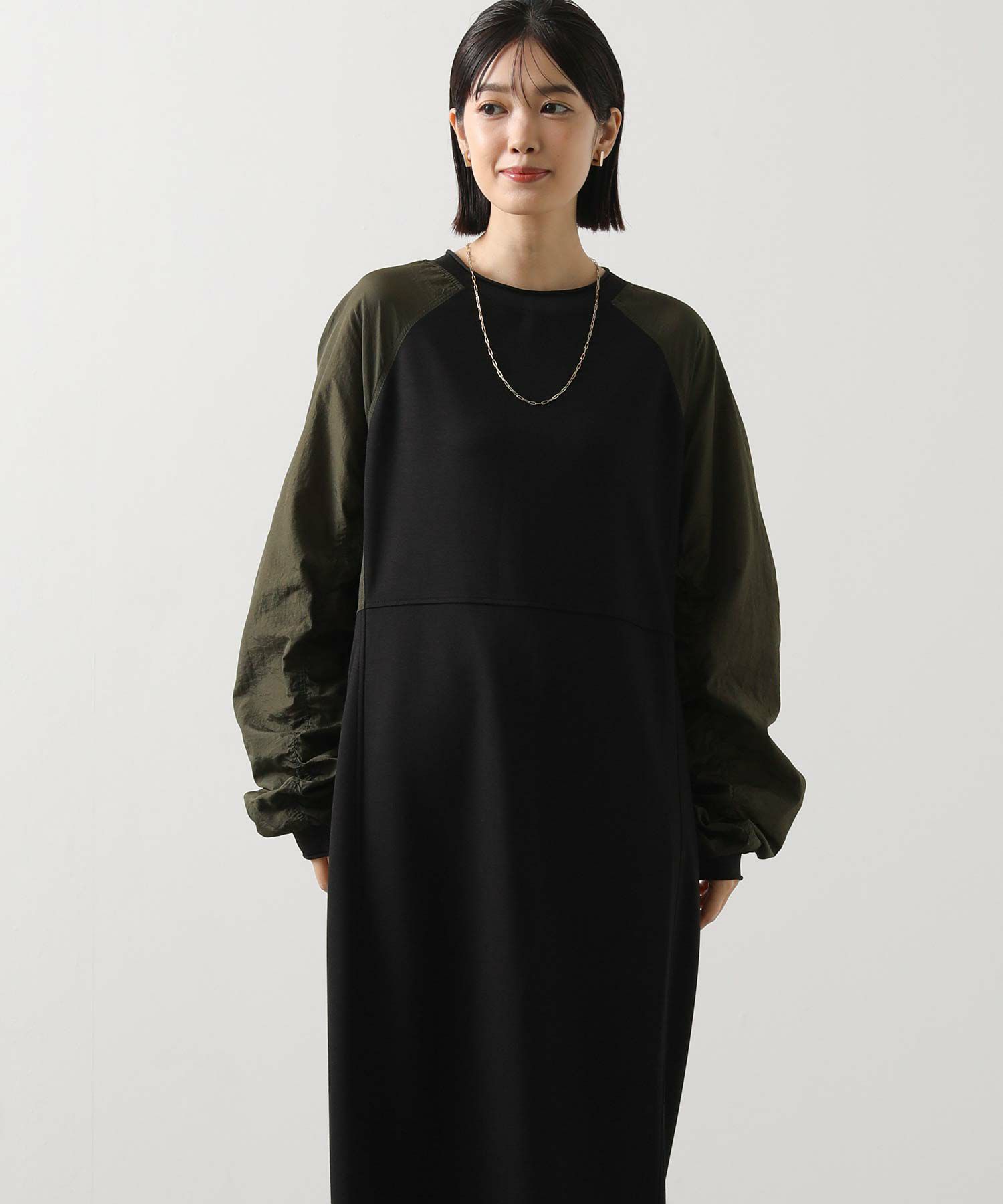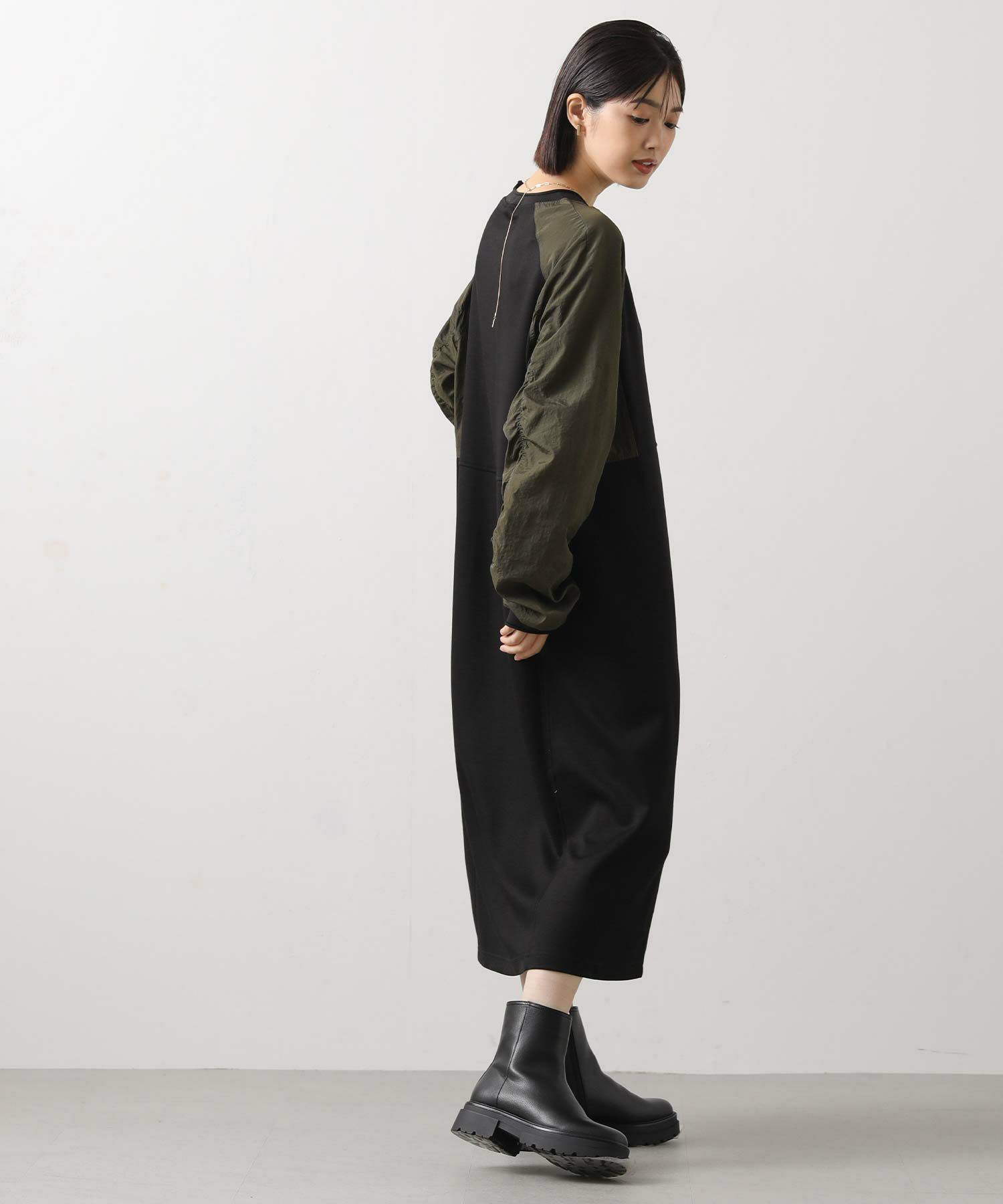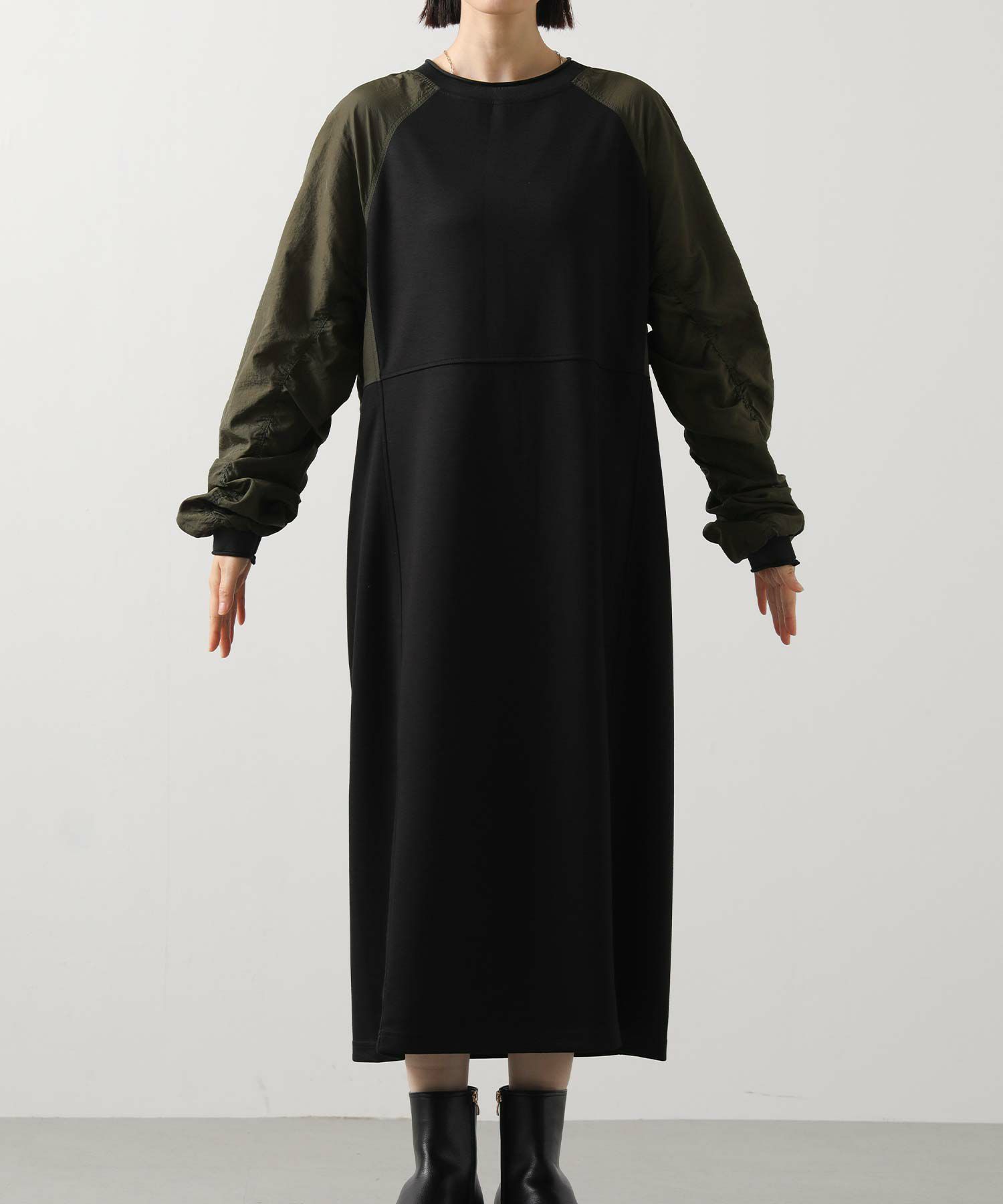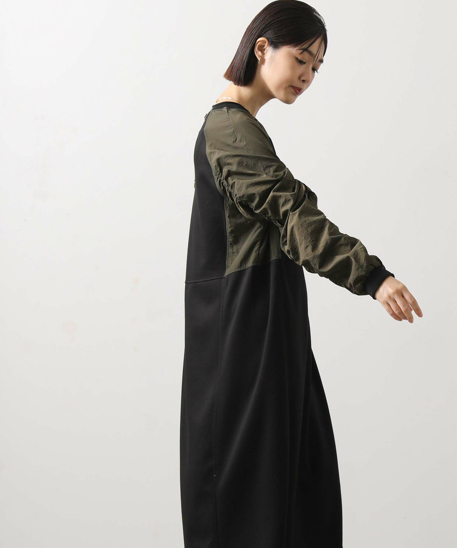 ワッシャーの軽やかな質感と、柔らかなカットソー素材を組み合わせたドッキングワンピース。