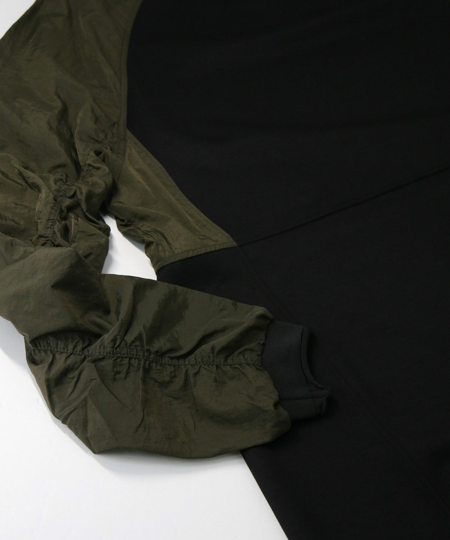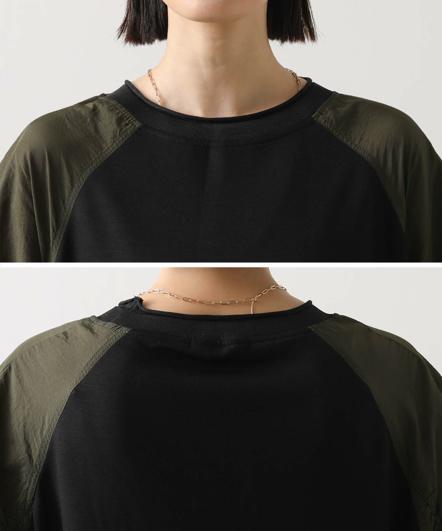 身頃は肌触りのよいカットソーでリラックス感がありながらも、ラグランスリーブと袖下のシャーリングが立体感を生み出し、動きのある華やかな表情を演出します。