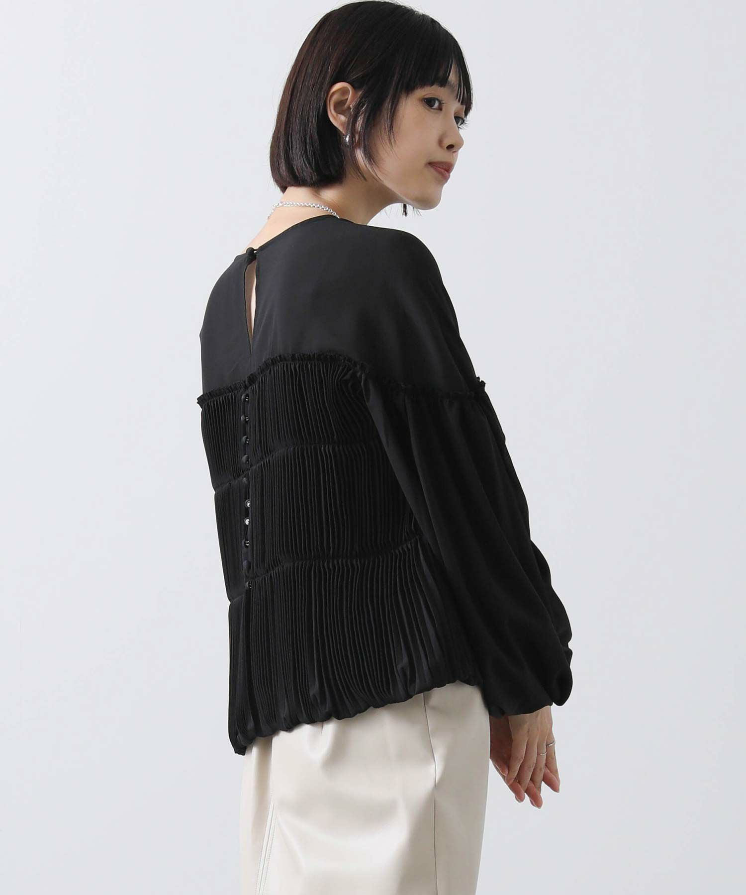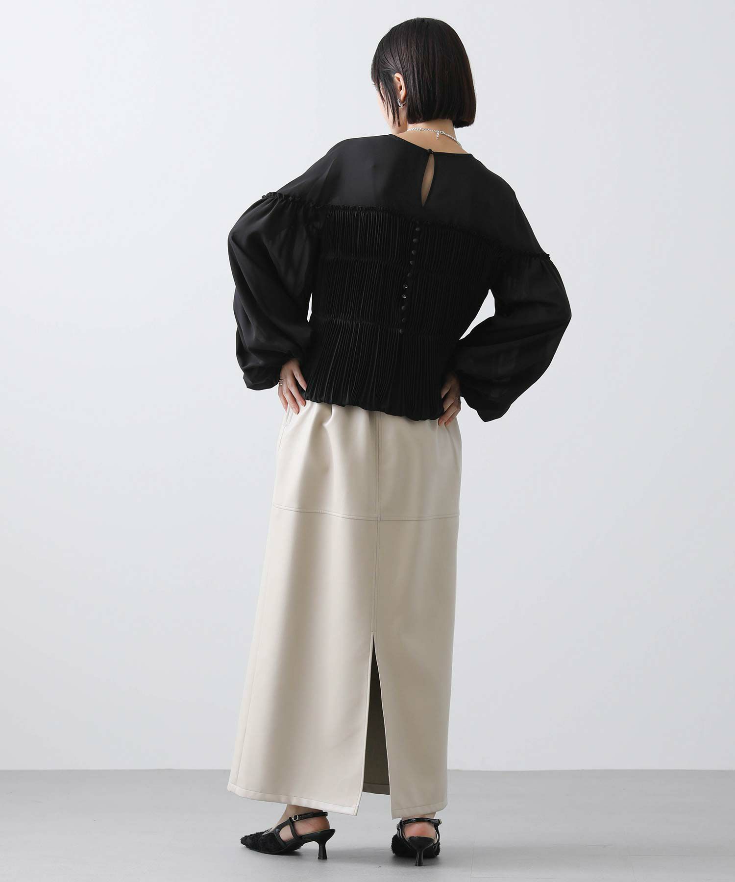 身頃にプリーツとシャーリングを寄せたビスチェデザインで、スタイルアップが叶います。