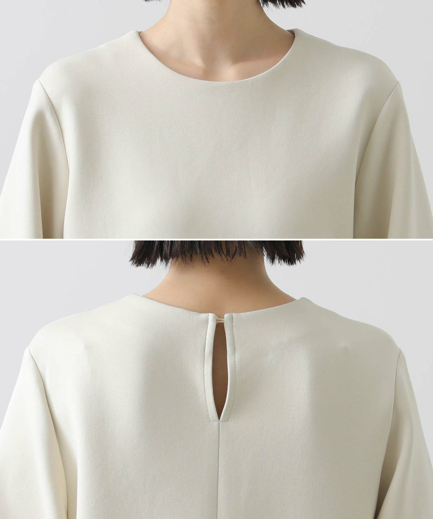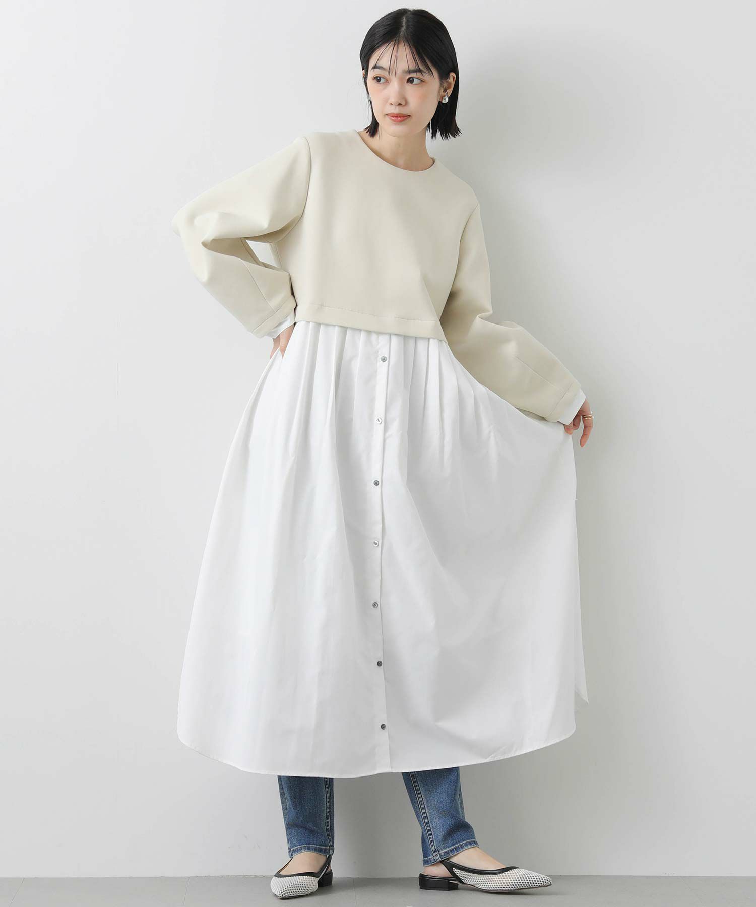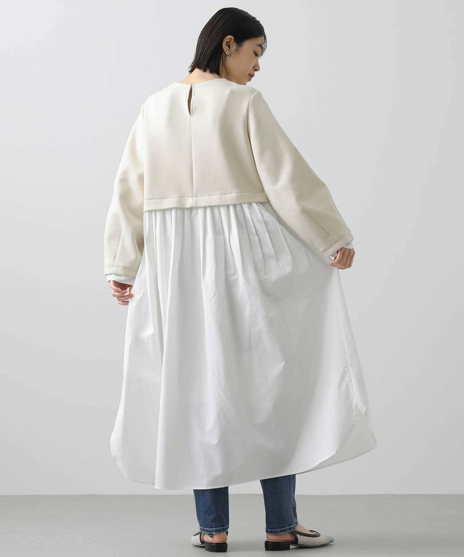 ウエストを少し高めの位置で切り替えて、スタイルアップして見えるバランスに仕上げました。