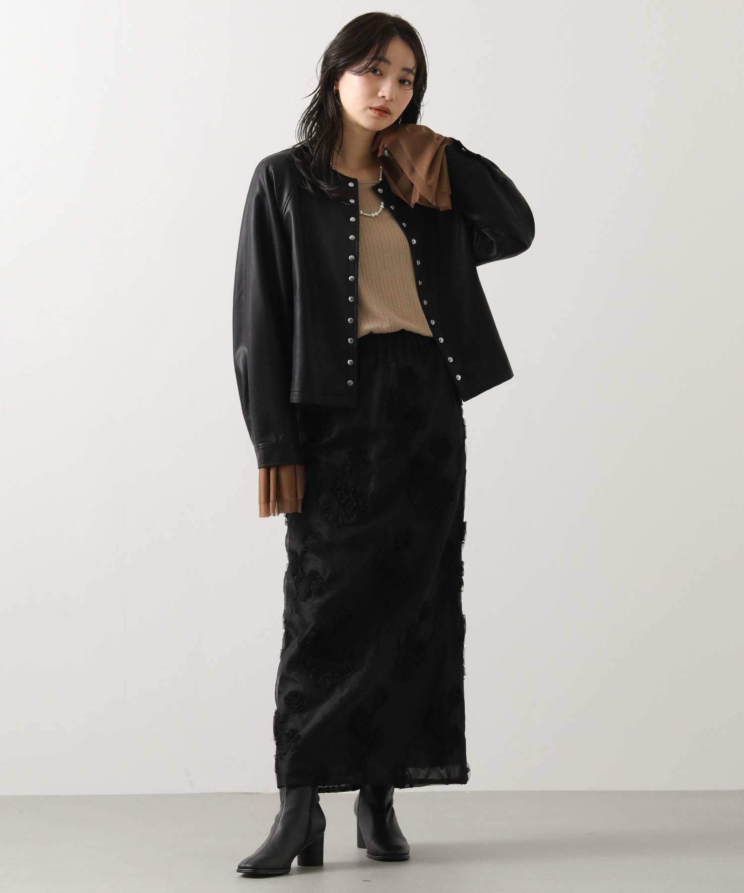 オーガンジーにチュールで刺繍を施した立体感のある素材が、スタイリングにアクセントをつけてくれます。ウエストはグログランテープを使用して、インスタイルも決まるデザインになっています。