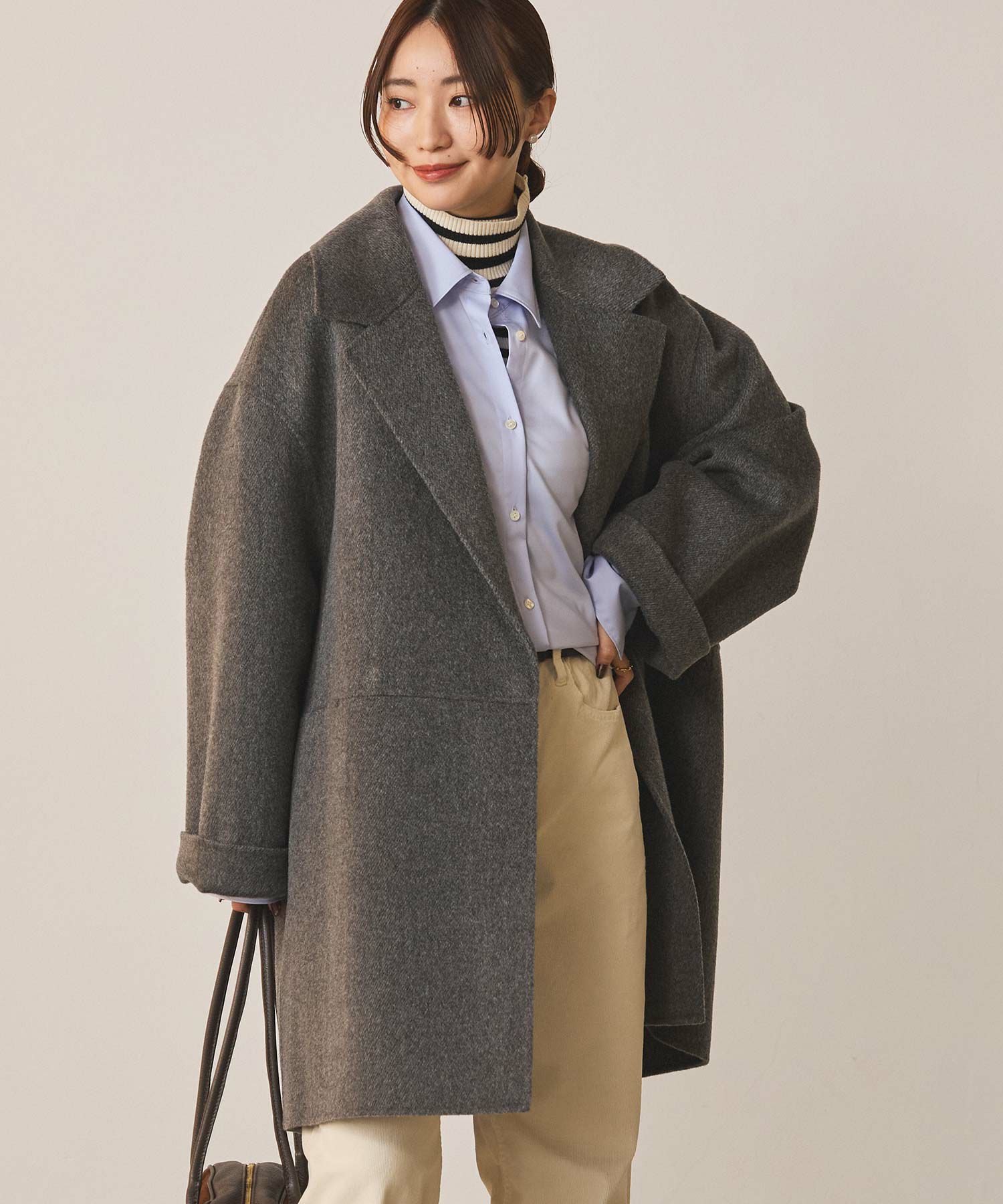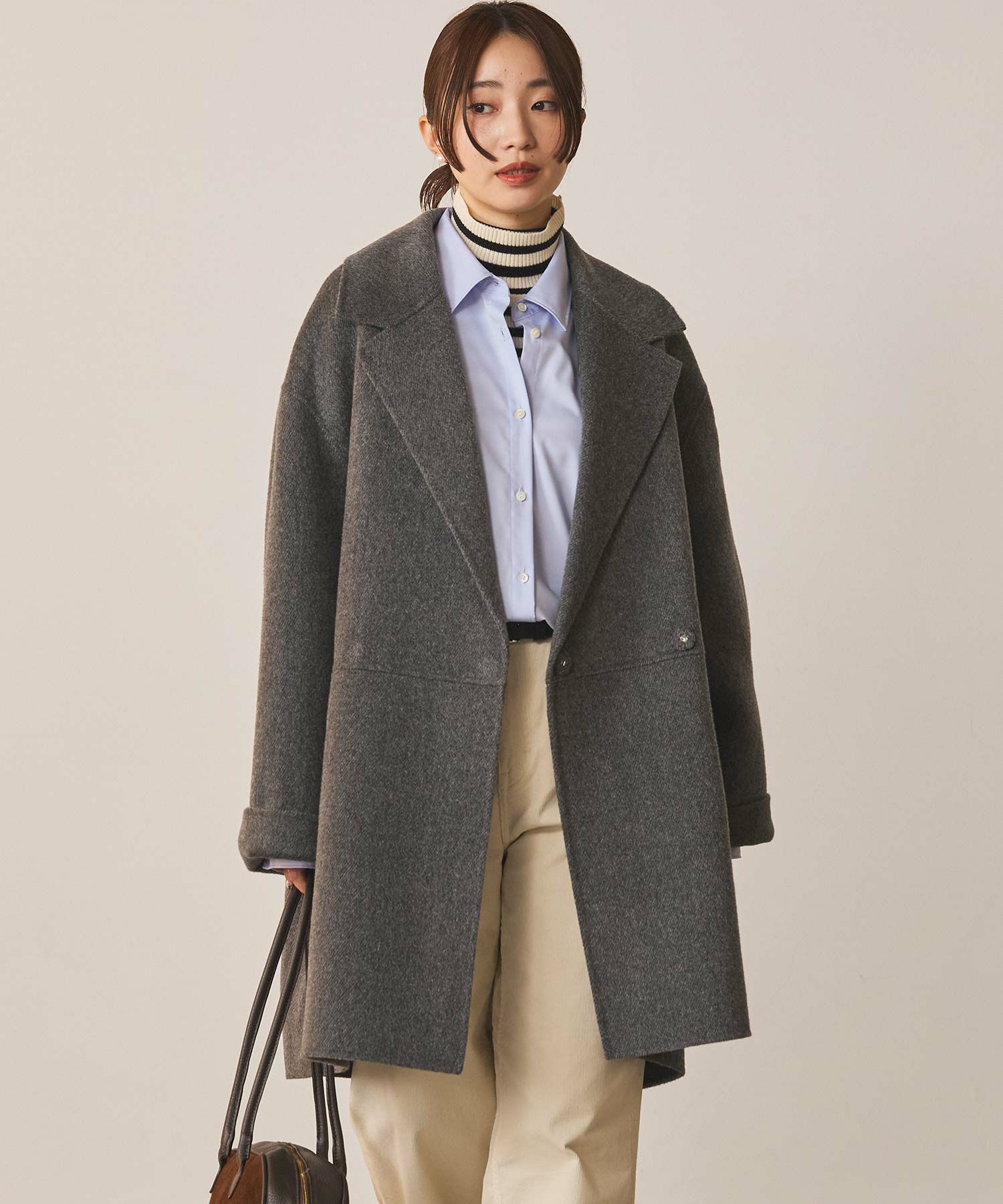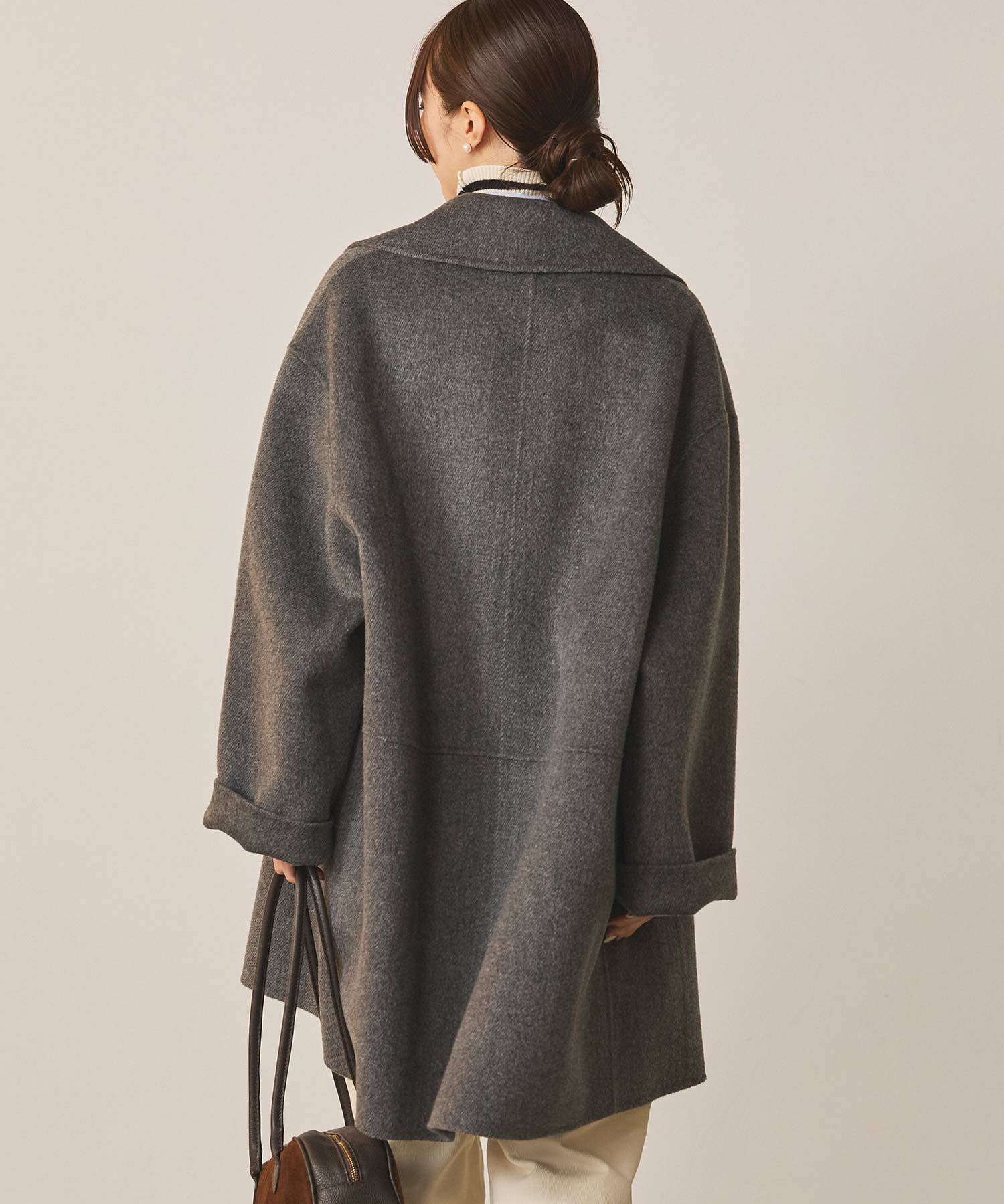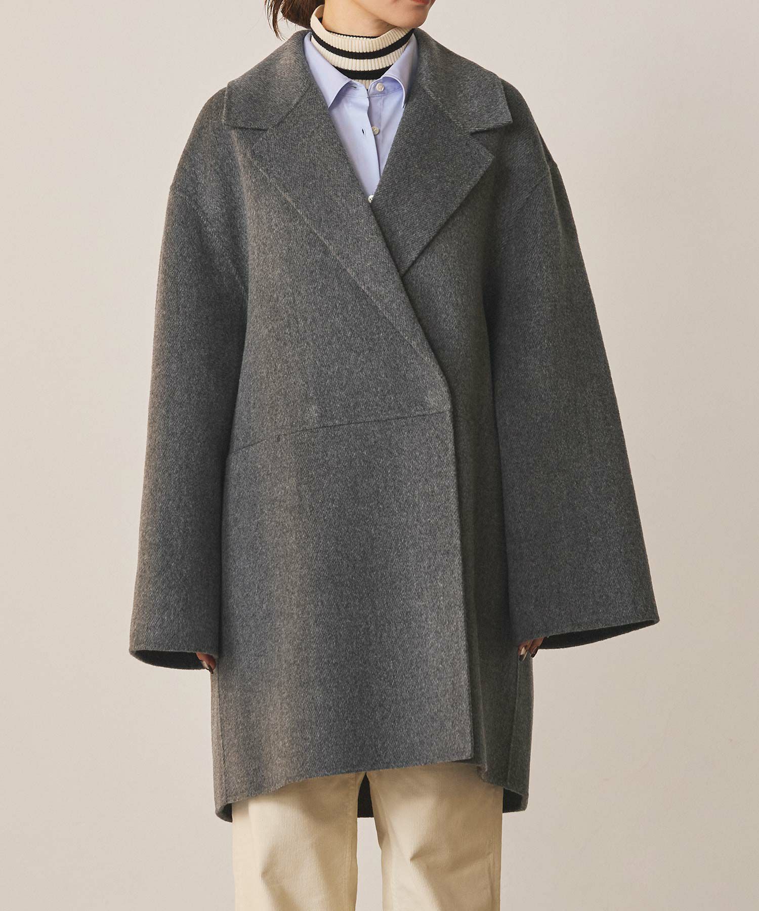 テーラーの大襟が新鮮で女性らしさのあるハーフコート。