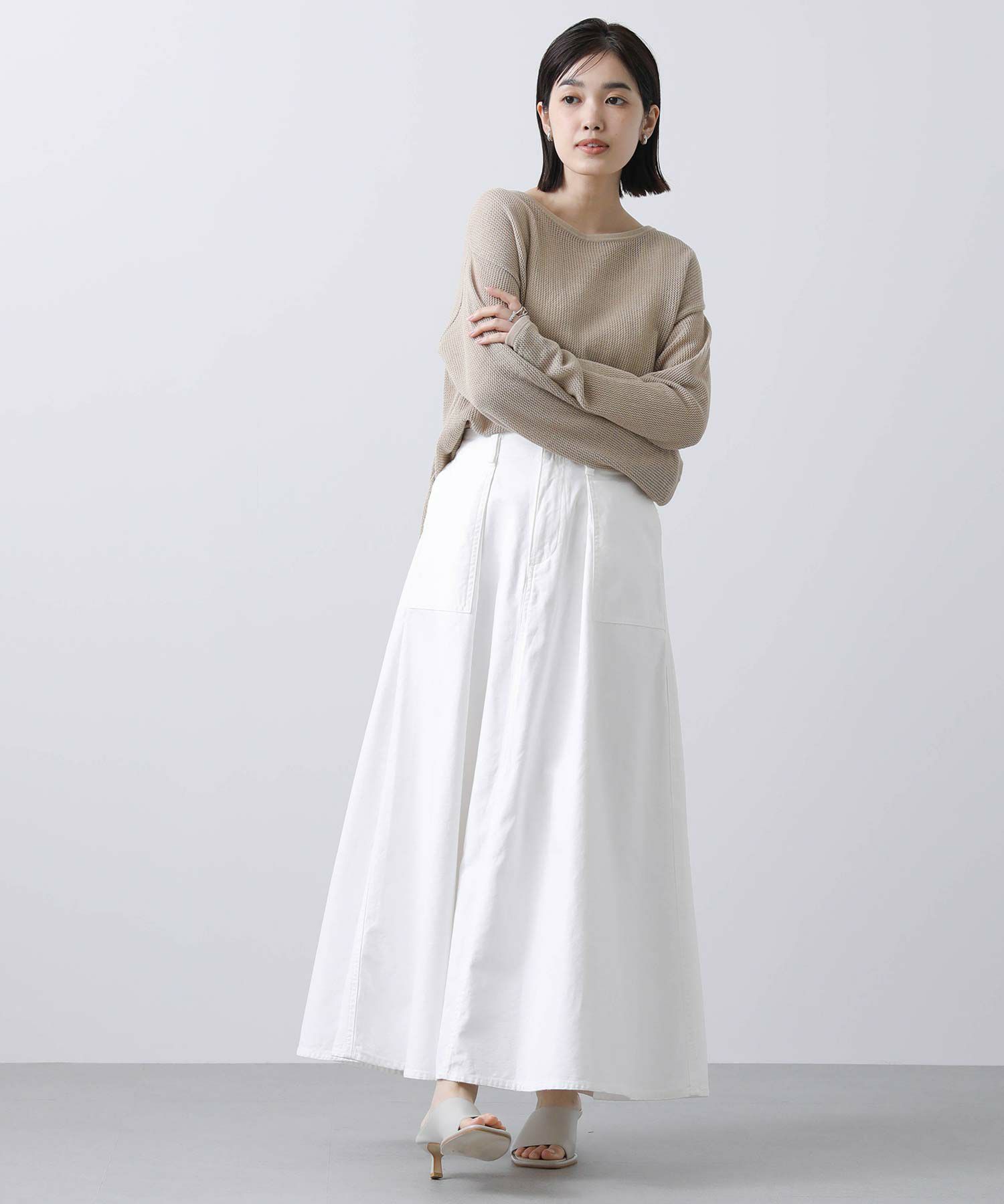 【Healthydenim/ヘルシーデニム】から、ウエストにタックを入れ、程よいボリューム感のあるフレアシルエットのスカートをセレクト。