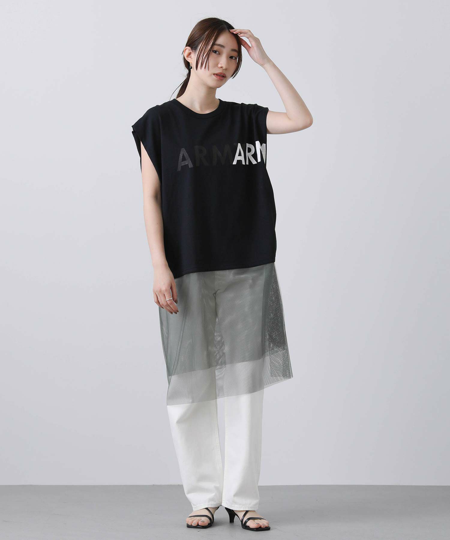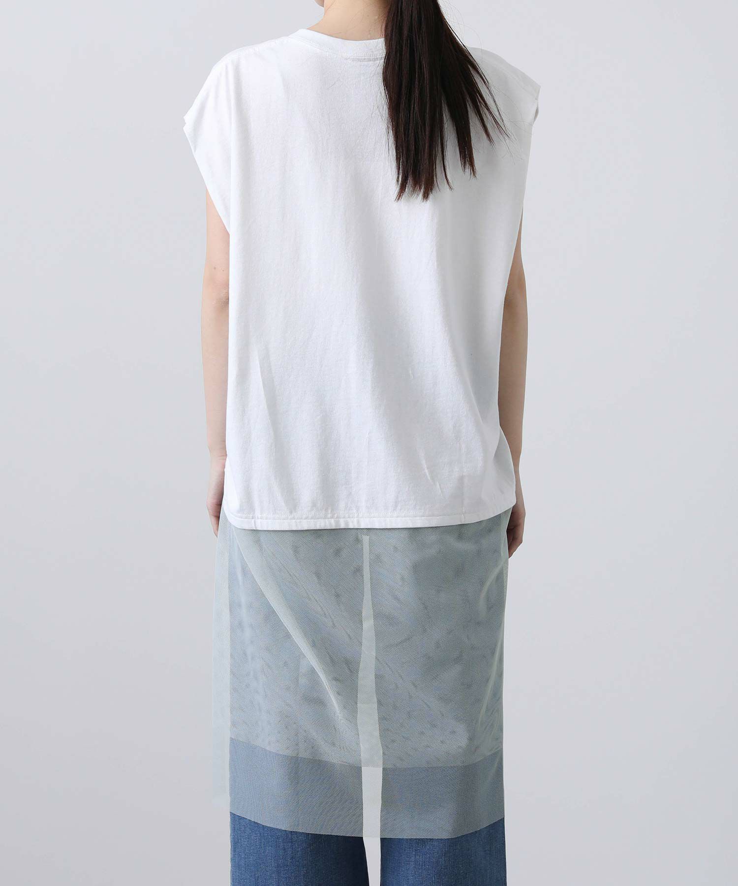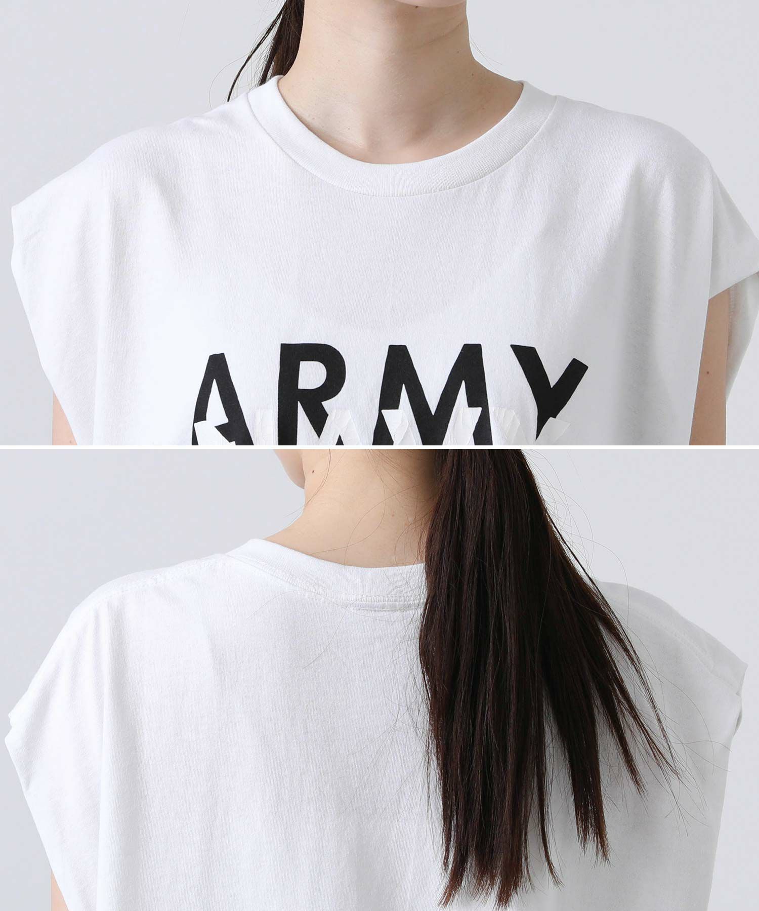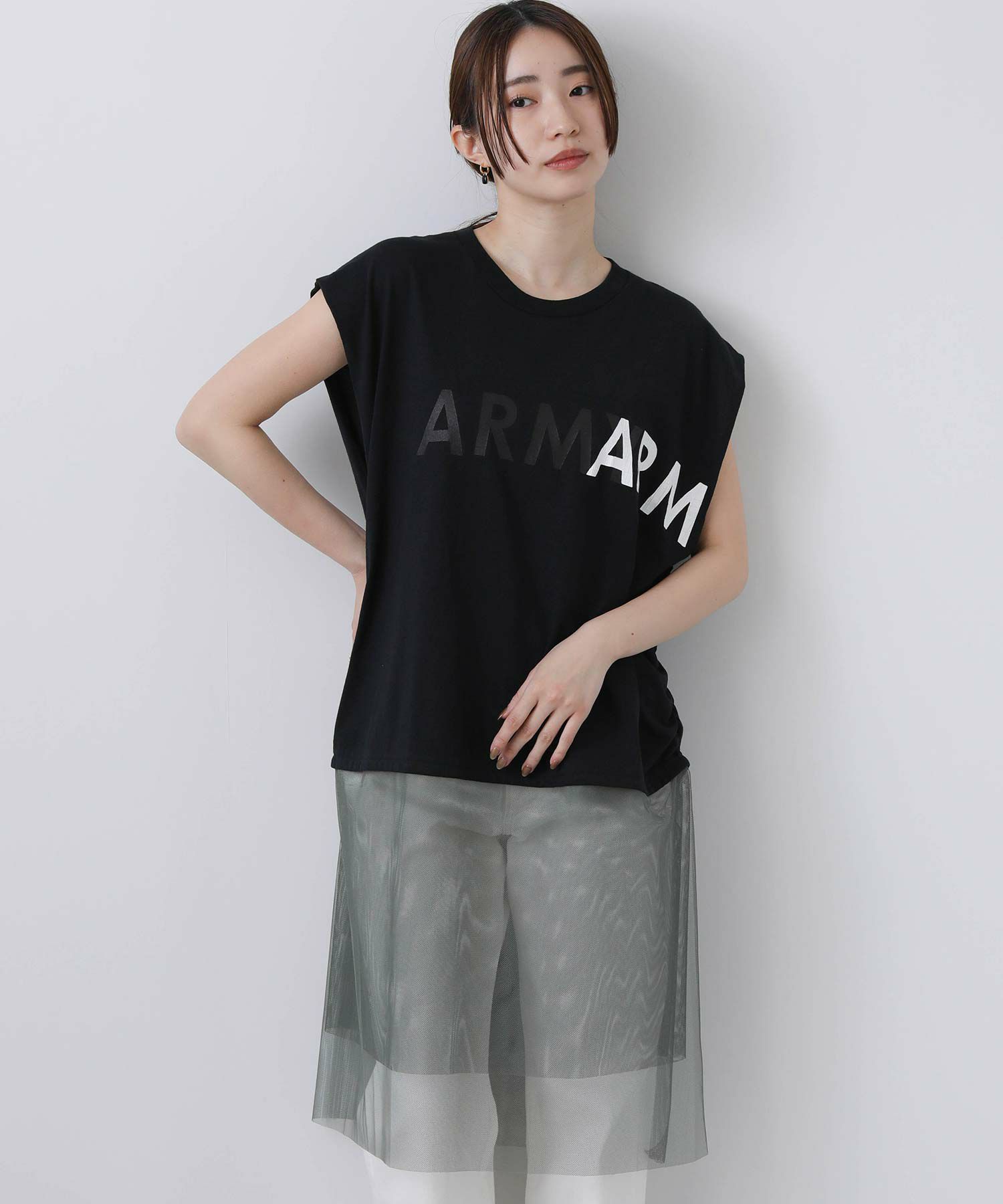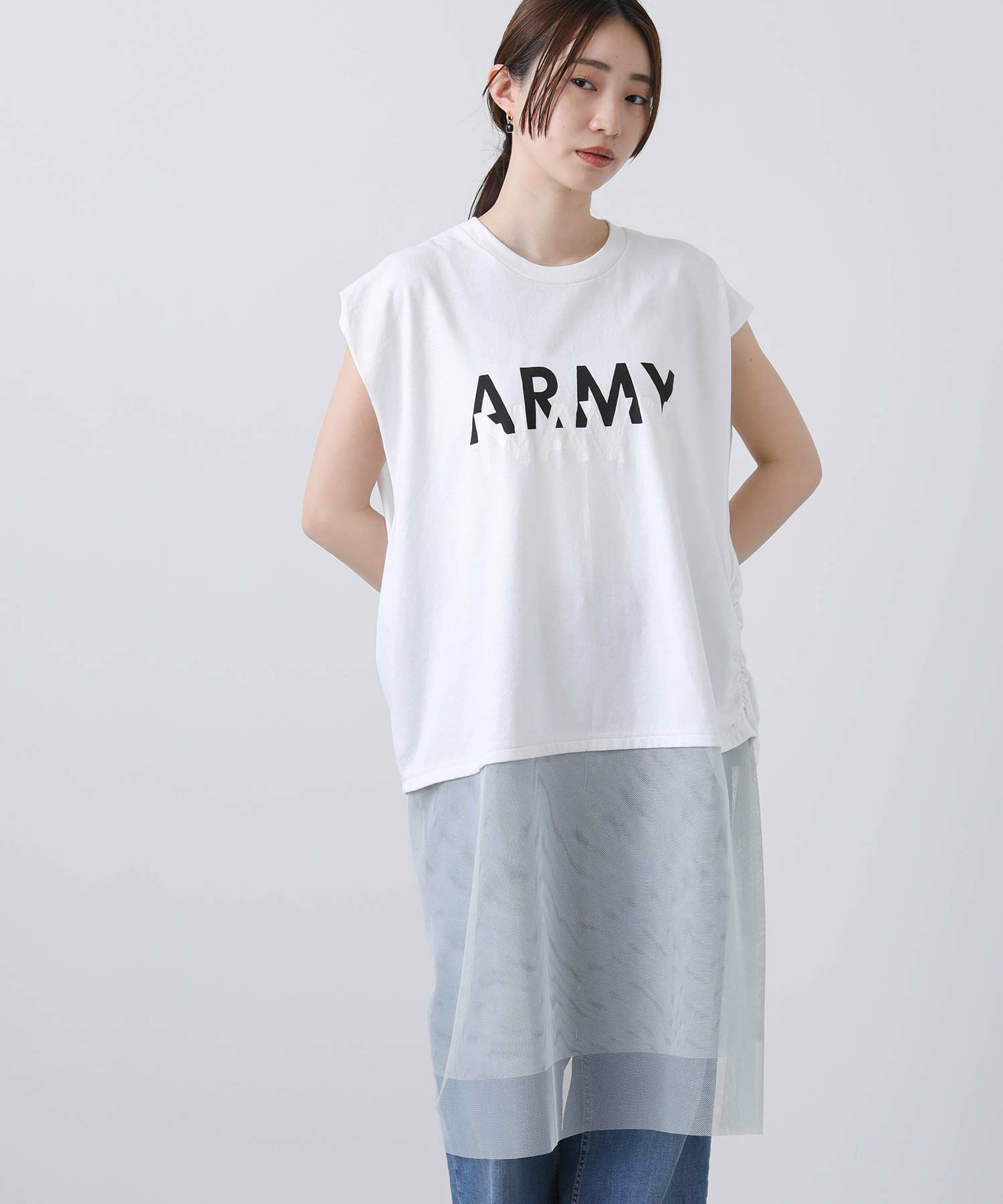 古着のミリタリーTシャツをリメイクするイメージでプリントを施し、袖はカットオフ、裾はチュールをドッキングし脇でギャザーを寄せたデザイン性のあるロゴTシャツ。