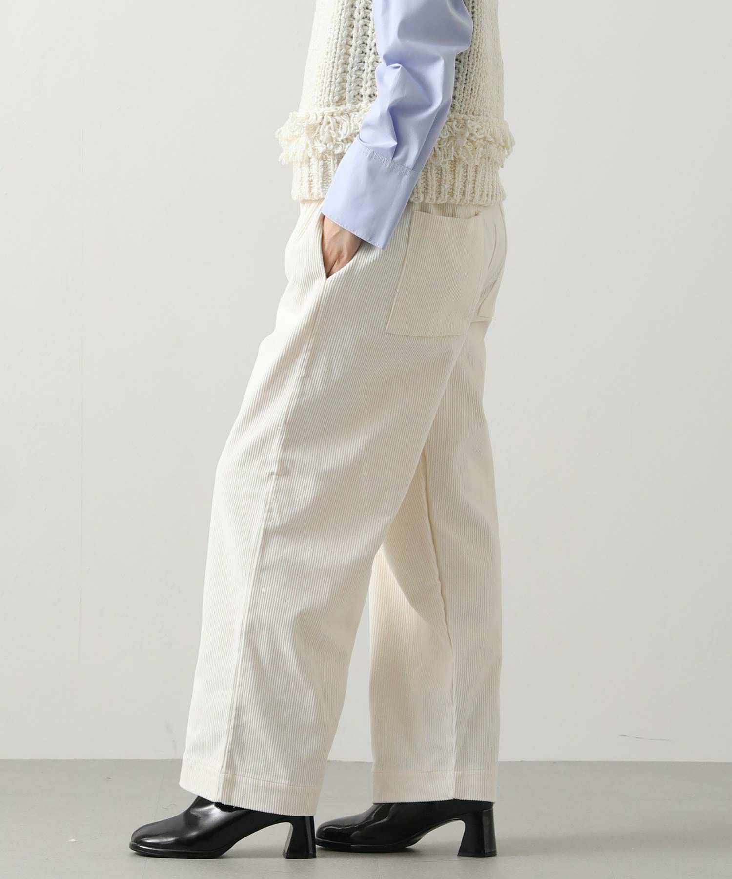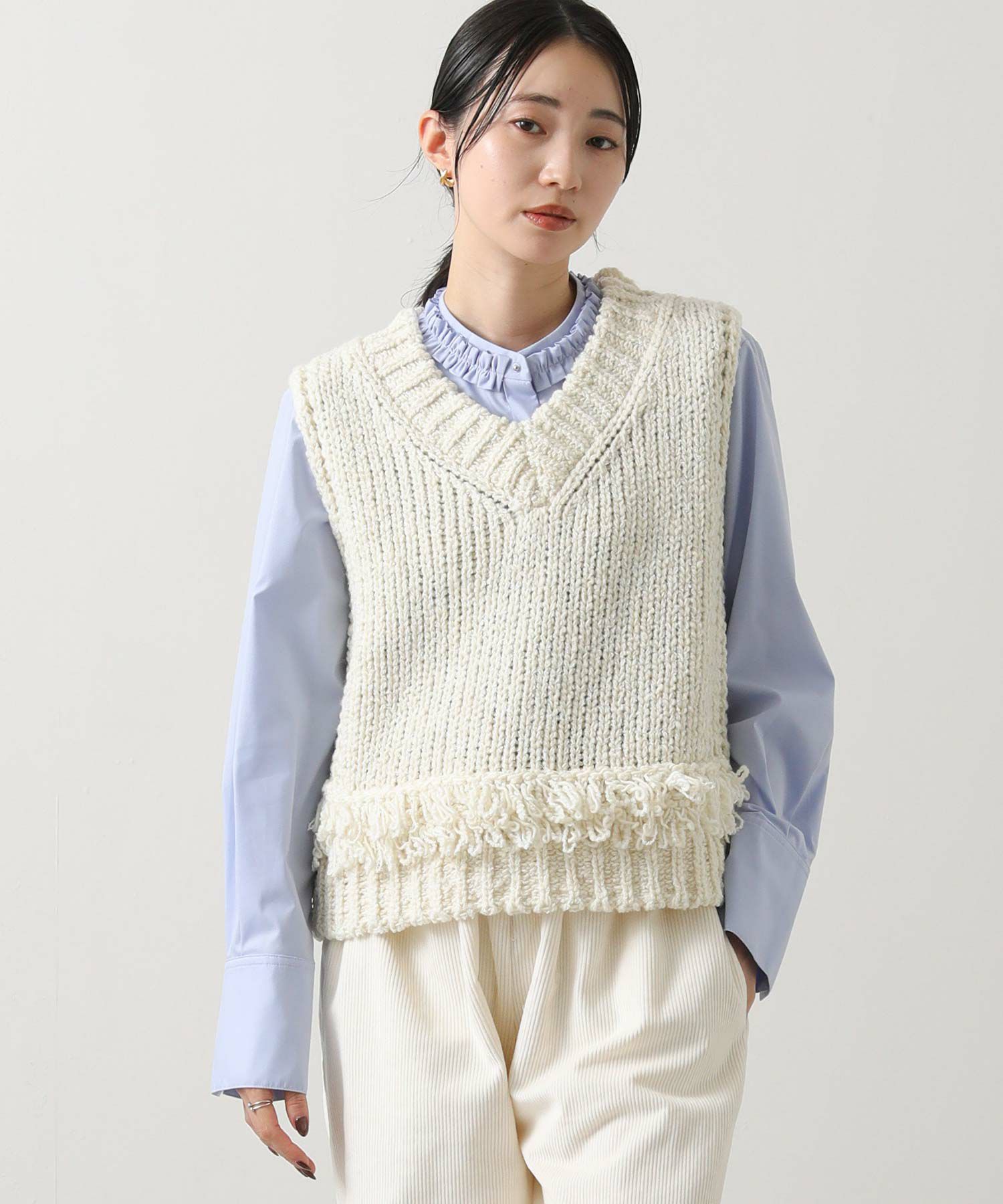 手編みのような立体感あるニットべストと畝の大きいコーデュロイパンツとを組み合わせた、唯一無二のデザイン。