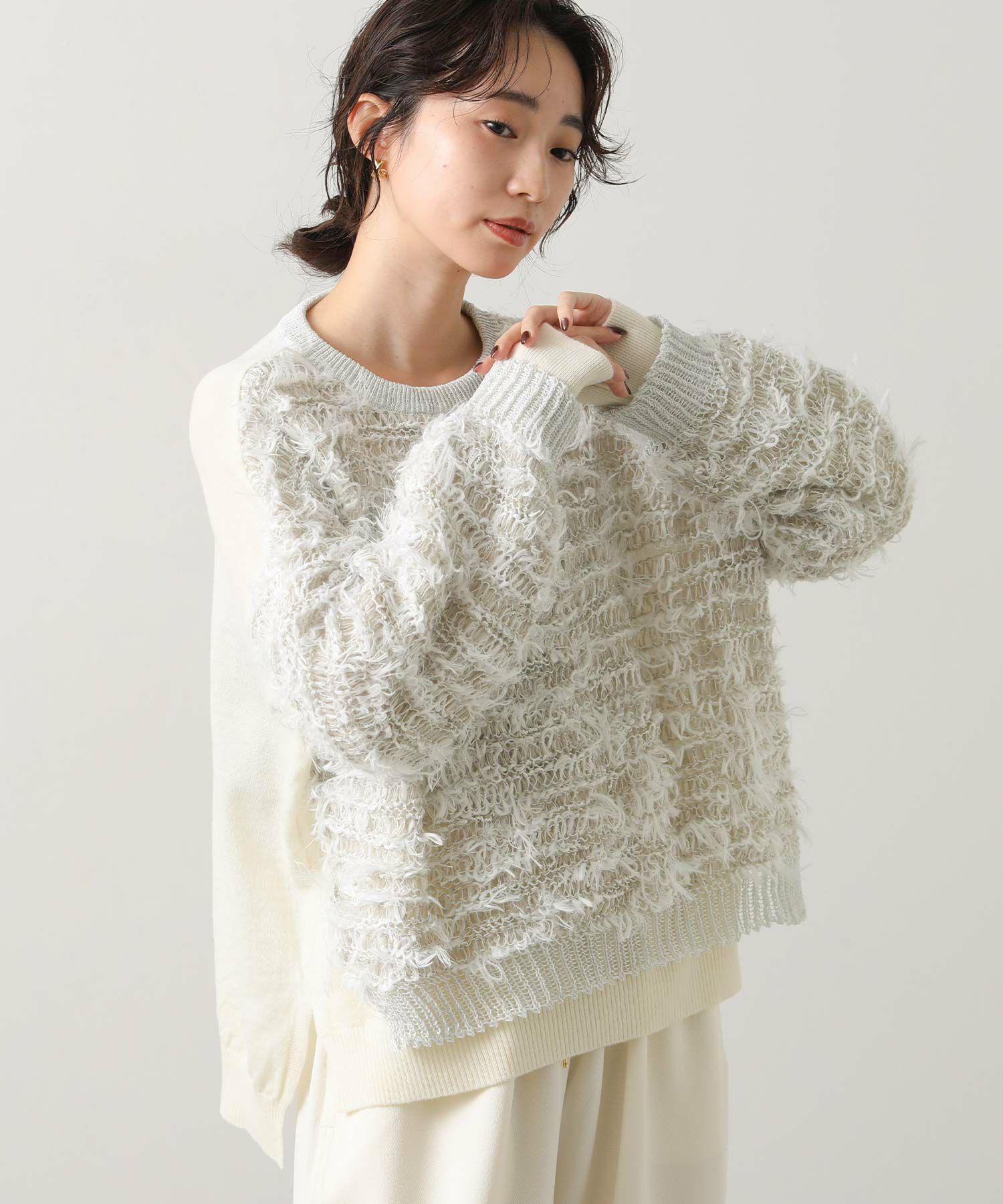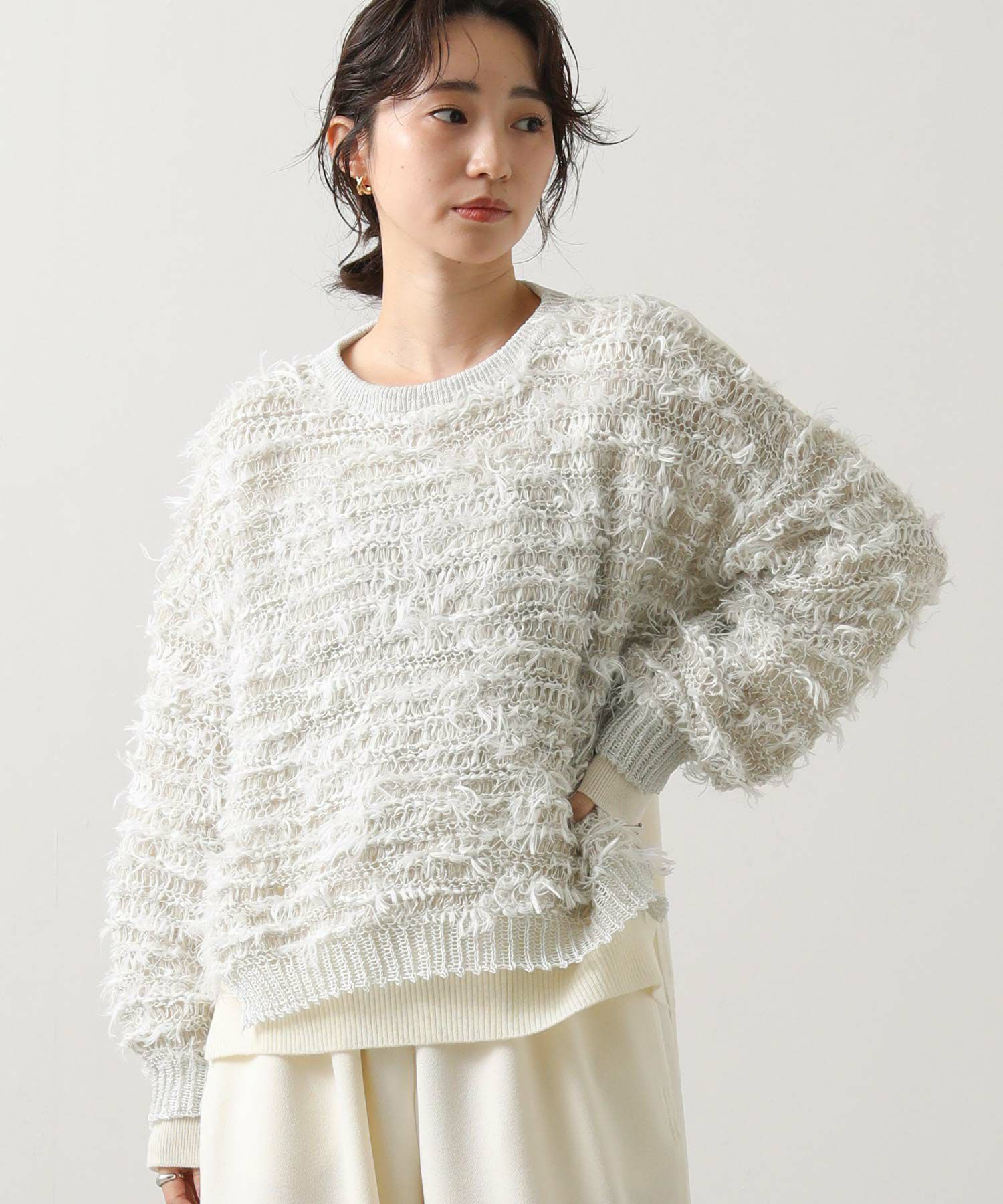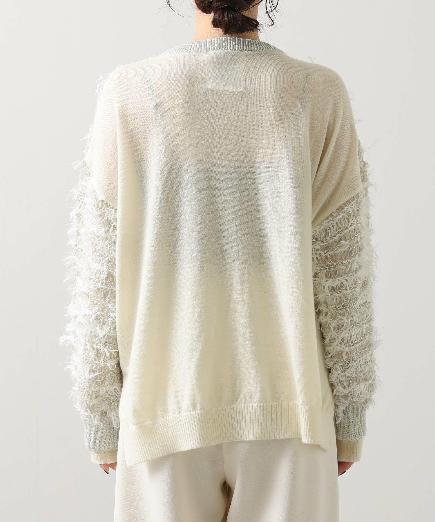 レーシーで透け感のある裾に、袖口とネック部分はラメコイルヤーンを効かせ、ヴィンテージライクな光沢とさりげない煌めきで上品なアクセントをプラス。