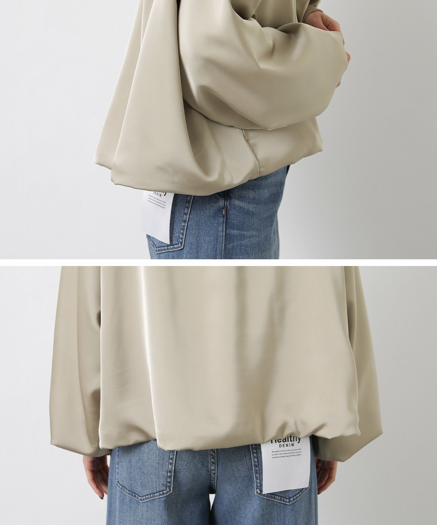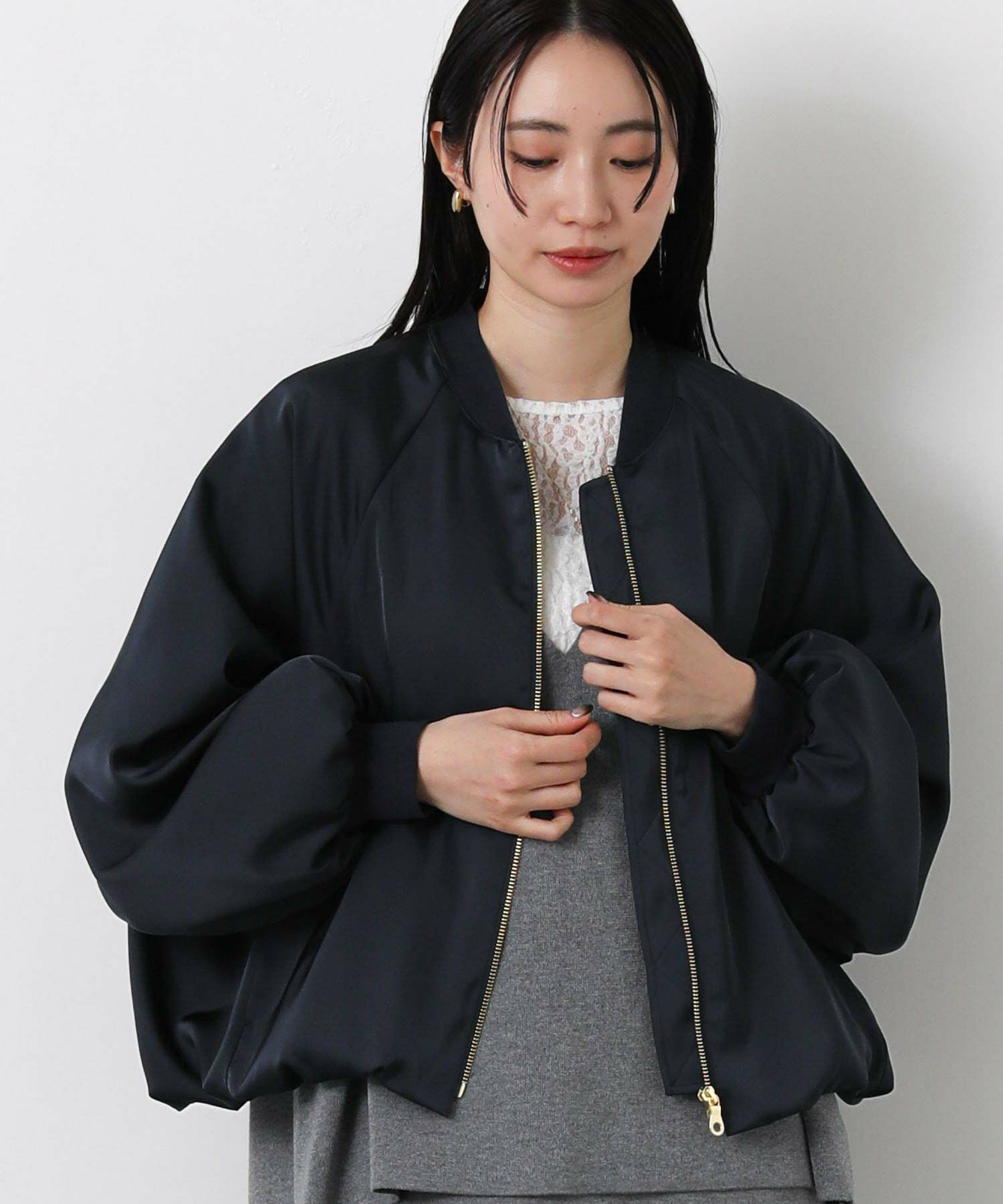 なめらかな微光沢感が美しいサテン素材を使用したブルゾン。