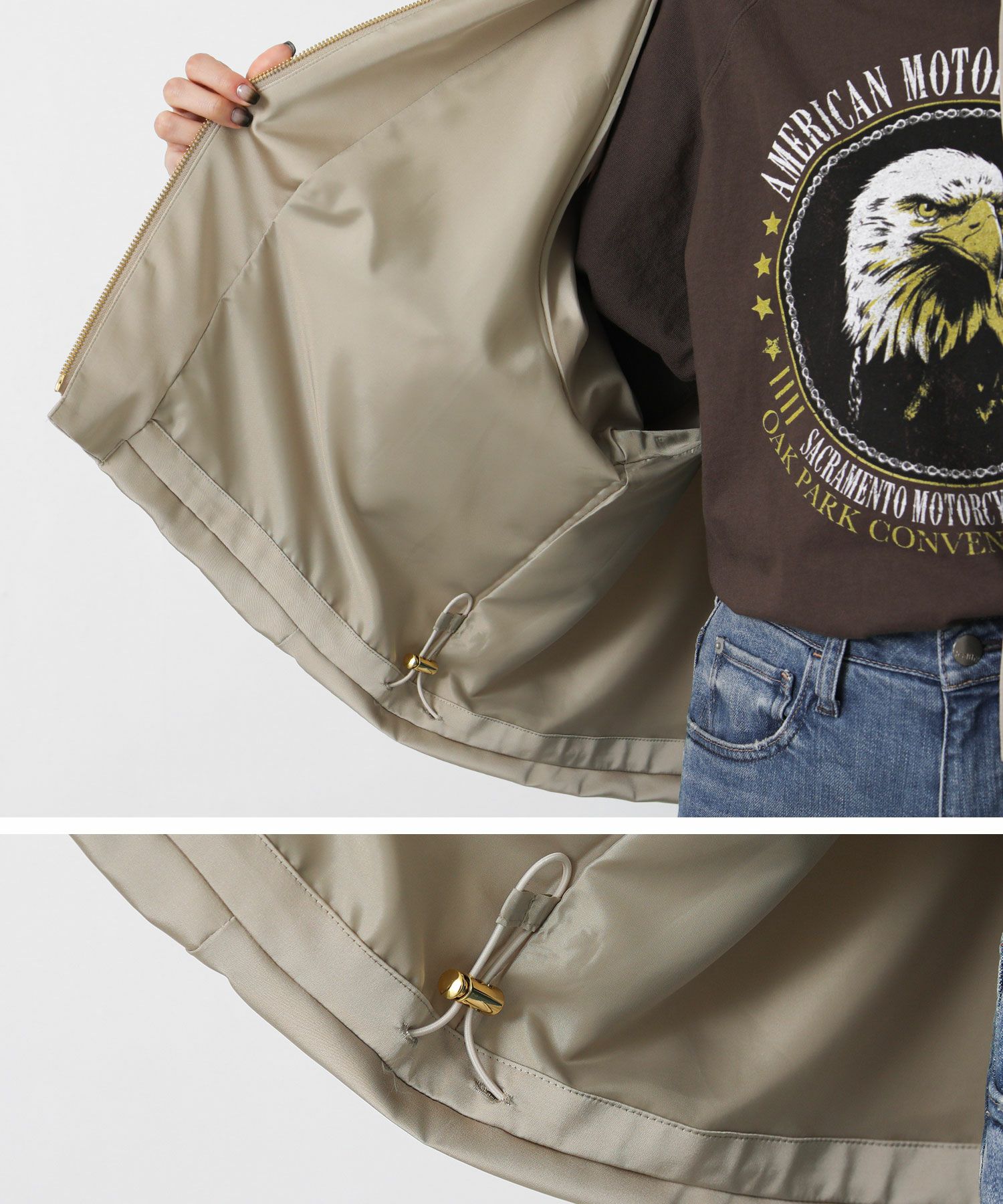裾はリブ仕様ではなく紐でシルエットを調節できるデザイン。