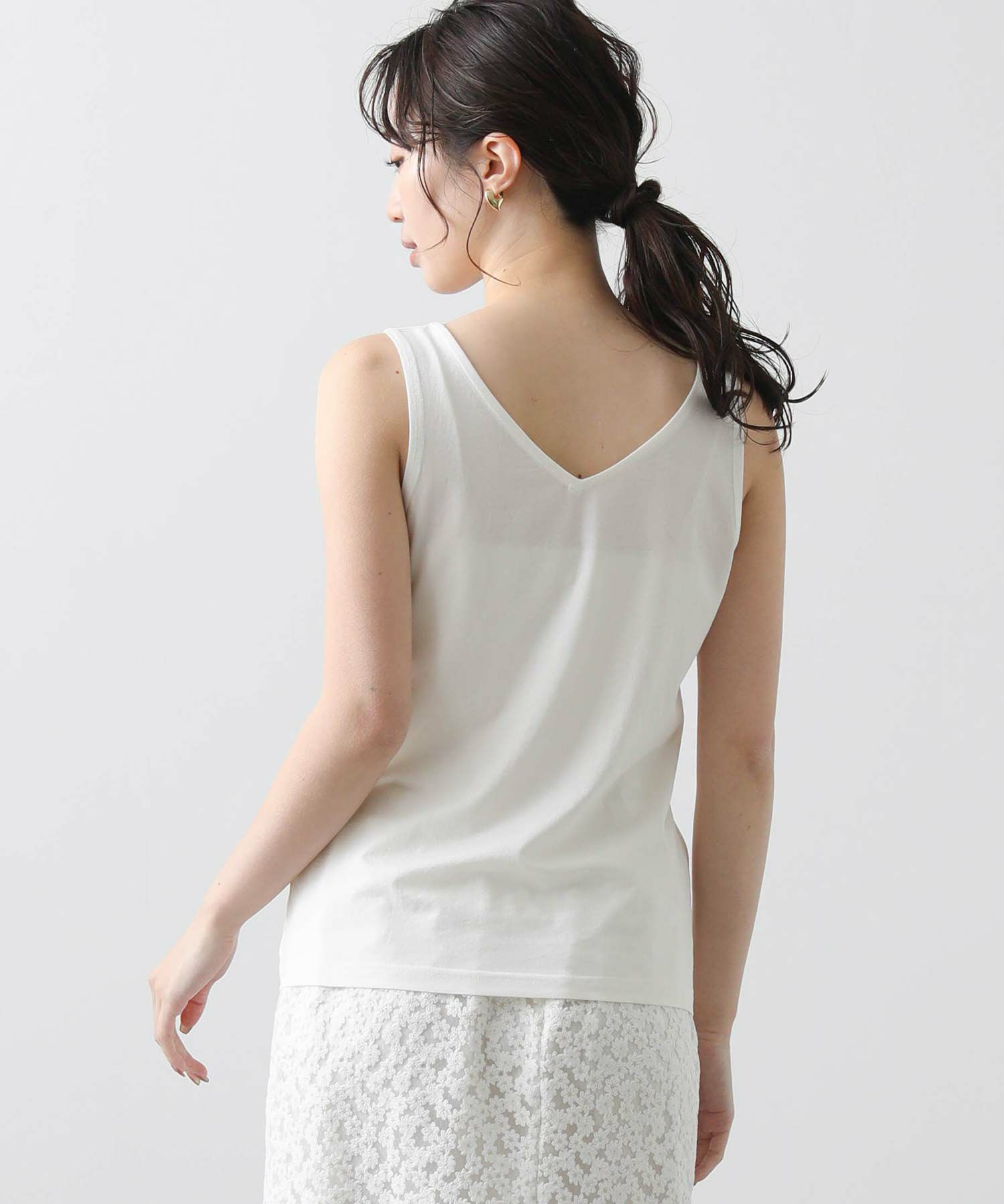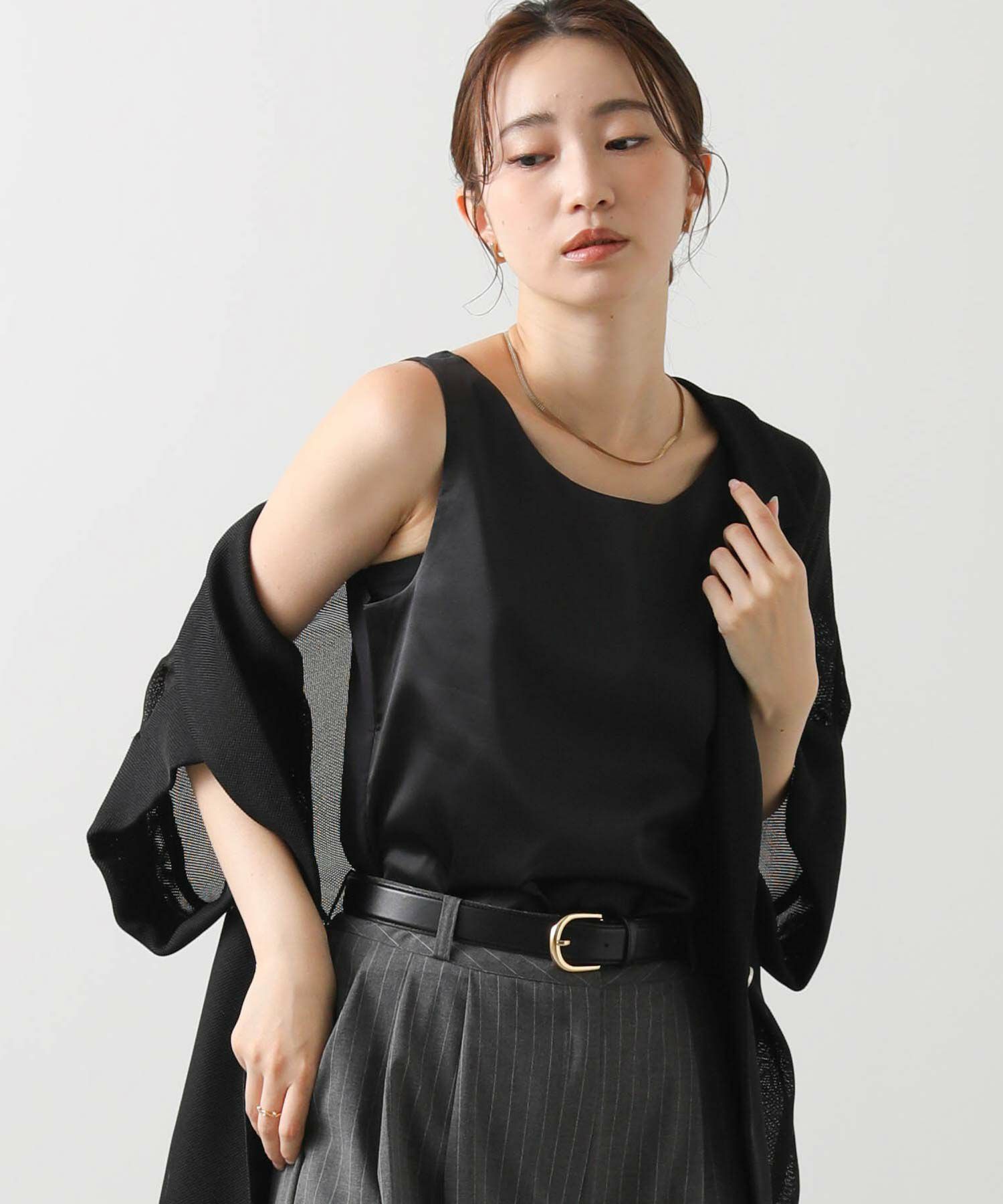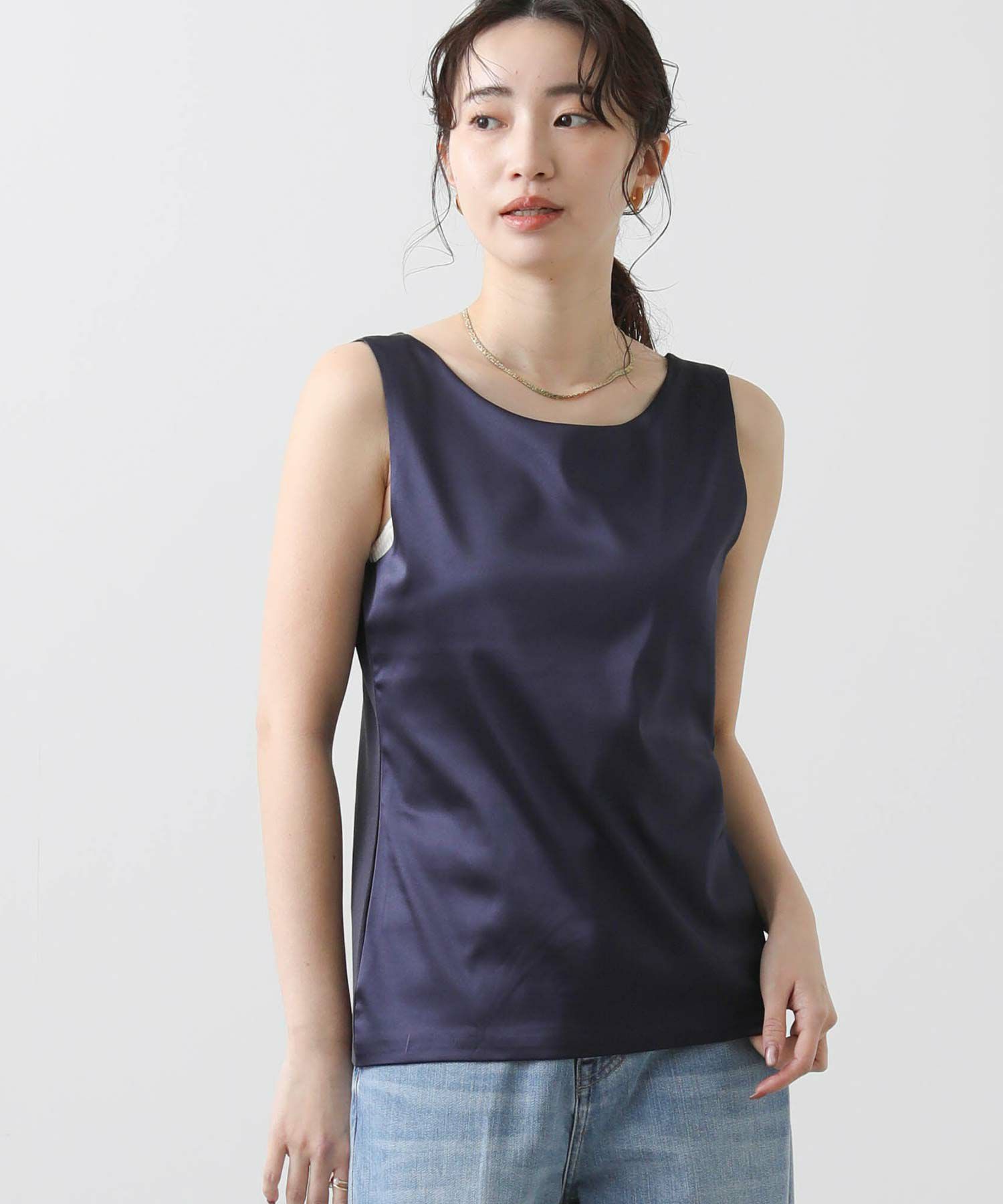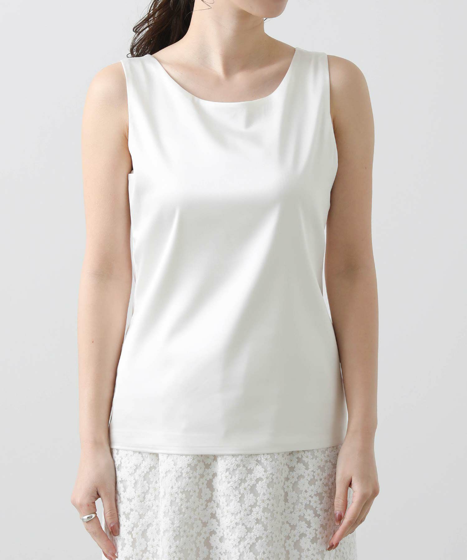 洗練された光沢感と機能性を兼ね備えた大人の女性のためのタンクトップ。 程よい艶感のあるストレッチサテン素材を使用し、女性らしい印象を演出しながらも動きやすさをしっかり確保。