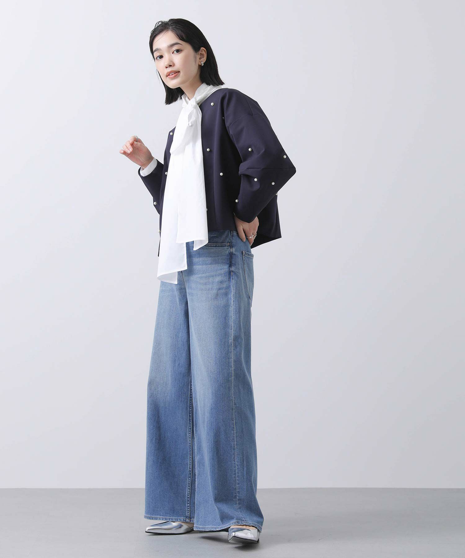 フェイクパールを贅沢にあしらったノーカラージャケット。