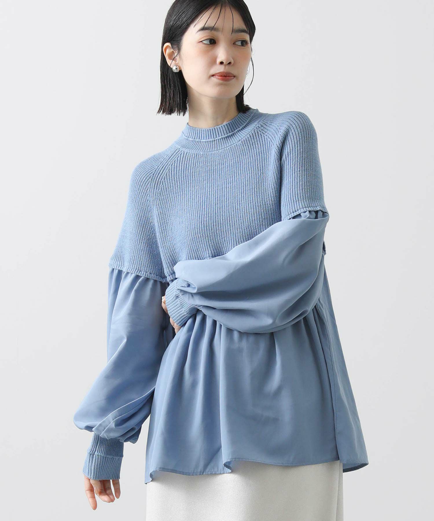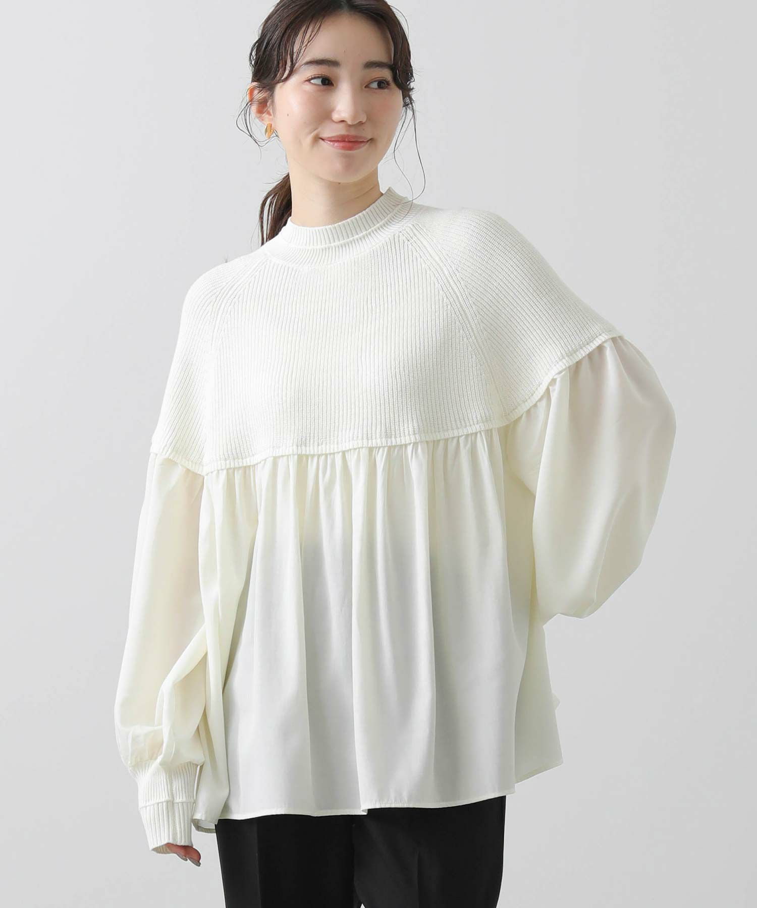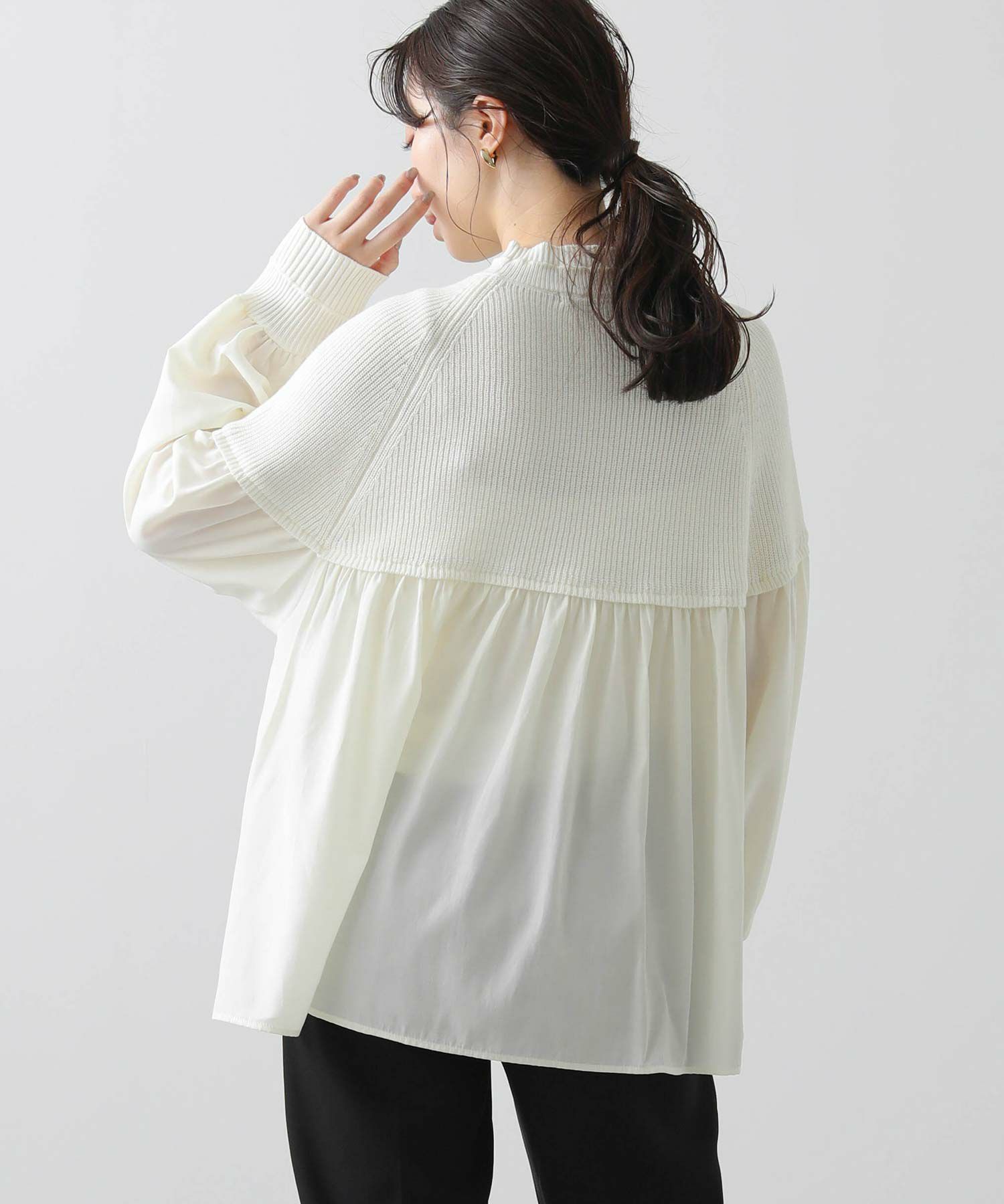 柔らかいニットとブラウス生地のドッキングニットは、どちらも柔らかく肌触りの良い素材で着心地も◎合わせるボトム次第でキレイ目にもカジュアルにも着回せる1枚で、シンプルながら存在感のあるアイテムです。