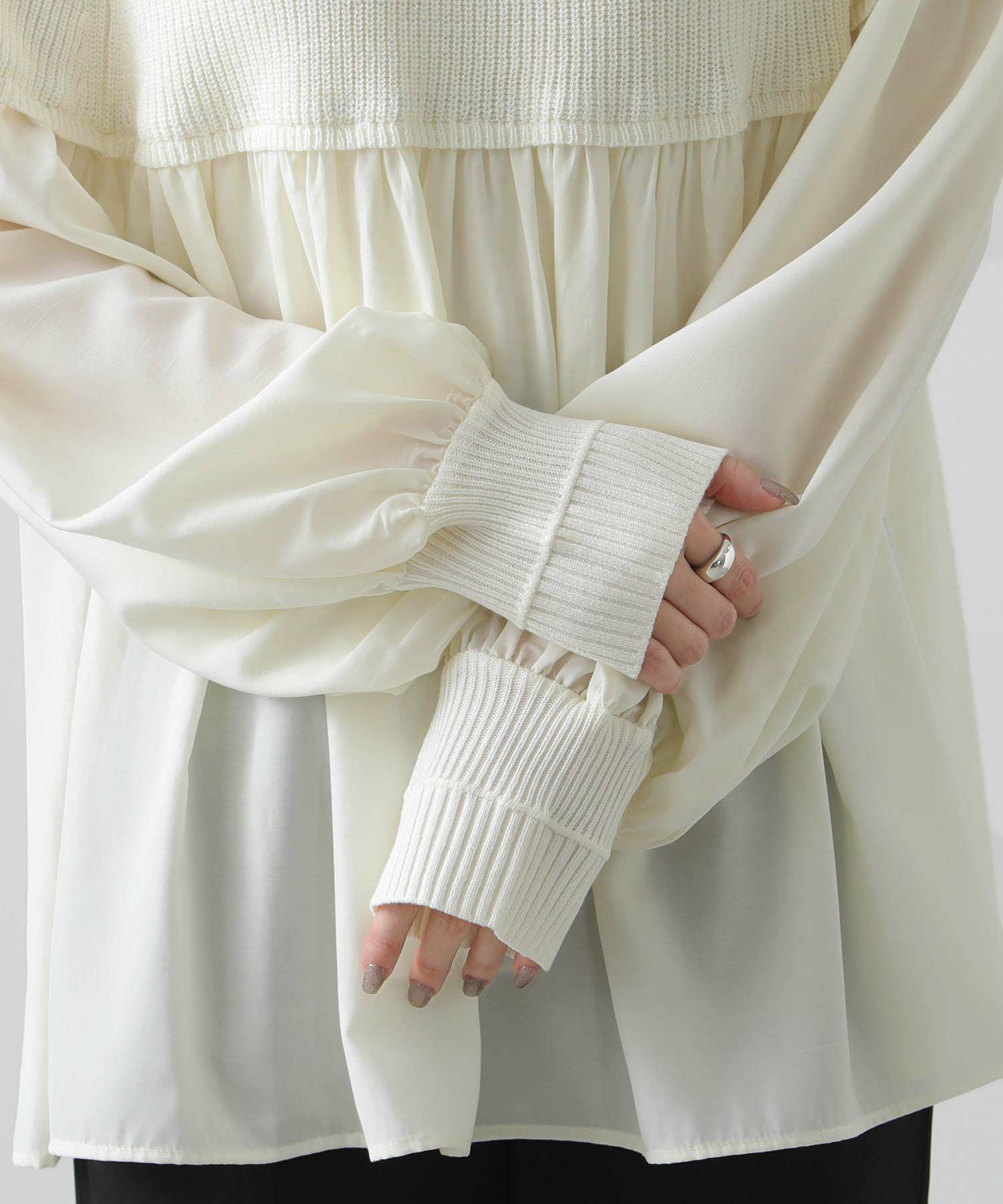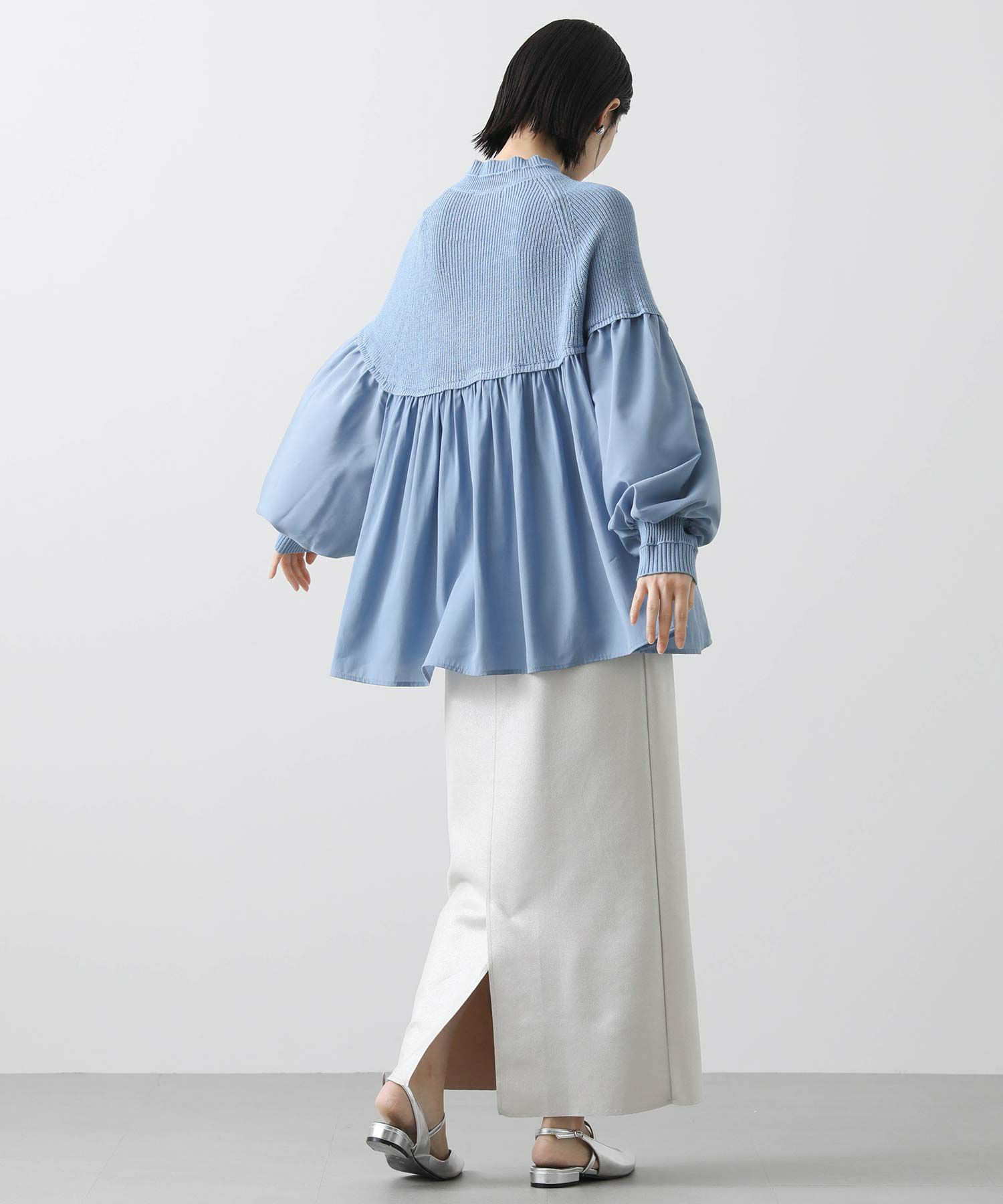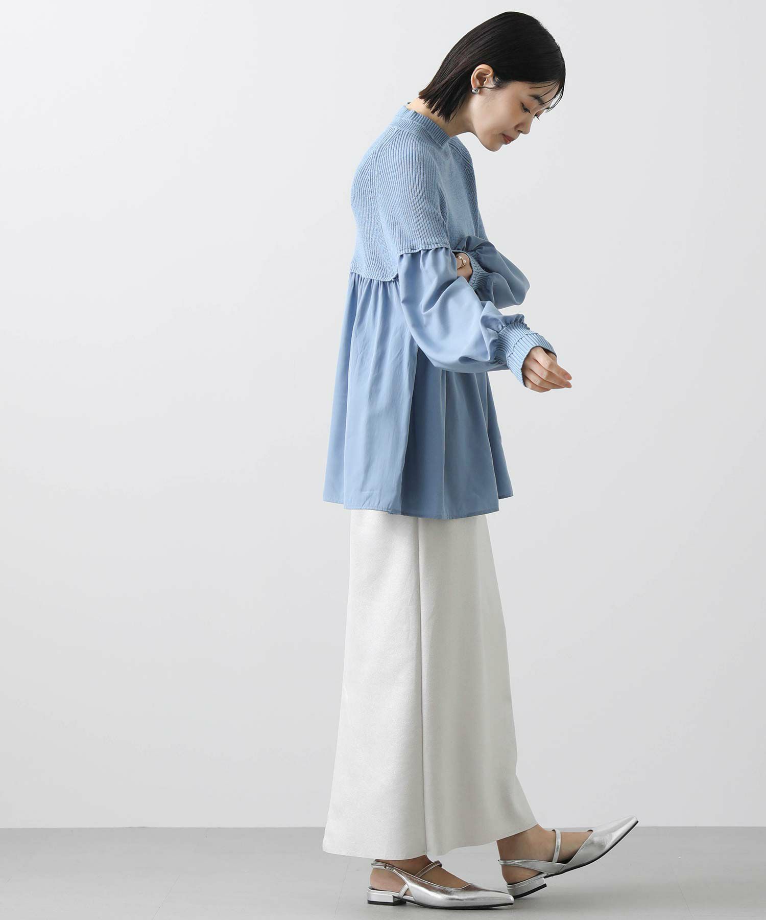 柔らかいニットとブラウス生地のドッキングニットは、どちらも柔らかく肌触りの良い素材で着心地も◎合わせるボトム次第でキレイ目にもカジュアルにも着回せる1枚で、シンプルながら存在感のあるアイテムです。