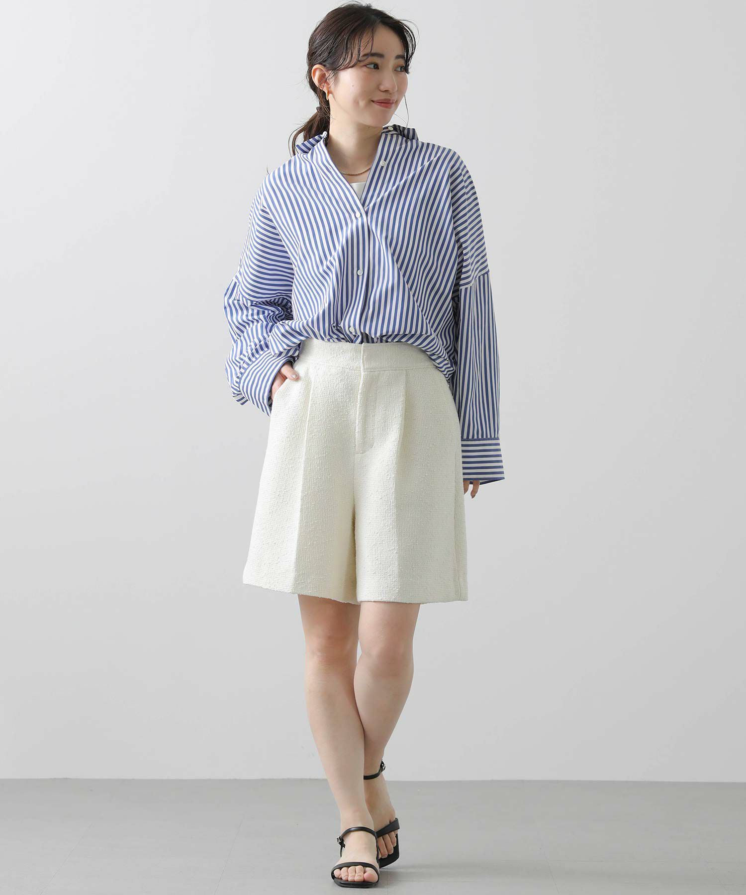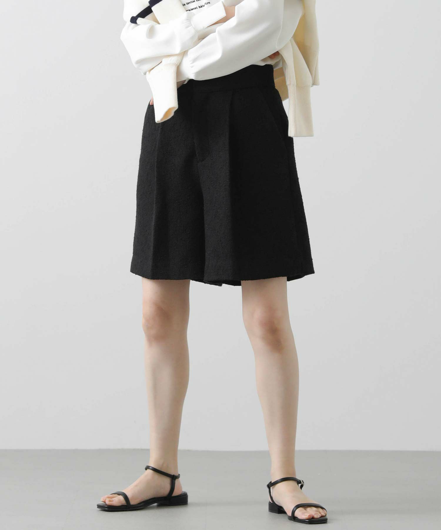 同素材のツイードブルゾン(OEO1034402006)を合わせたセットアップスタイルや、ロングブーツを合わせることで今っぽいスタイリングに仕上がります。