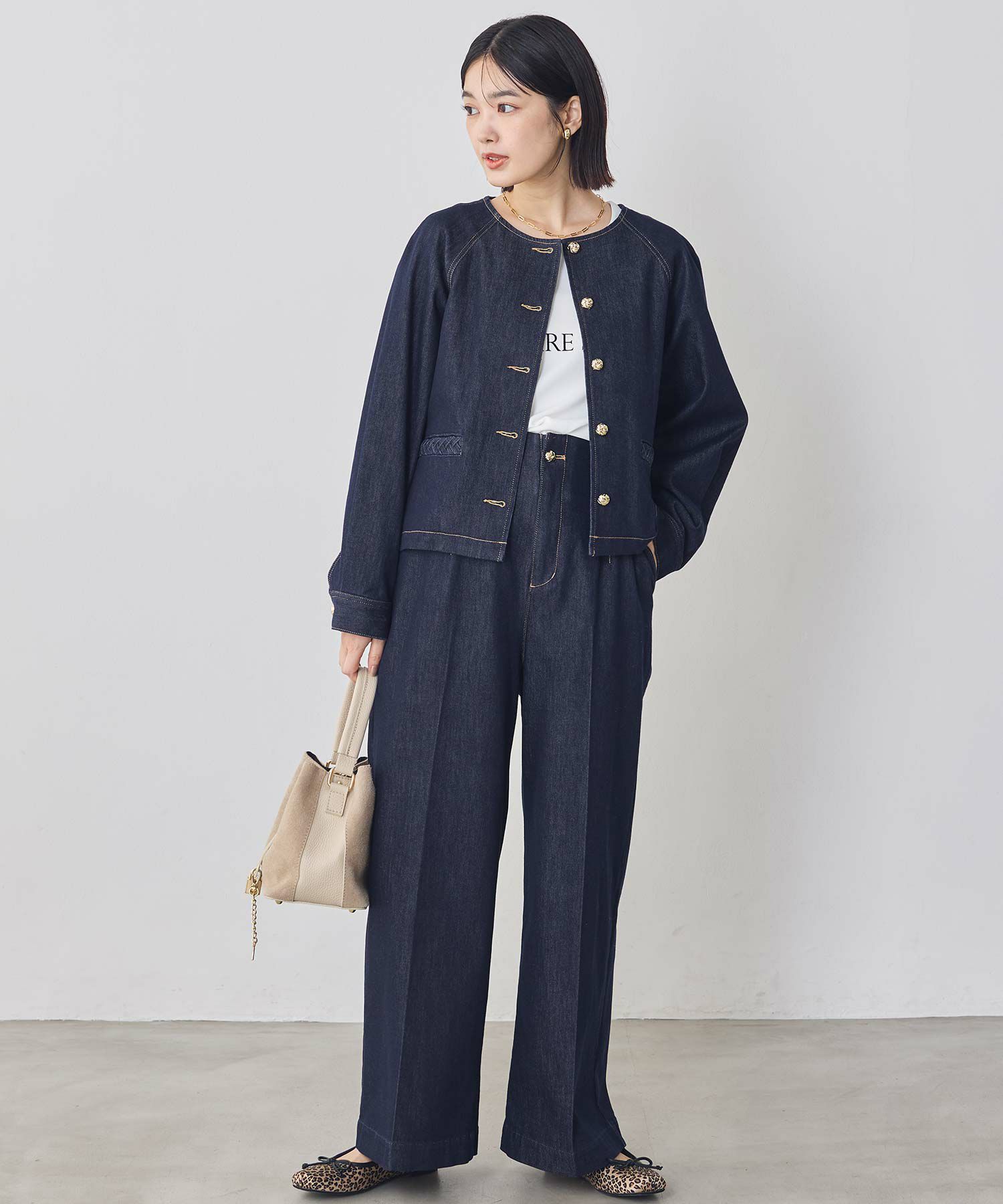 同素材のLUクルーデニムジャケット(OEO1094422004)とセットアップでの着用もオススメ。