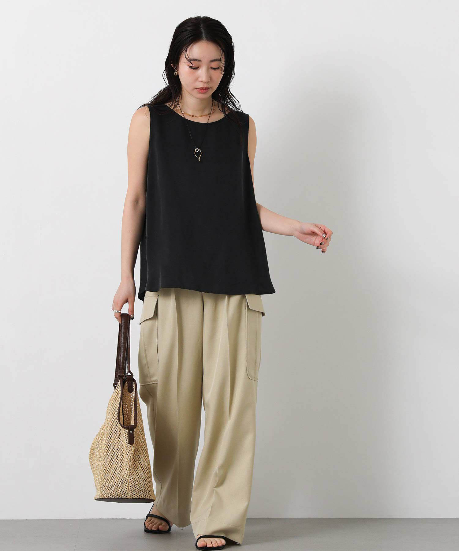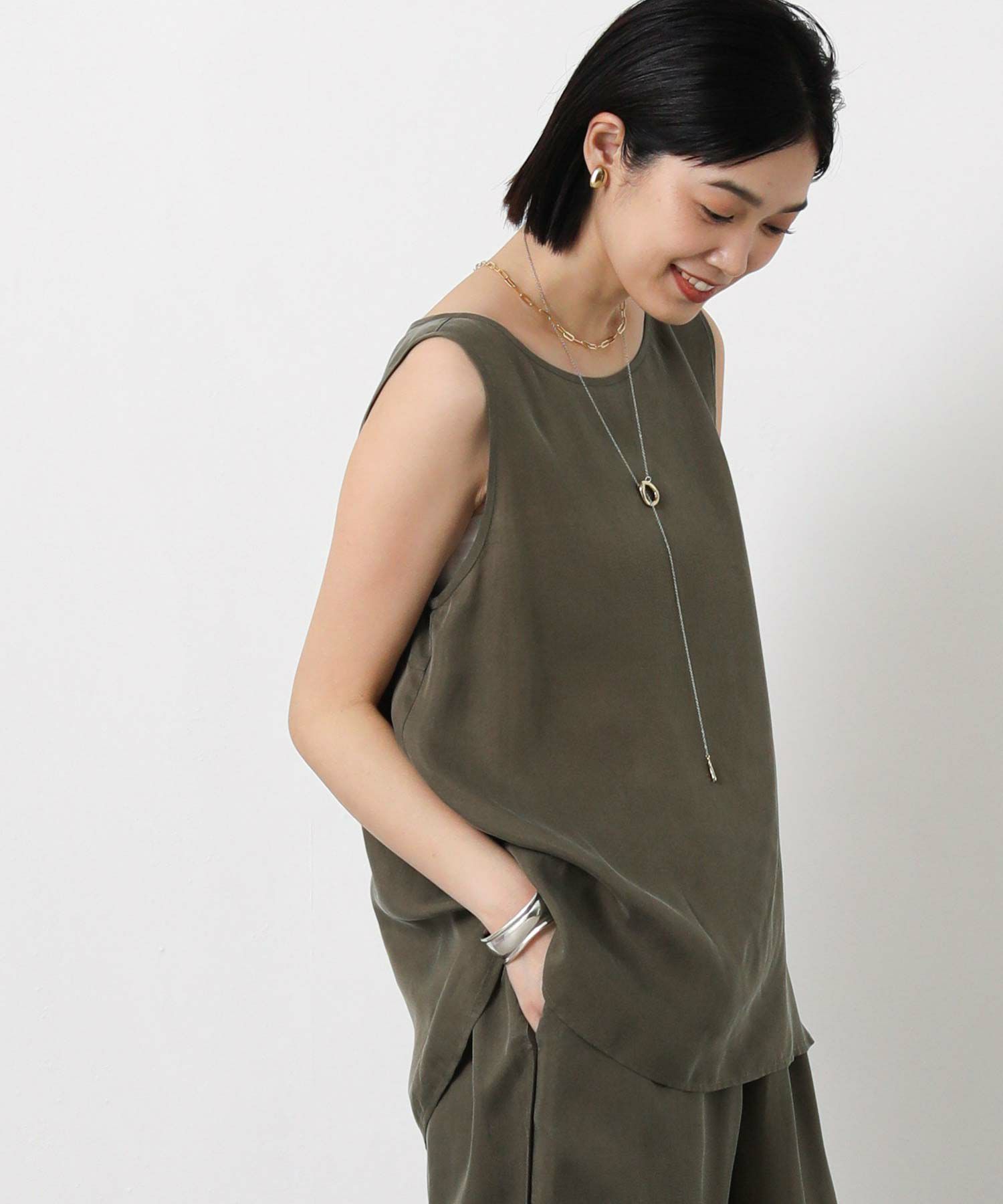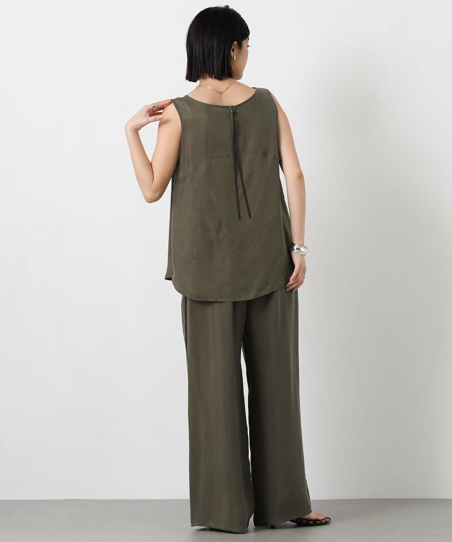 LUキュプラシャツ(OEO455424001)、LUキュプラセミワイド(OEO455426001)と素材感を合わせたセットアップでの着こなしがオススメ。